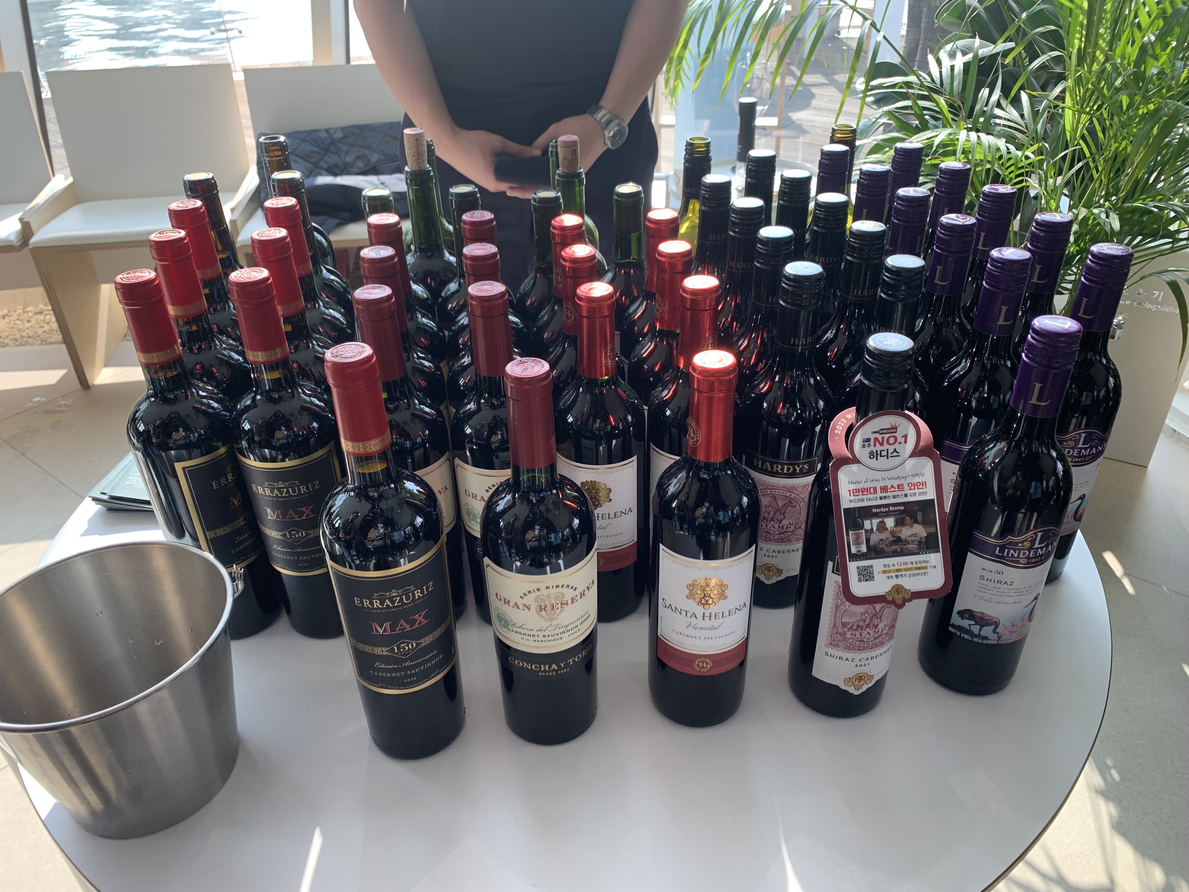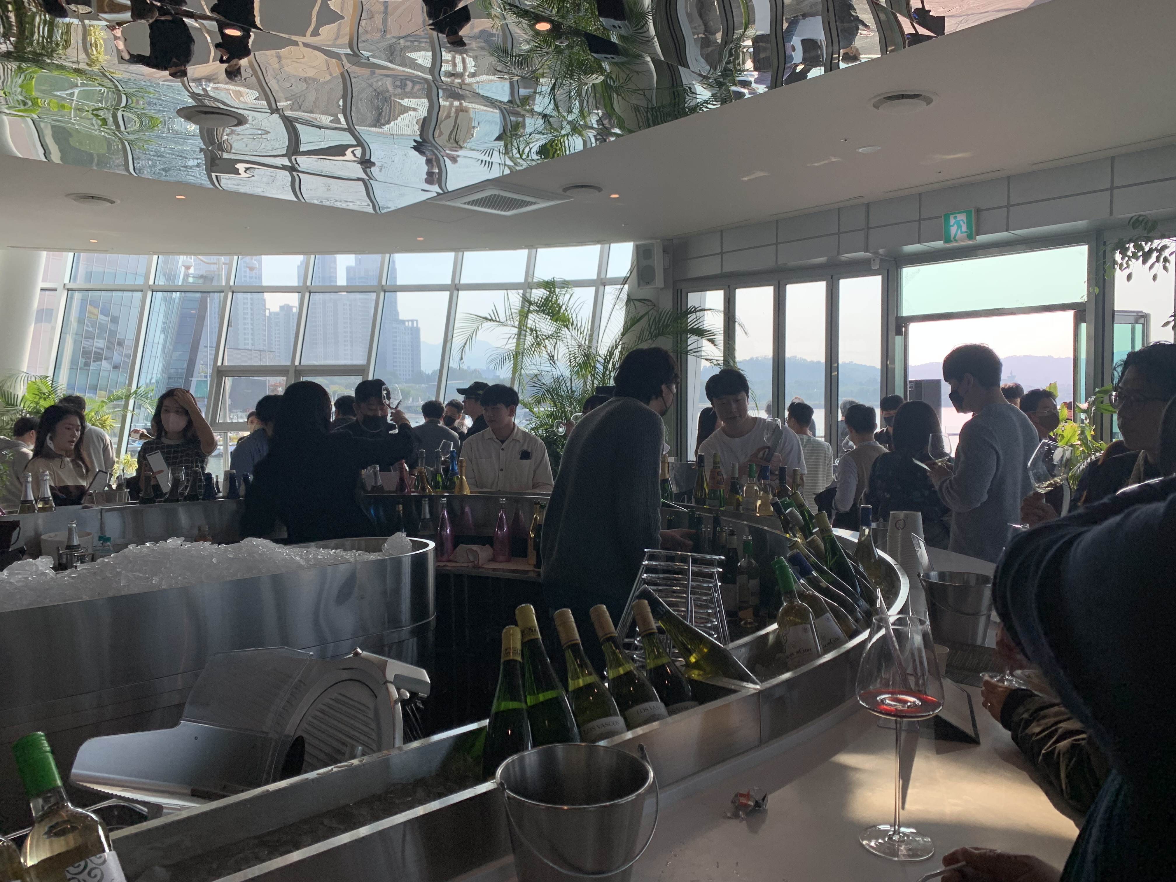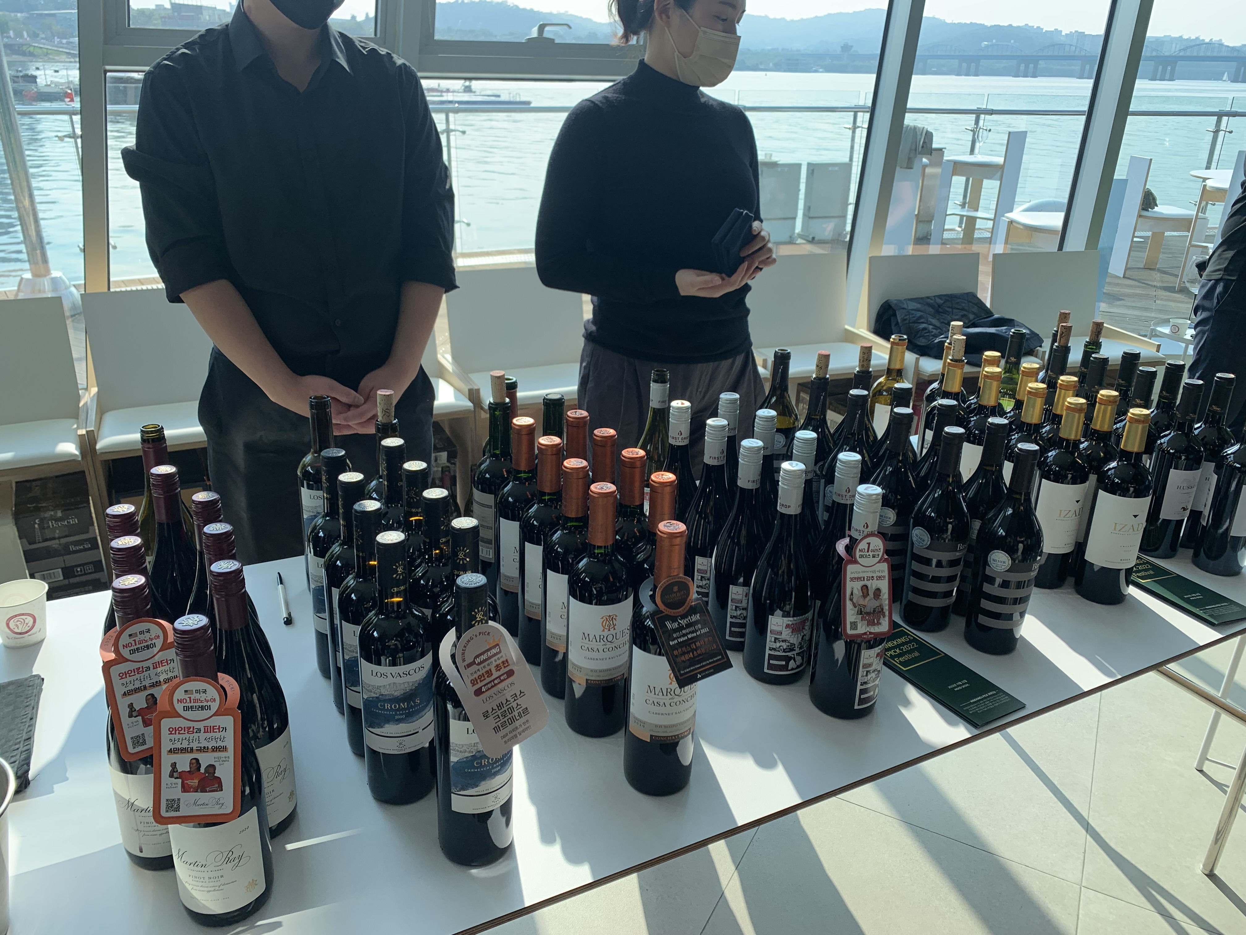 긴줄을 거쳐 행사장인 무드서울에 들어가니 라운드형 테이블에 가운데 와인들이 칠링되어 있고 원하는 와인을 시음하며 가볍게 음식까지 즐길수 있는 자리가 마련되어 있습니다. 최고의 와인 전문가 와인킹이 고른 41종의 와인을 맛보면서 한강의 분위기를 느끼면서 안주까지 즐길 수 있다니 보기만 해도 매우 설레는 자리가 아닐 수 없습니다.