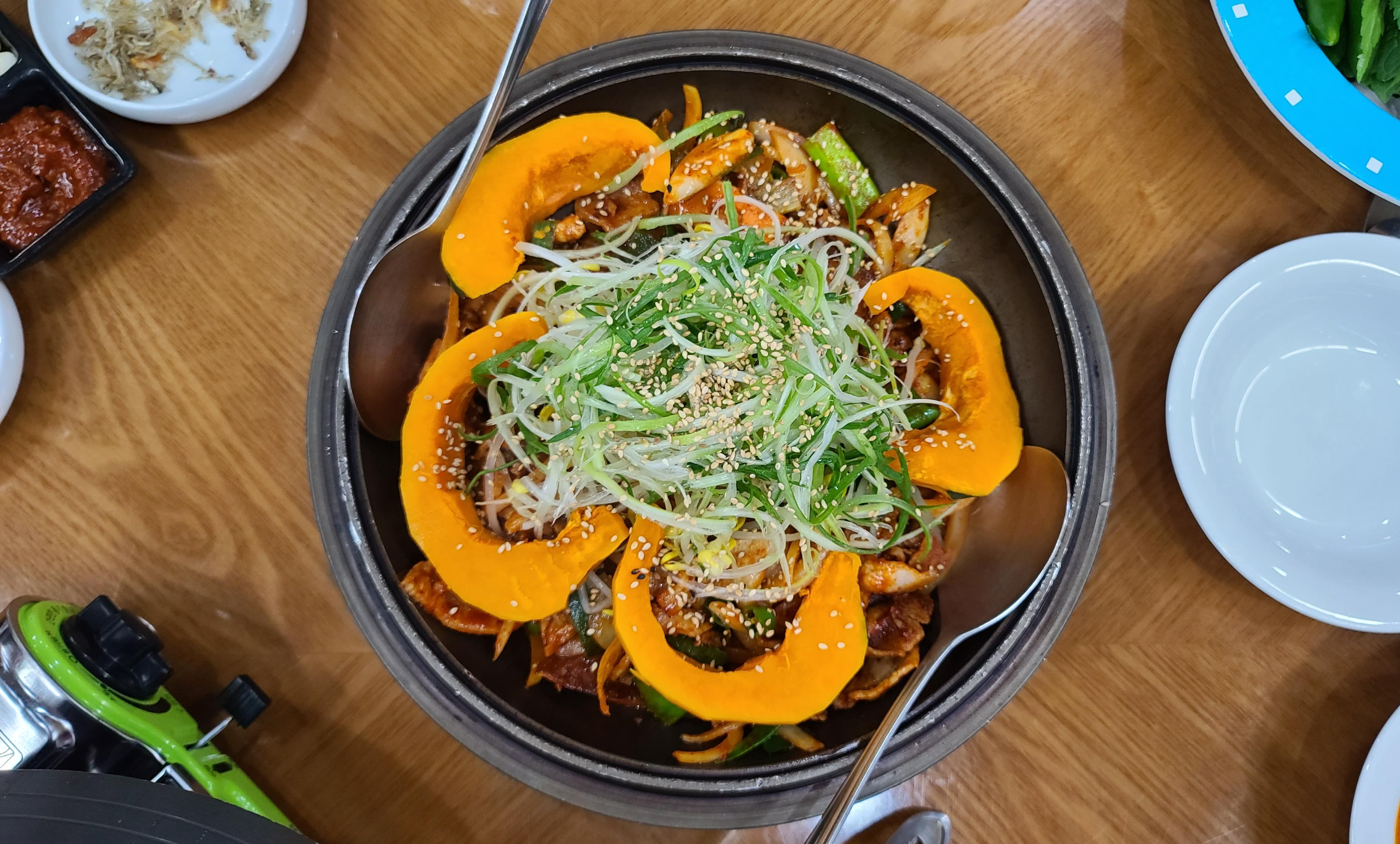 뒤이어 나온 흑돼지 두루치기의 비주얼을 담아봅니다. 맛있는 흑돼지에 단호박, 콩나물 그리고 파채가 어우러진 먹음직한 비주얼입니다.