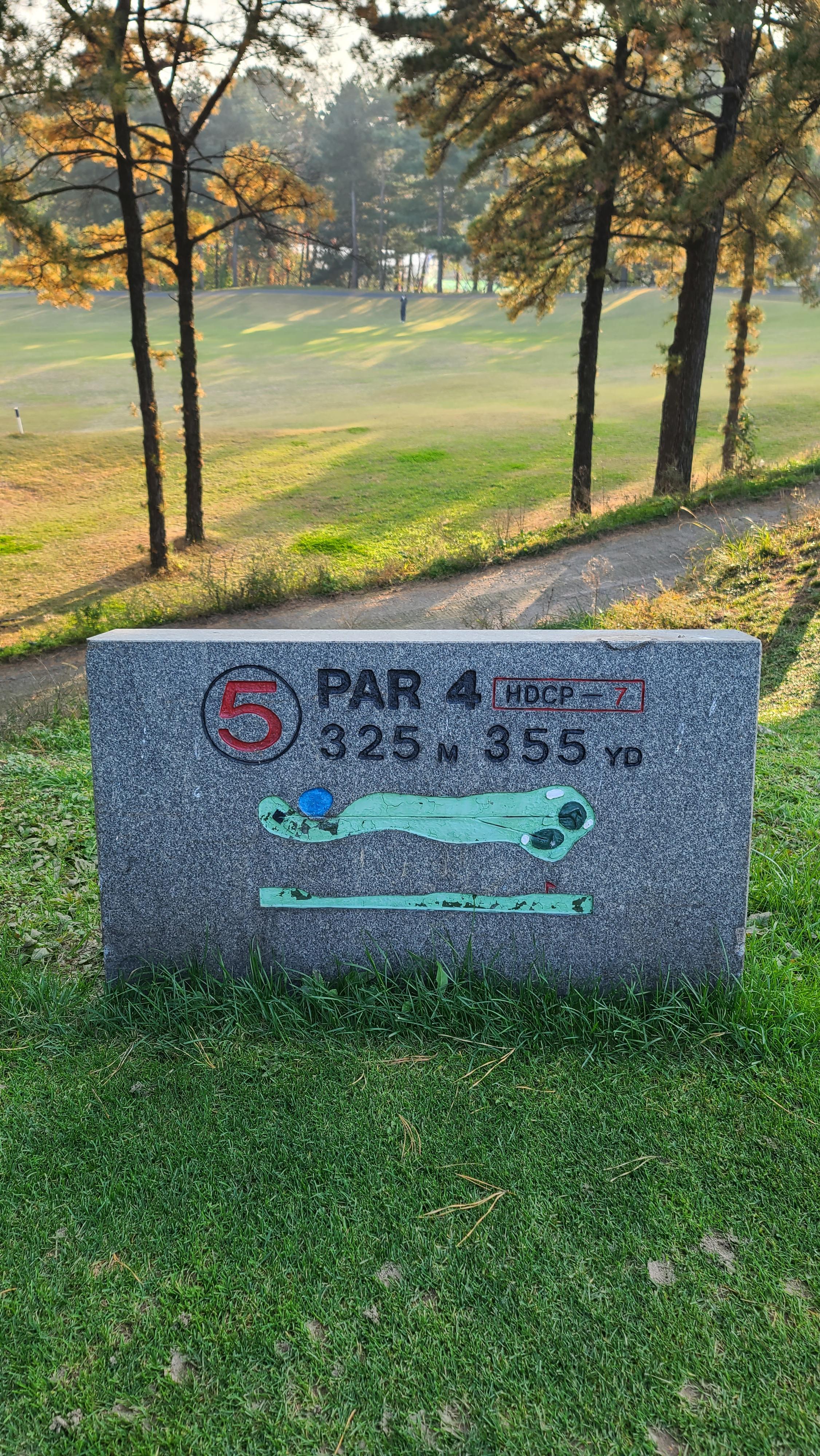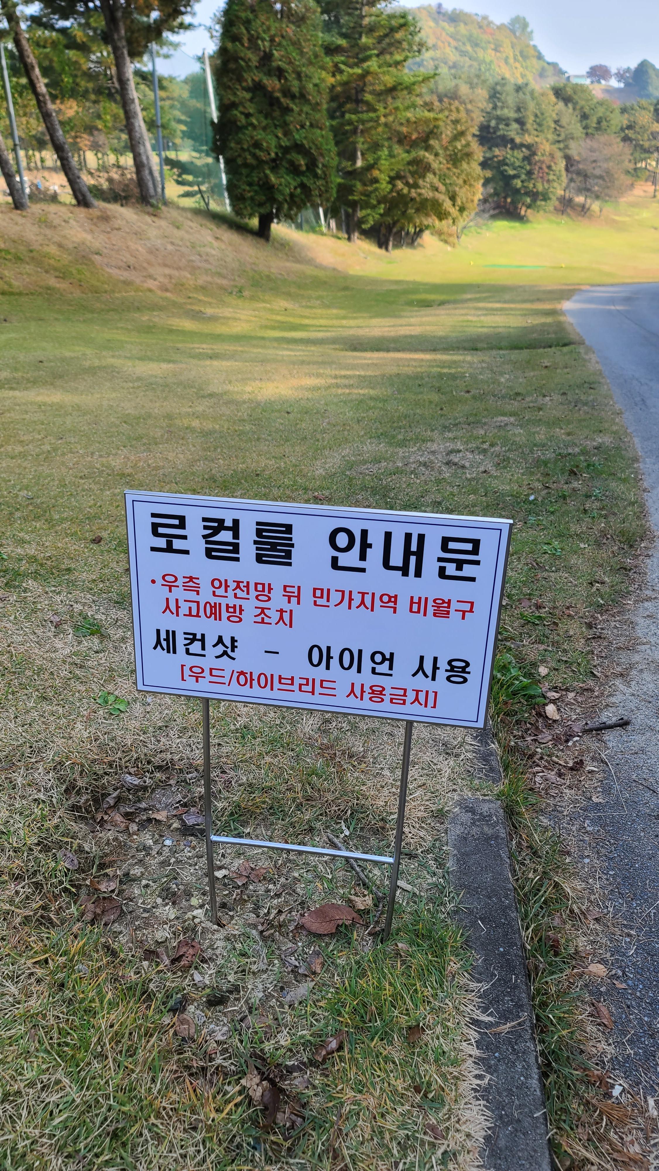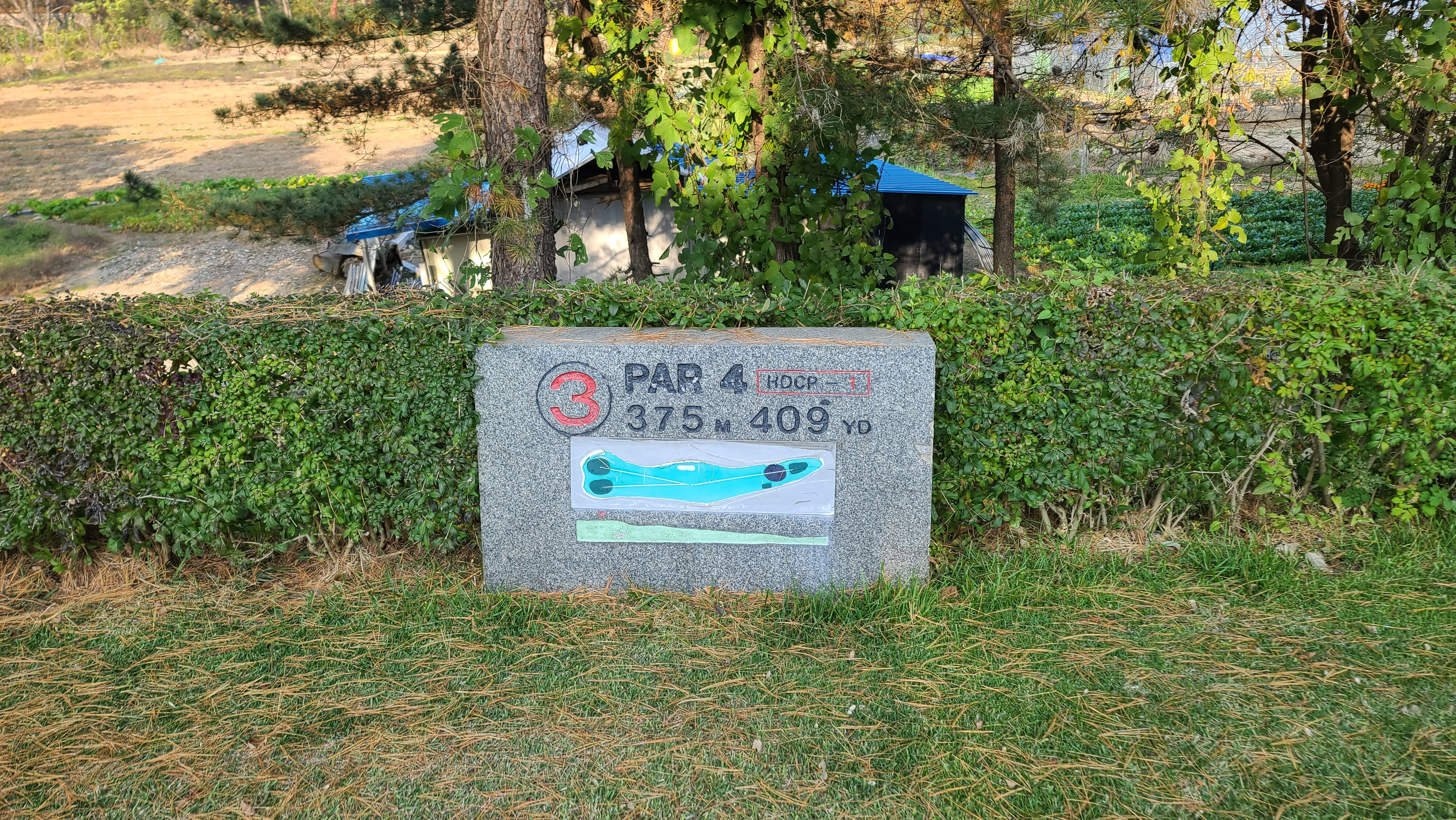 세컨샷 지점에서도 또한 우측 슬라이스 방향으로 민가가 위치해있기 때문에 안전사고 방지를 위하여 아이언 샷을 강제하는 로컬룰이 적용되어 있는 모습입니다. 투온이 가능한 거리라 아쉽긴 하지만 안전을 위하여 아이언을 이용 안정적인 3온 작전을 펼치게 됩니다.