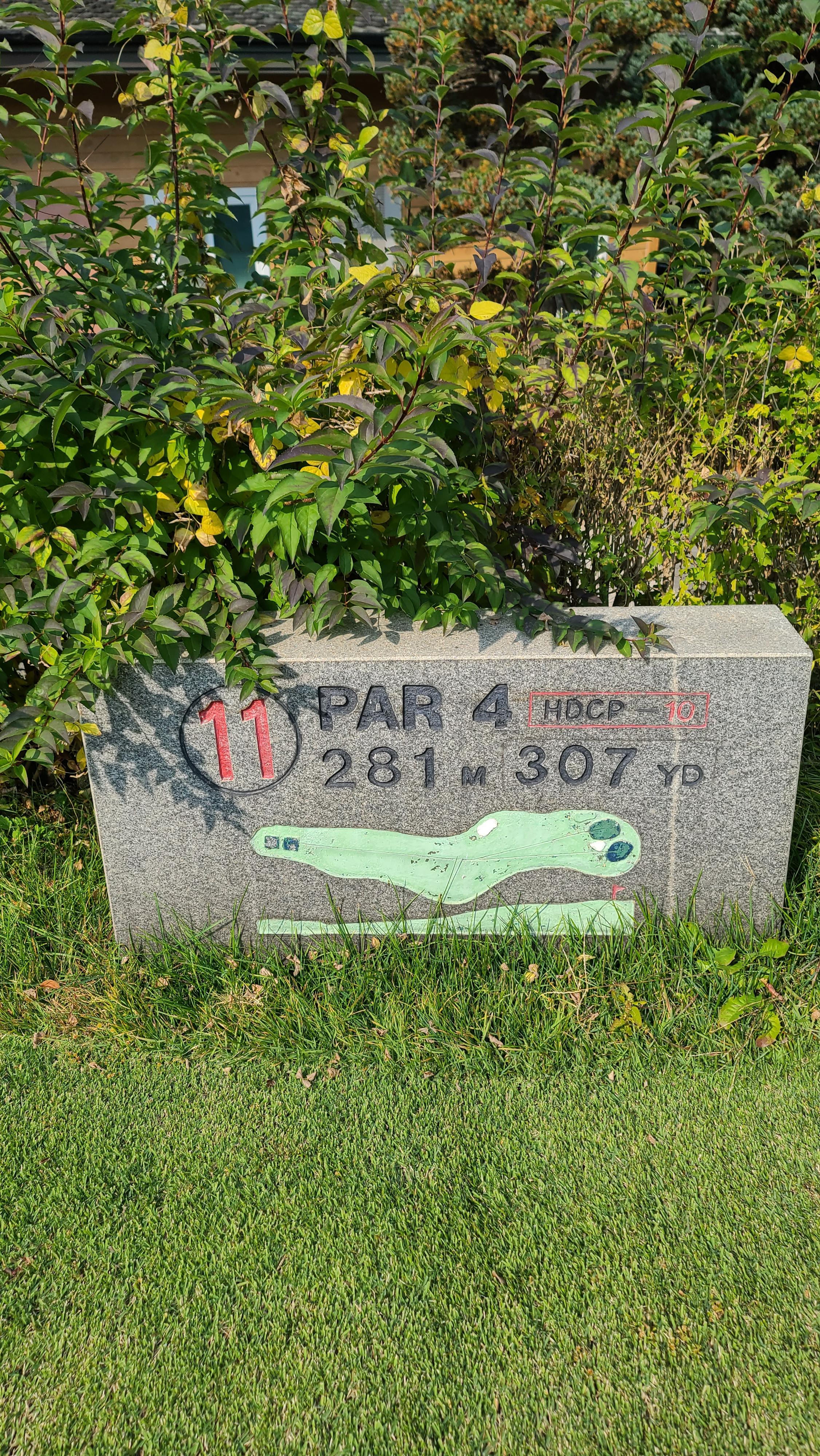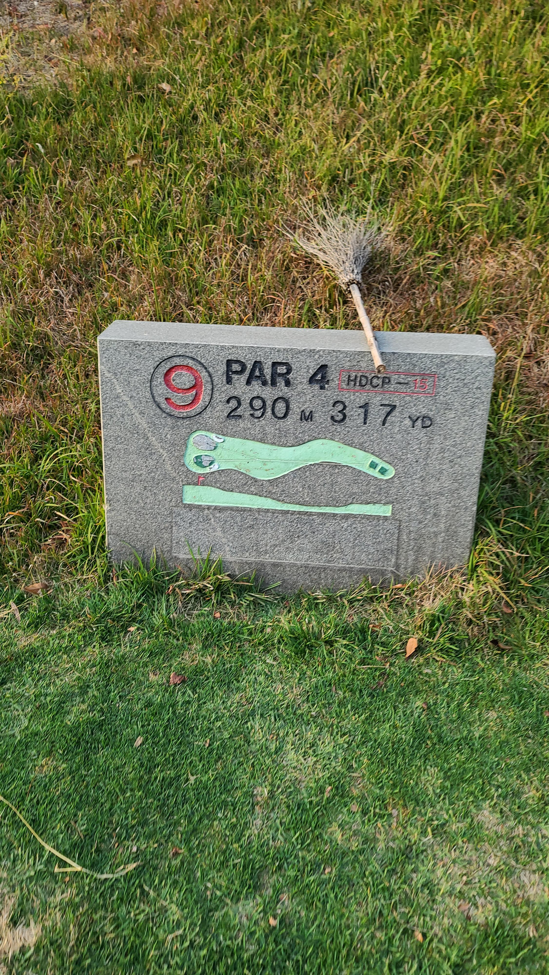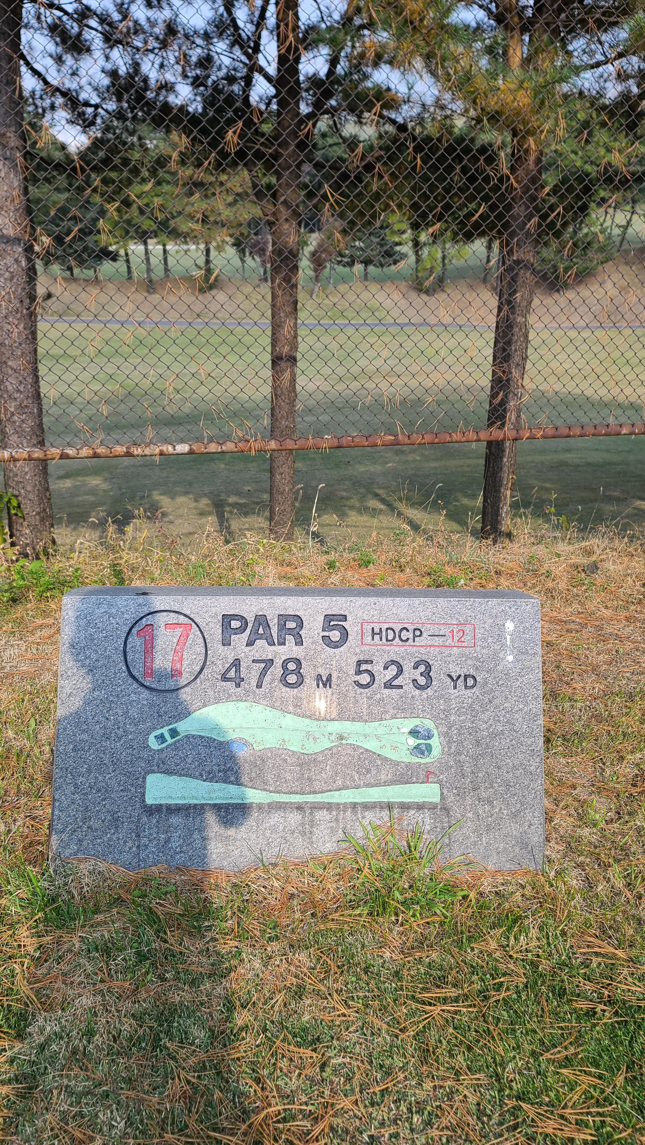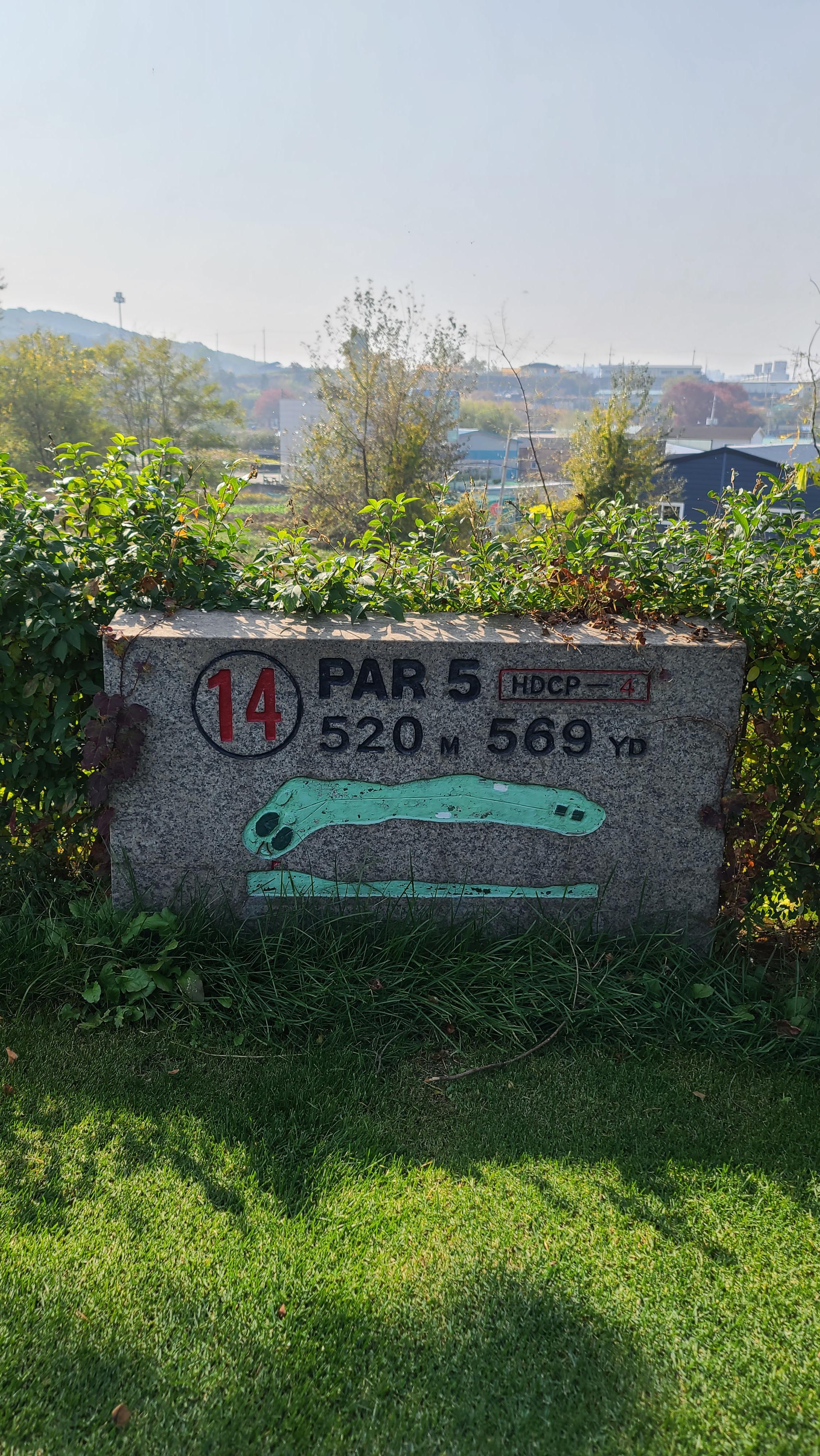 세컨샷 지점에서도 또한 우측 슬라이스 방향으로 민가가 위치해있기 때문에 안전사고 방지를 위하여 아이언 샷을 강제하는 로컬룰이 적용되어 있는 모습입니다. 투온이 가능한 거리라 아쉽긴 하지만 안전을 위하여 아이언을 이용 안정적인 3온 작전을 펼치게 됩니다.