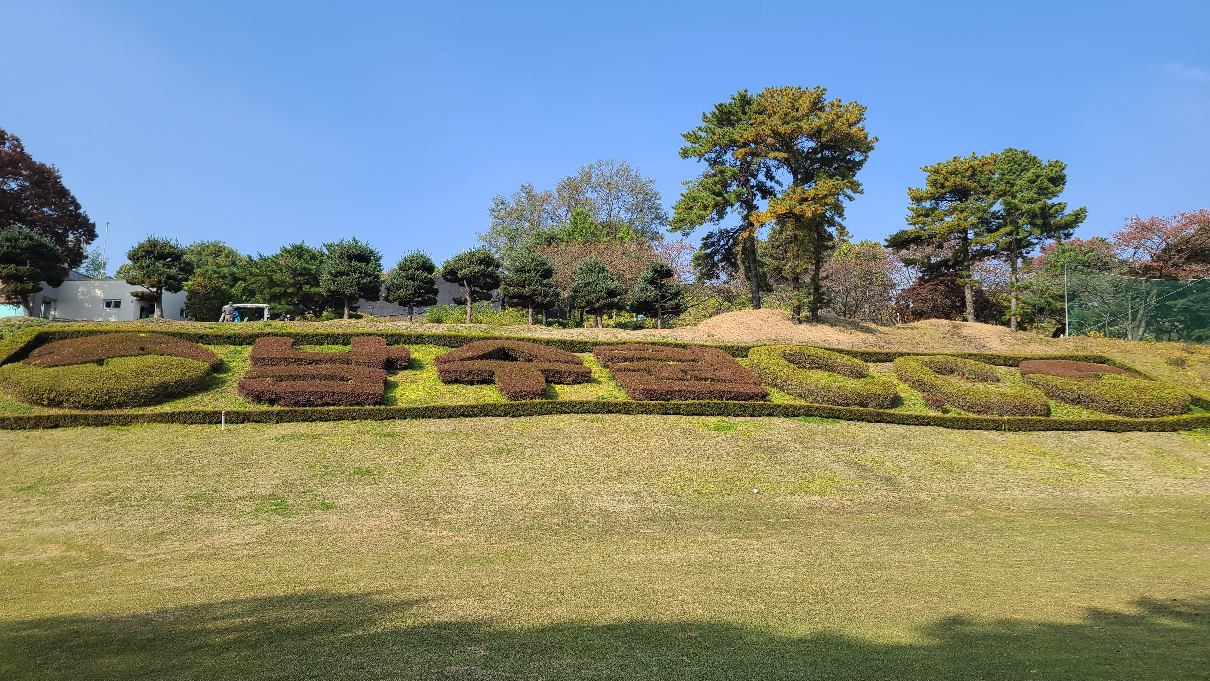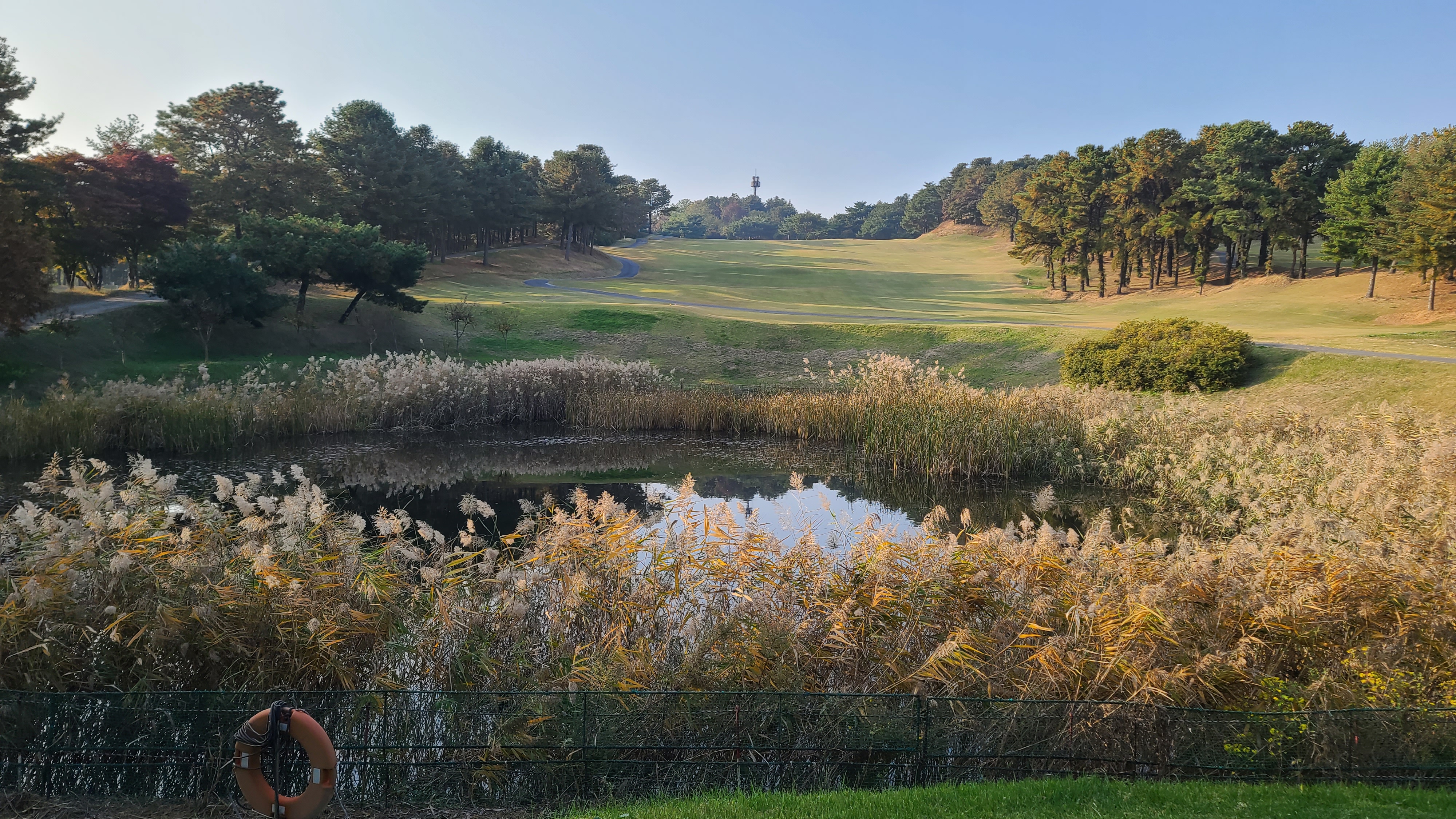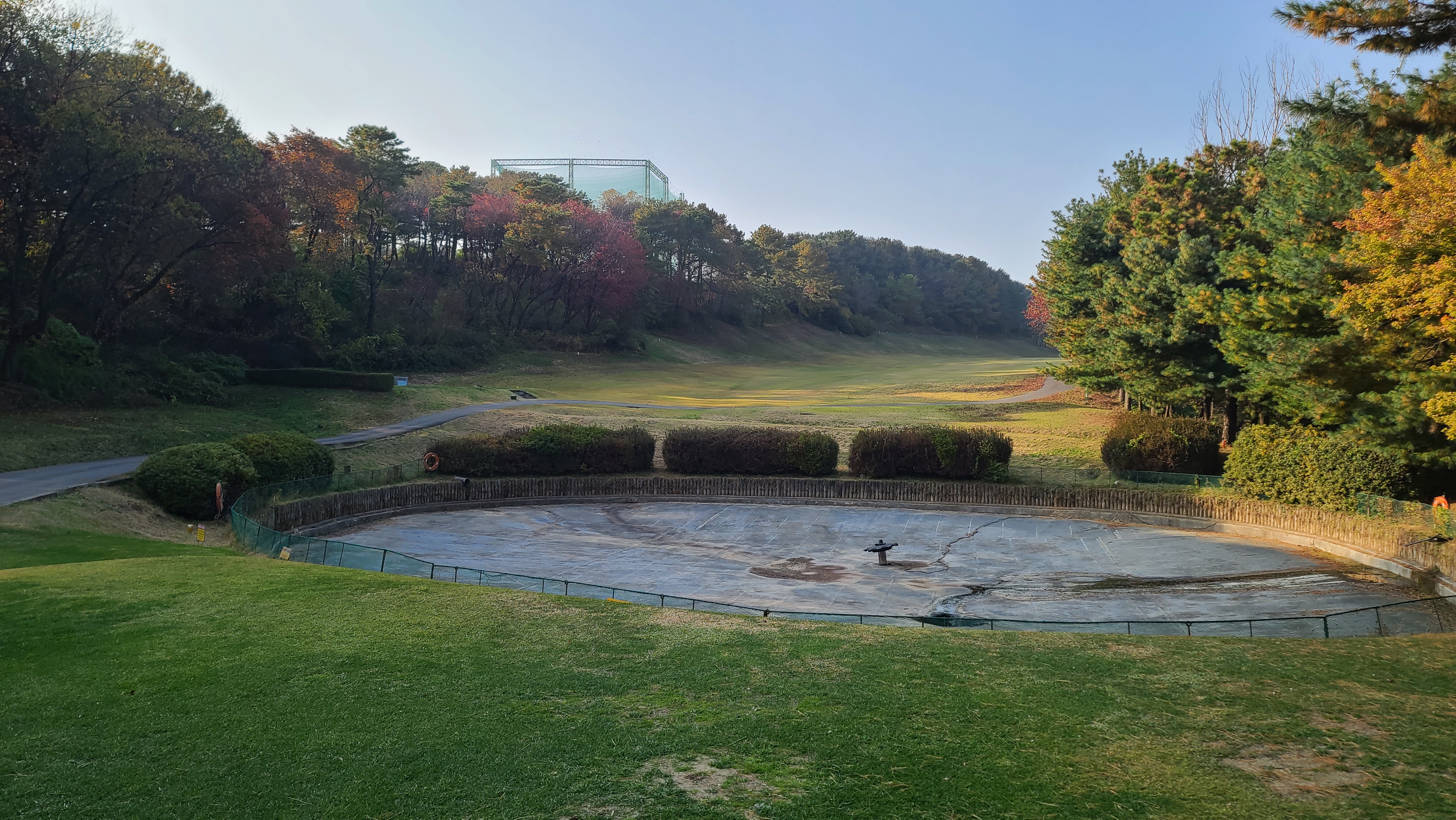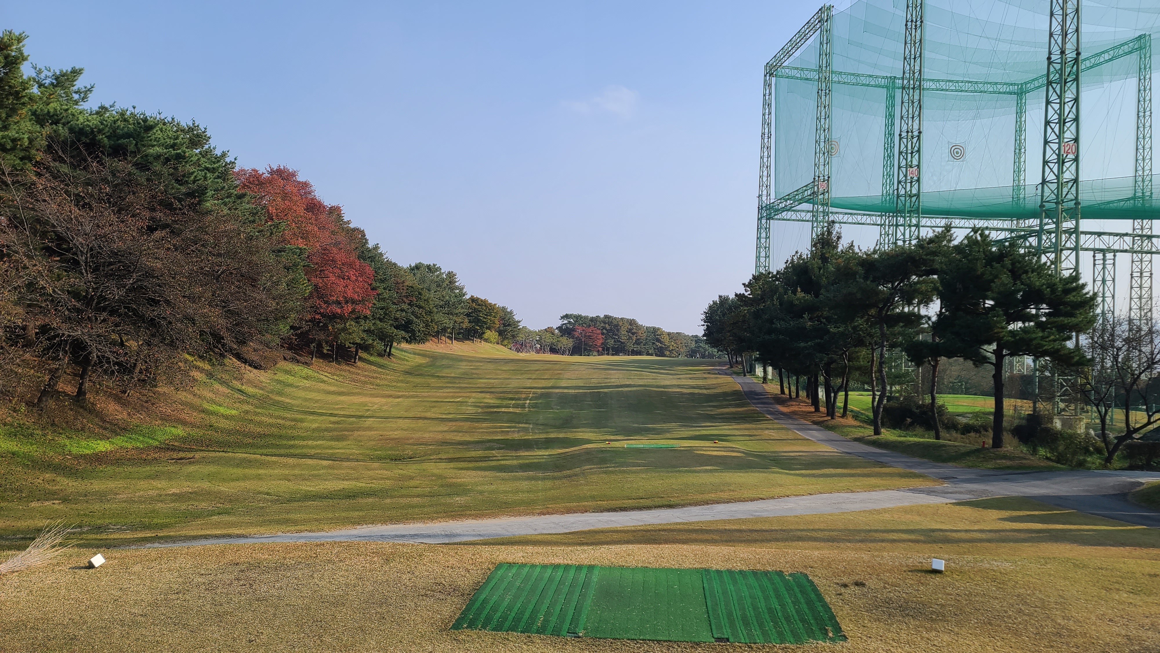 후반은 한라코스입니다. 352m 거리의 내리막 파4홀로 클럽하우스 옆의 골프연습장과 나란히 앞방향으로 구성된게 상당히 특색있어 보입니다. 골프연습장에서의 티샷을 머리속으로 그리면서 샷을 한다면 매우 도움이 될 것같은 홀입니다.