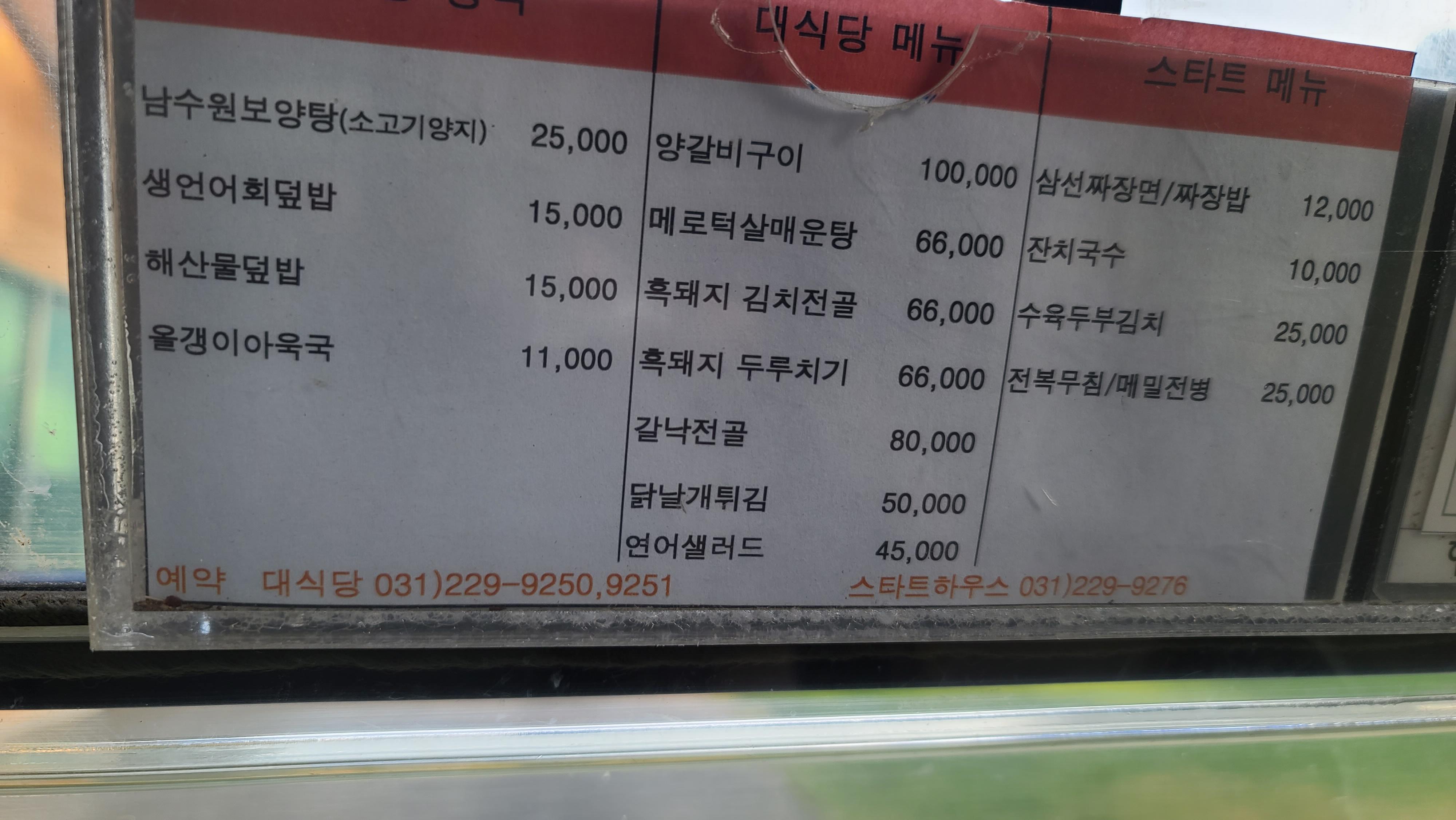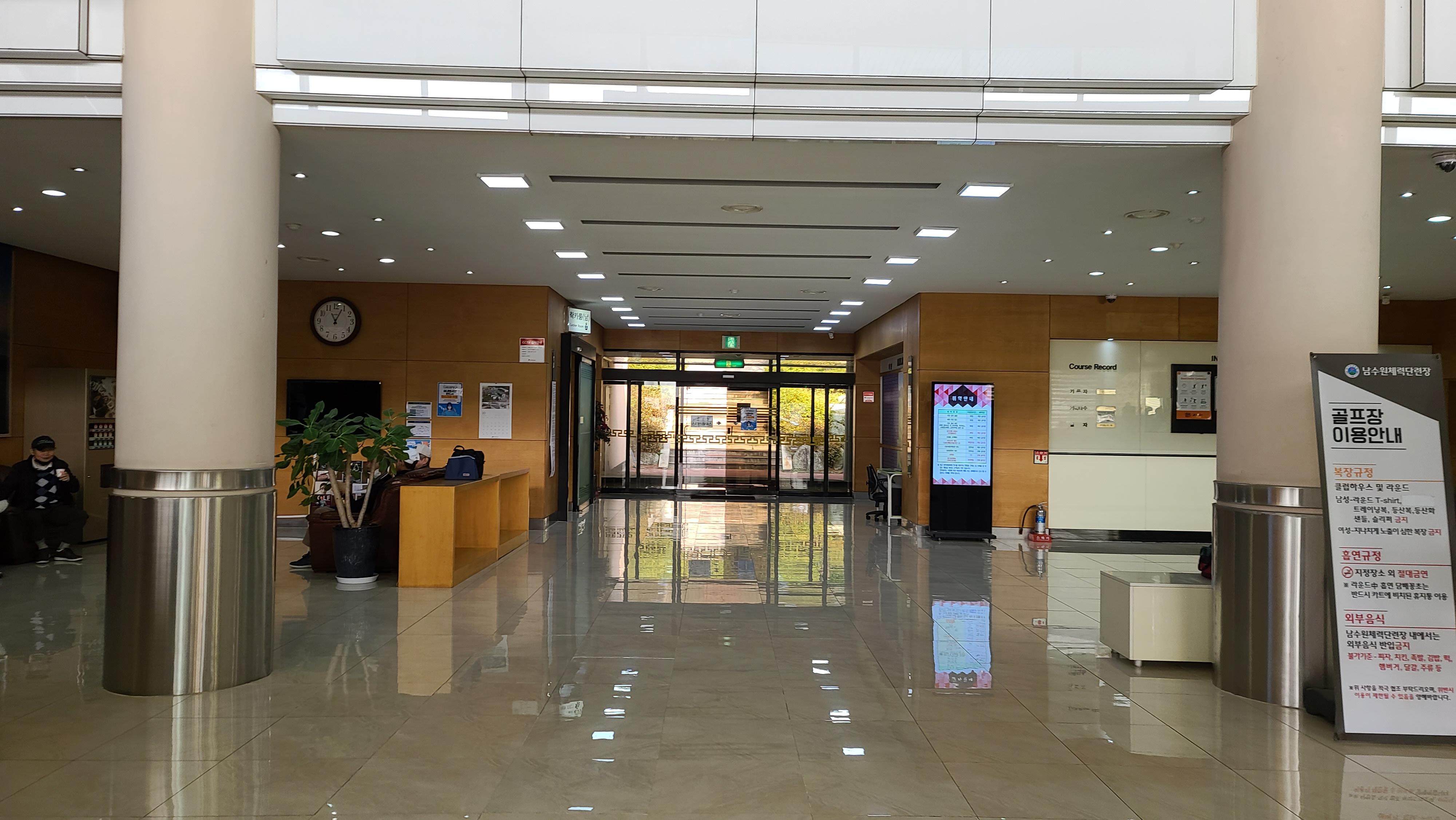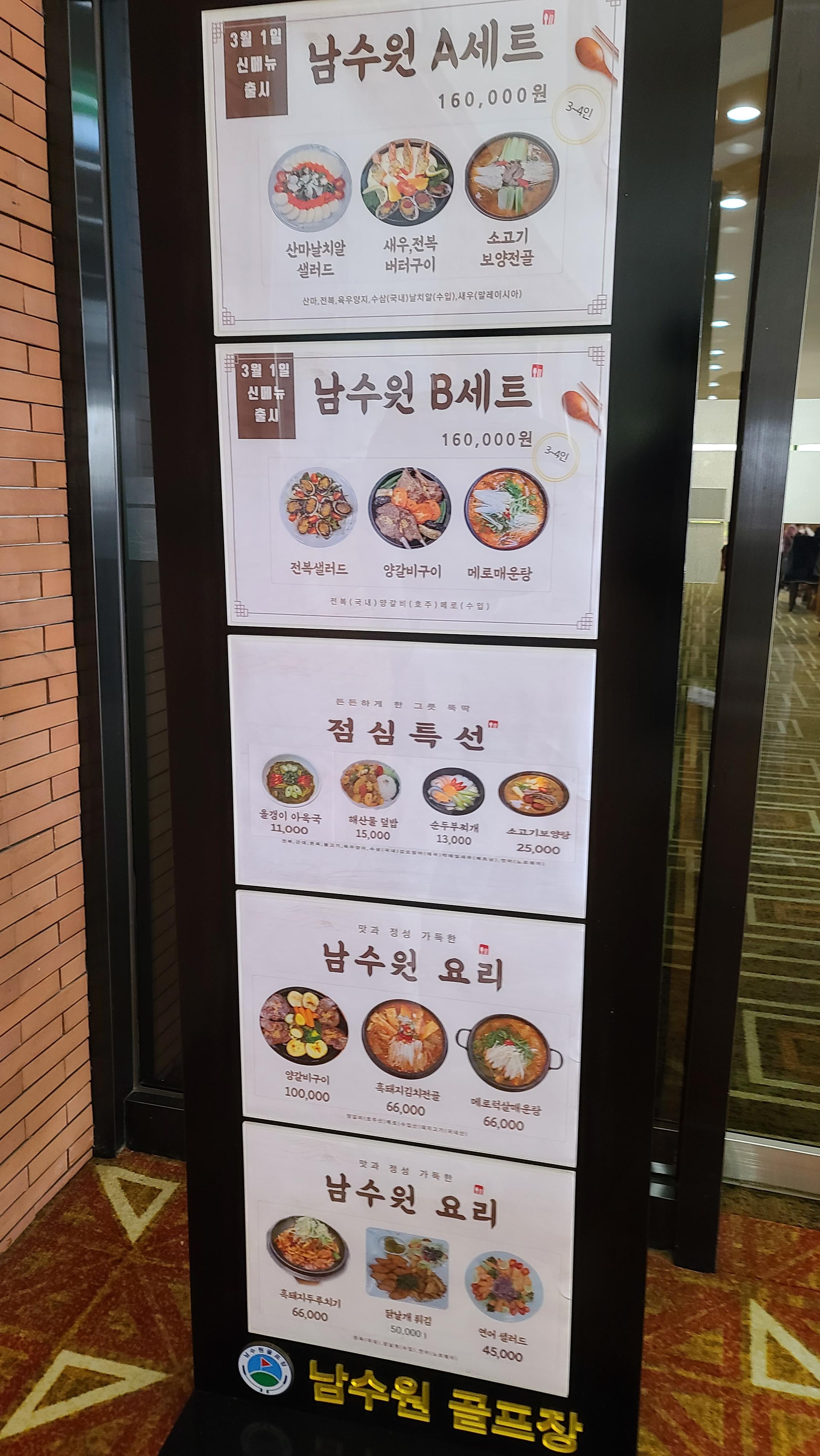 라운딩 후 즐거운 식사를 위하여 클럽하우스 2층에 위치한 식당으로 이동합니다. 남수원골프장이라고 쓰여진 액자가 군골프장의 느낌을 잘 살리고 있습니다. 메뉴를 다시한번 살펴보고 입장을 합니다.