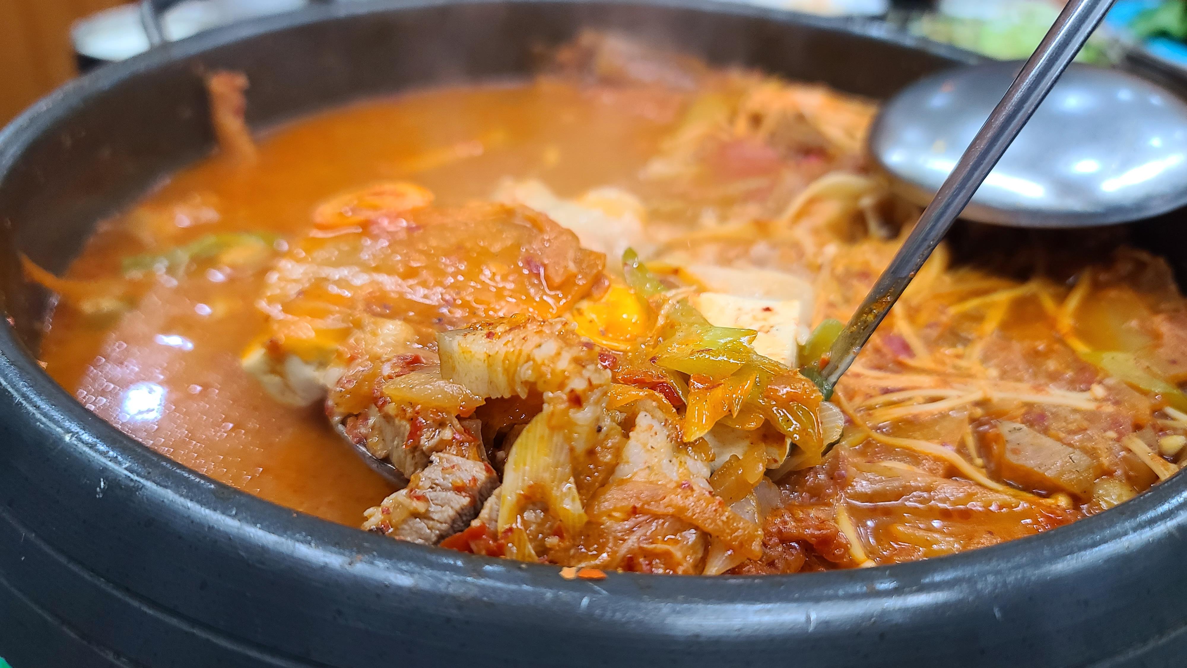 충분히 끓여낸 후 가득 들어있는 흑돼지 일명 왕건이들을 김치와 함께 건져내서 맛을 봅니다. 역시 맛있는 돼지살과 김치 그리고 조미료의 맛이 어우러져 천상의 맛을 자아내고 있습니다.