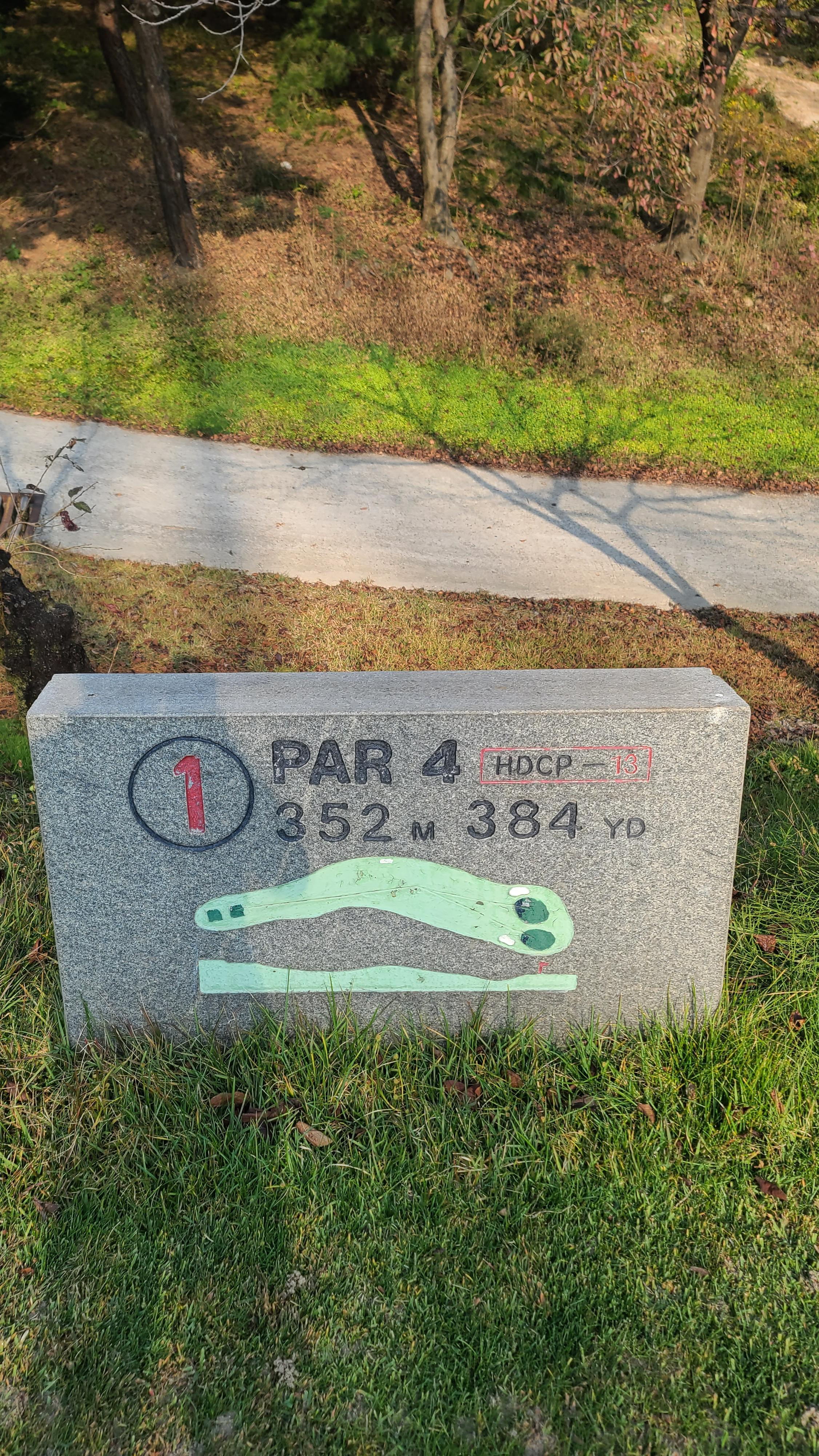한라3번 375m의 오르막 파4 핸디캡 1번홀입니다. 티샷 구역 앞은 인조 분수가 자리잡고 있어 심리적 압박감을 느끼게 하고 있으며 또한 살짝 우도그렉 홀로 그린의 위치가 보이지 않으므로 캐디님의 설명을 듣고 IP방향으로 티샷거리가 제법 나와줘야 안정적으로 공략할 수 있습니다. 긴전장, 오르막거리의 압박, 그리고 인공 구조물 까지 상당히 어렵게 느껴지는 홀입니다.