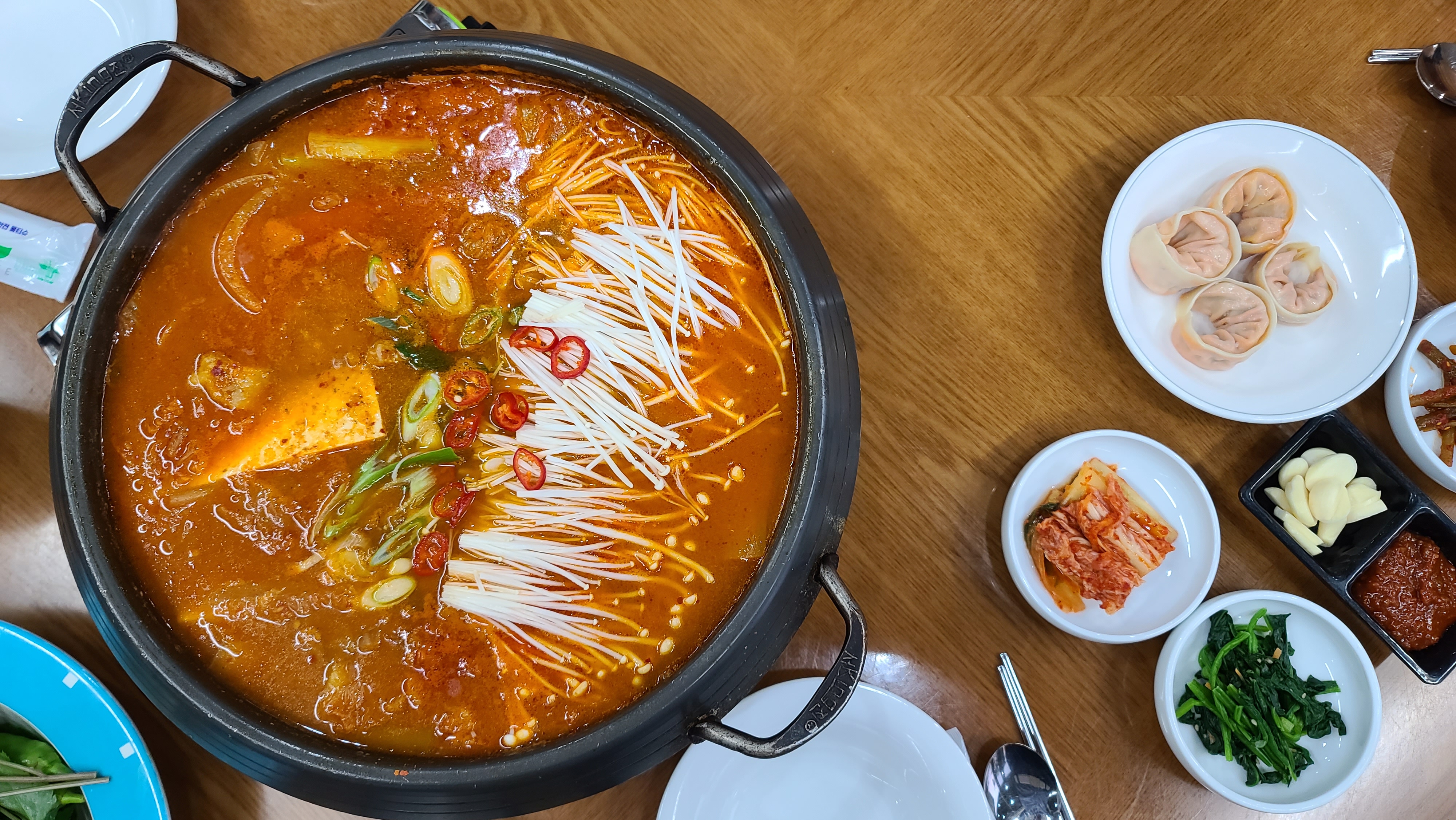 흑돼지김치전골을 세팅한 자리를 안내받고 착석을 합니다. 두부와 팽이버섯 그리고 갖은 양념들로 끓고 있는 비주얼이 식욕을 자극하고 있습니다.