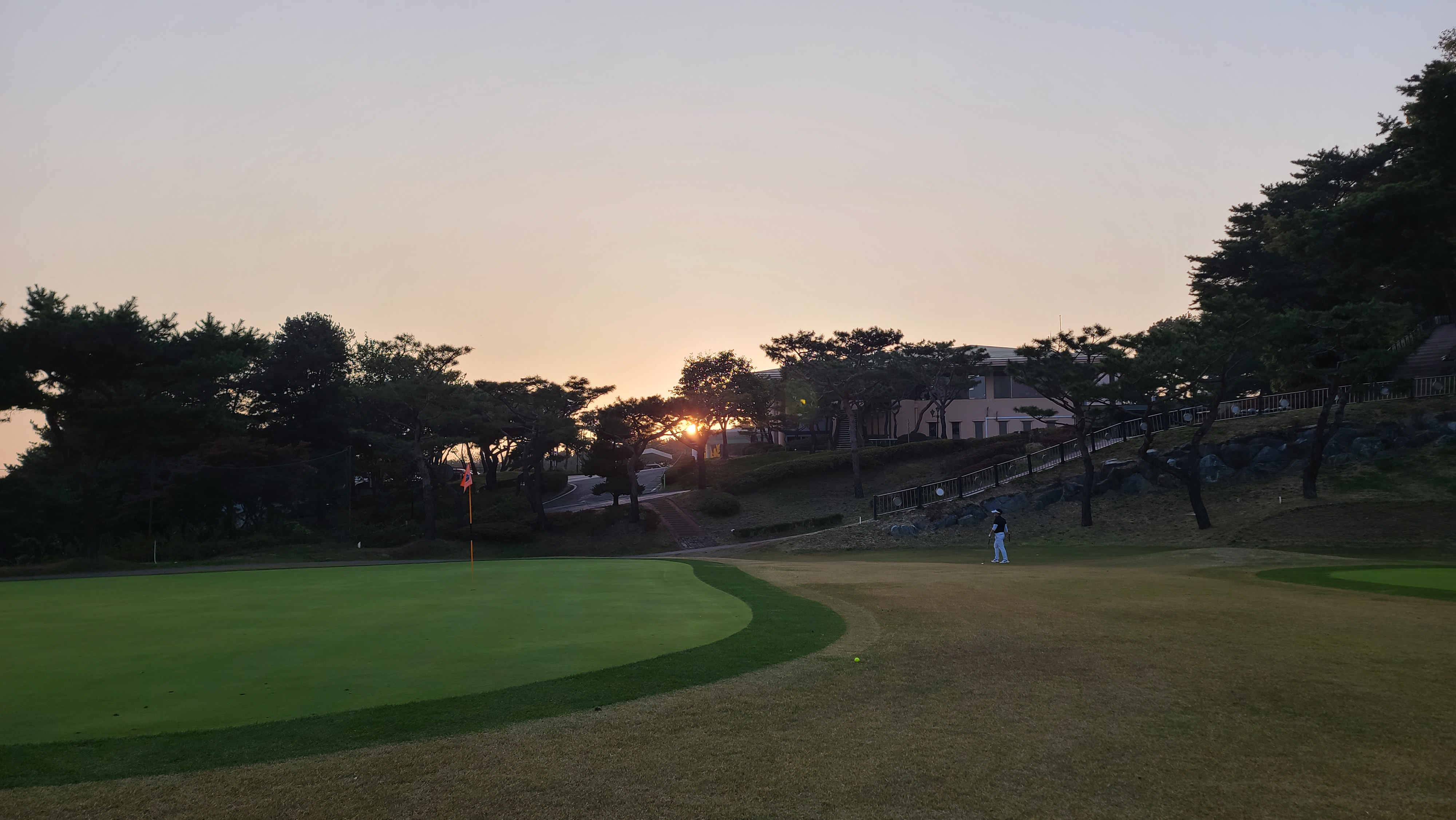 그린에 다다르니 클럽하우스가 보이고 있습니다. 햇살사이로 비추는 그린의 모습이 매우 낭만적으로 느껴지고 있습니다. 좋은 풍경에서 홀컵에 넣고 인사도 하고 기념샷도 찍고 즐거운 마음으로 클럽하우스 식당에 뒷풀이를 위하여 이동을 합니다.