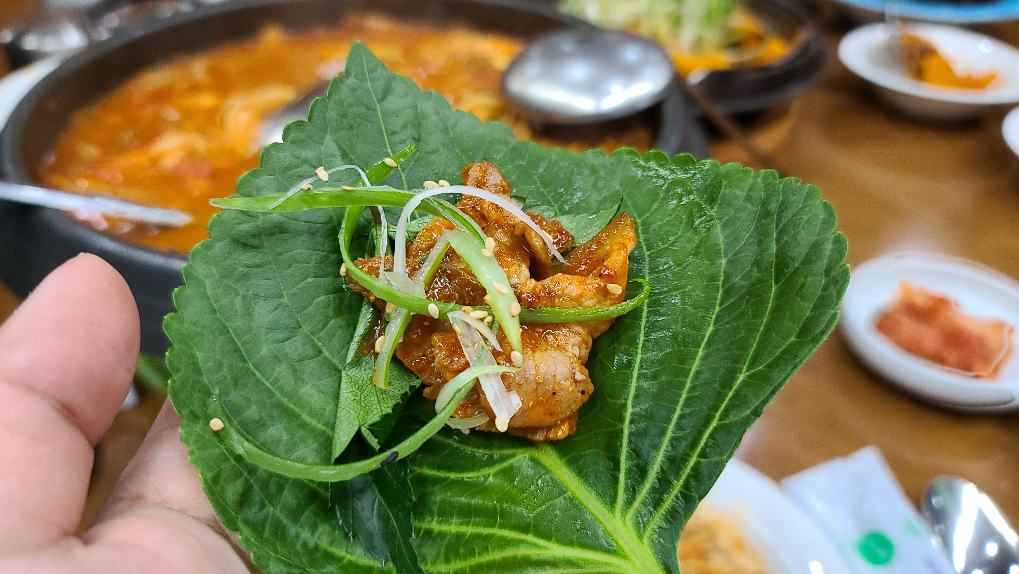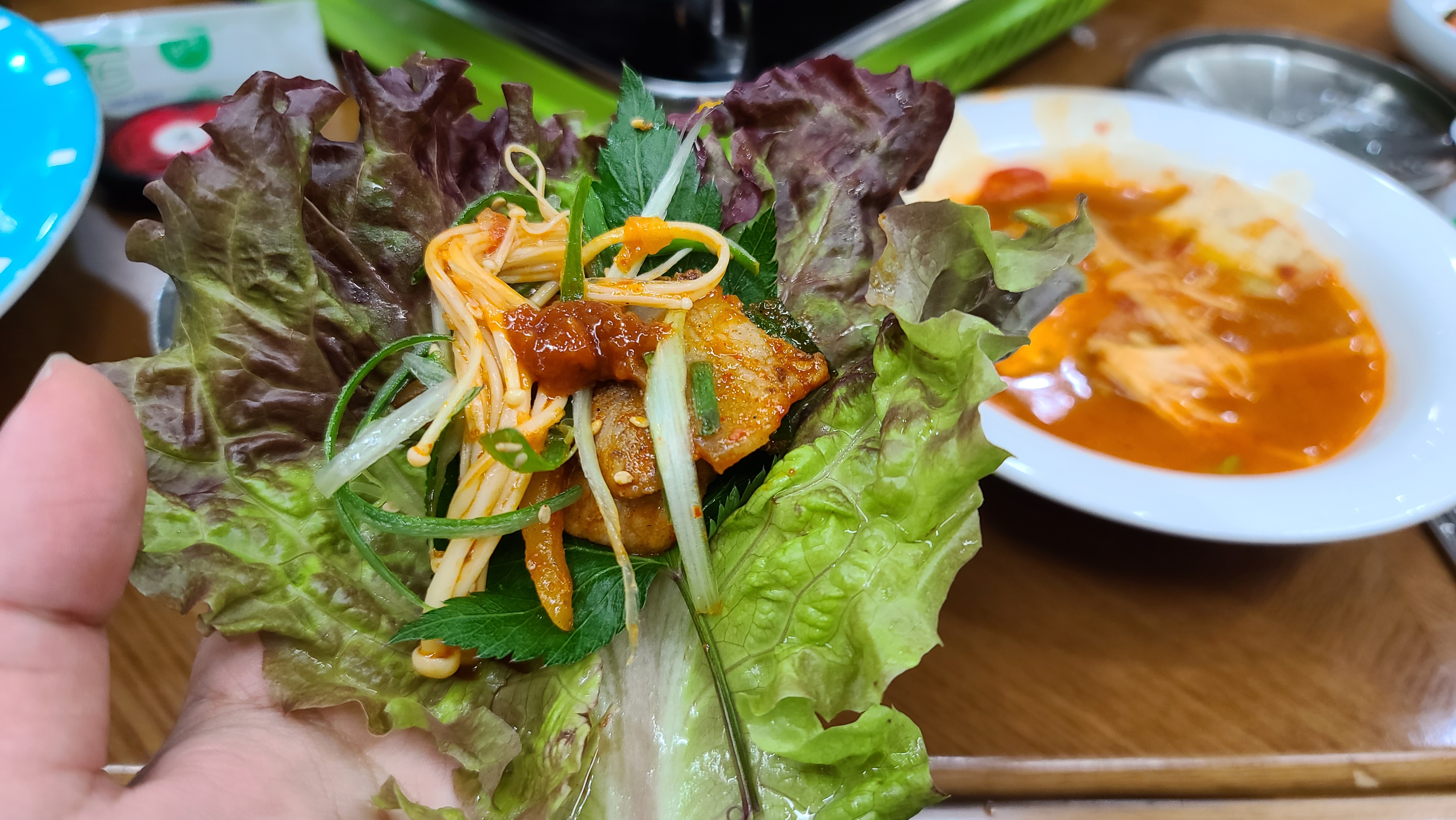 맛있는 흑돼지두루치기를 그냥도 맛보고 깻잎, 상추와도 맛보고 마늘등 여러가지 재료들도 조합하고 맛을보며 행복에 겨운 시간을 보냅니다. 라운딩후 맛을 보니 더욱 꿀맛이 아닐 수 없습니다.