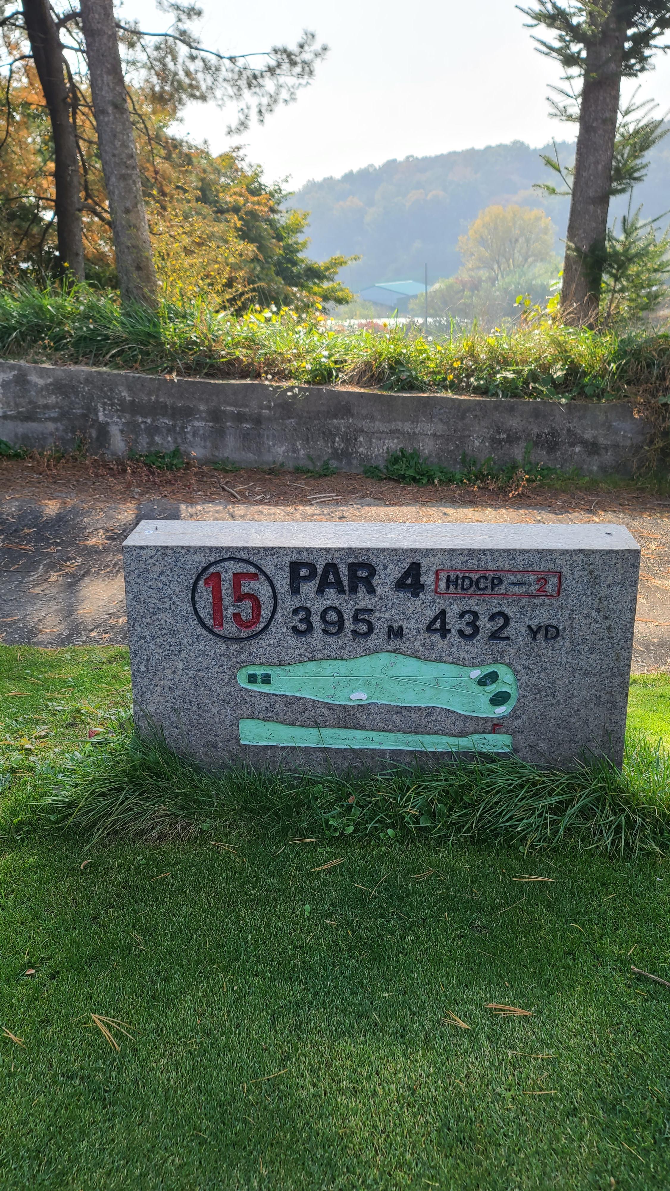 백두2번 오르막 274m 거리의 파4홀입니다. 첫번째 내리막과 반대로 오르막의 코스로 그린이 보이지 않으며 좌그린과 우그린에 따라서 코스길이가 달라집니다. 캐디님께서 오늘은 무조건 좌그린이라고 하니 페이드 구질의 골퍼는 상당한 고전이 예상되게 됩니다. 코스가 짧으므로 아이언으로 공략해도 무난히 클리어가 가능한 홀입니다.