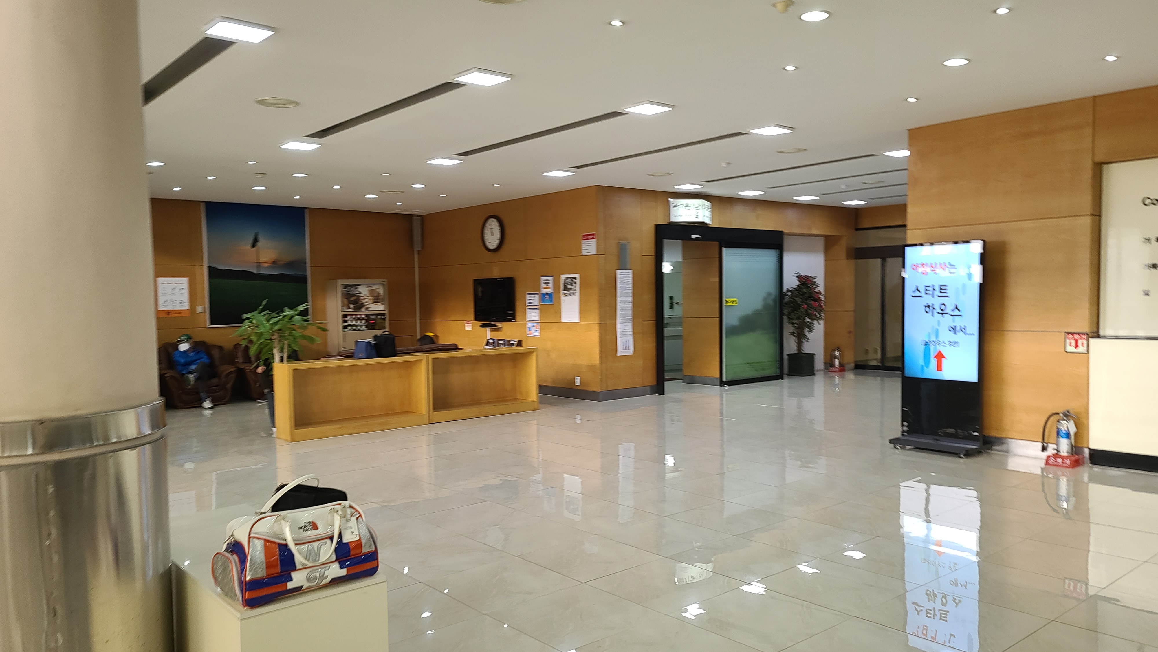 클럽하우스에 들어가서 내부를 살펴보니 아담한 사이즈이지만 대리석 바닥에 밝은 조명이 비춰서 세련되어 보이는 인테리어가 인상적입니다. 정면으로 스타트 하우스 좌측으로 락커룸 그리고 오른쪽으로 카운터가 있는 모습입니다.