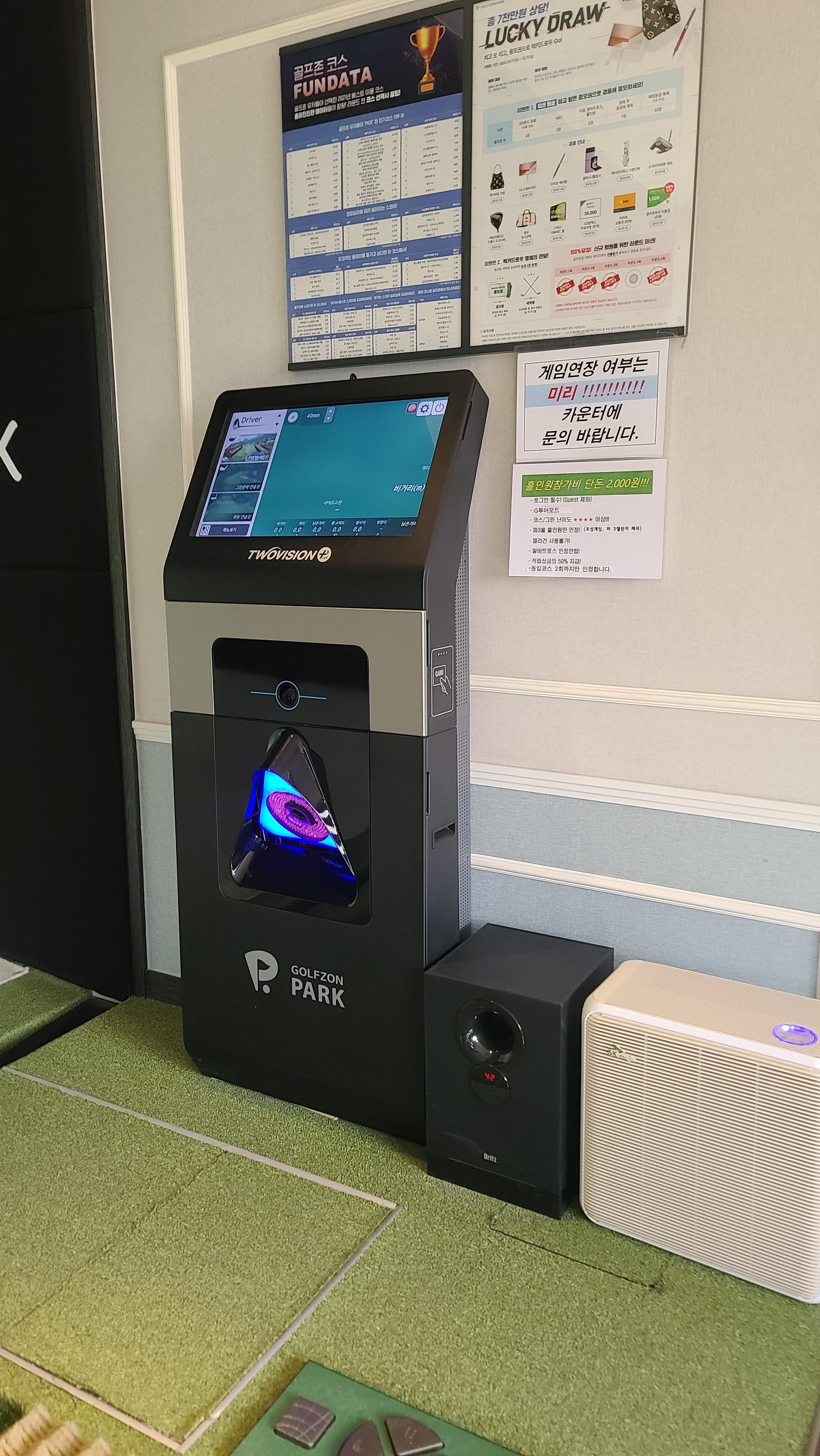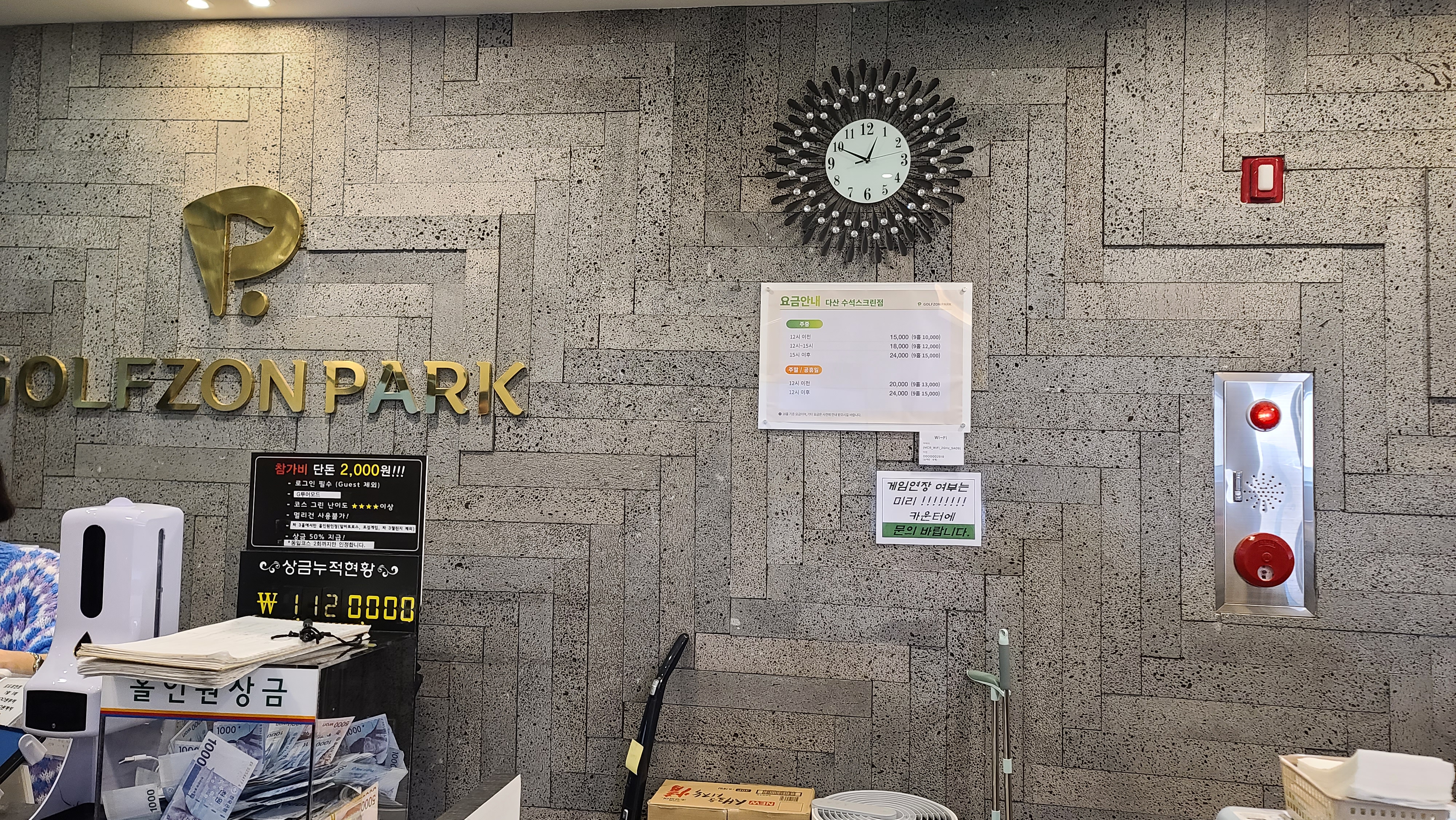 들어가서 입구에서 예약확인을 하며 요금을 살펴봅니다. 주말 12시이전 2만원 이후 24,000원 한강변에 위치한 스크린골프인데도 무척 저렴하게 느껴집니다. 홀인원 누적상금은 1백만원이 넘어가는 것도 볼수가 있습니다.