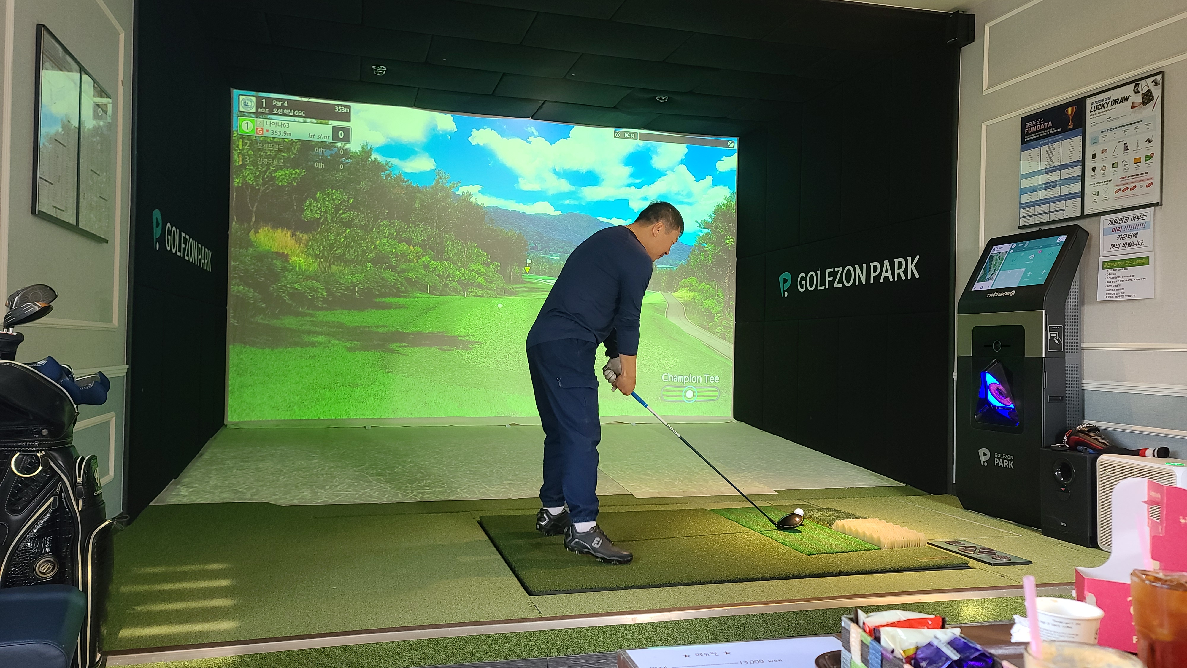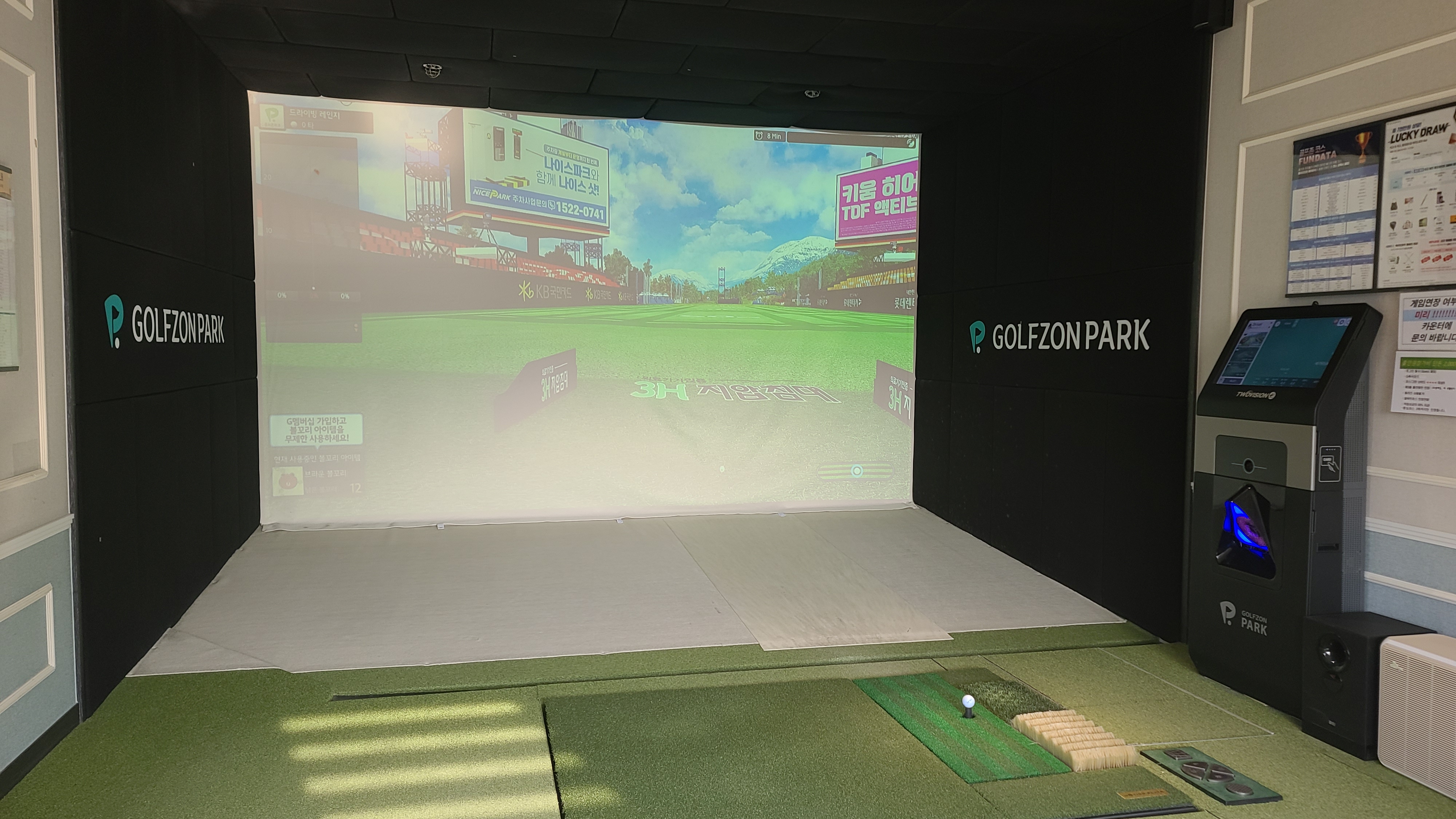 방을 안내받고 시스템을 살펴봅니다. 골프장 시스템은 최신형 키오스크로 관리되고 있으며, 스크린은 바닥과 벽면 2군데에 프로젝터가 쏴주는 형식을 확인할 수 있습니다.