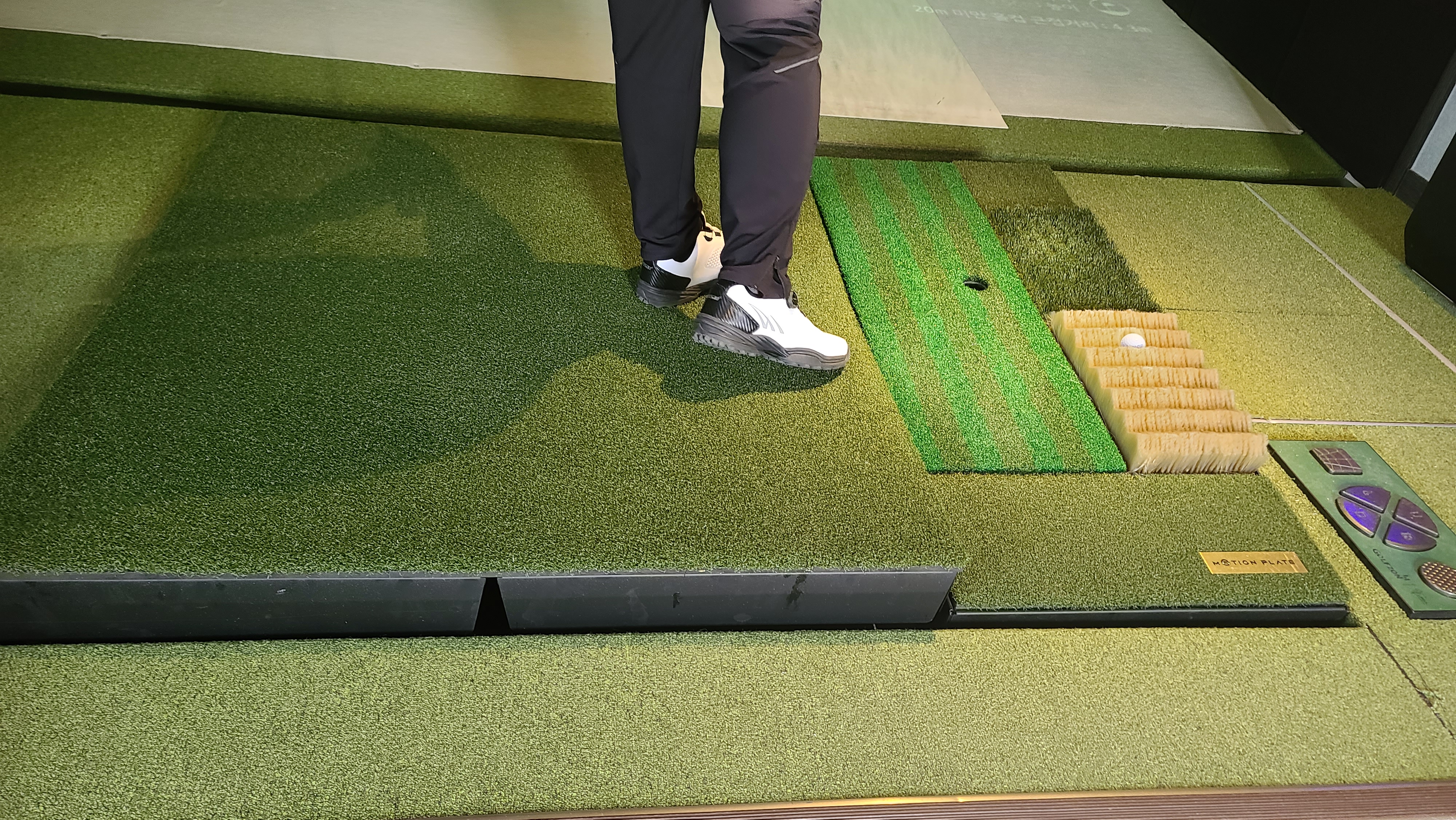 플레이하면서 매트와 벙커 그리고 러프등 새로운 투비전 플러스 시스템의 구성을 자세히 살펴봅니다. 다각형의 매트는 다양한 각도로 움직이며 발의 위치, 공의 위치 경사등을 재현해내고 있는 것이 보입니다. 벙커에 빠져서 플레이를 하려니 오목하고 볼록한 벙커의 샌드매트가 상당히 인상적입니다. 더욱 어려운 벙커샷을 하게 만드는 역할을 하고 있습니다.