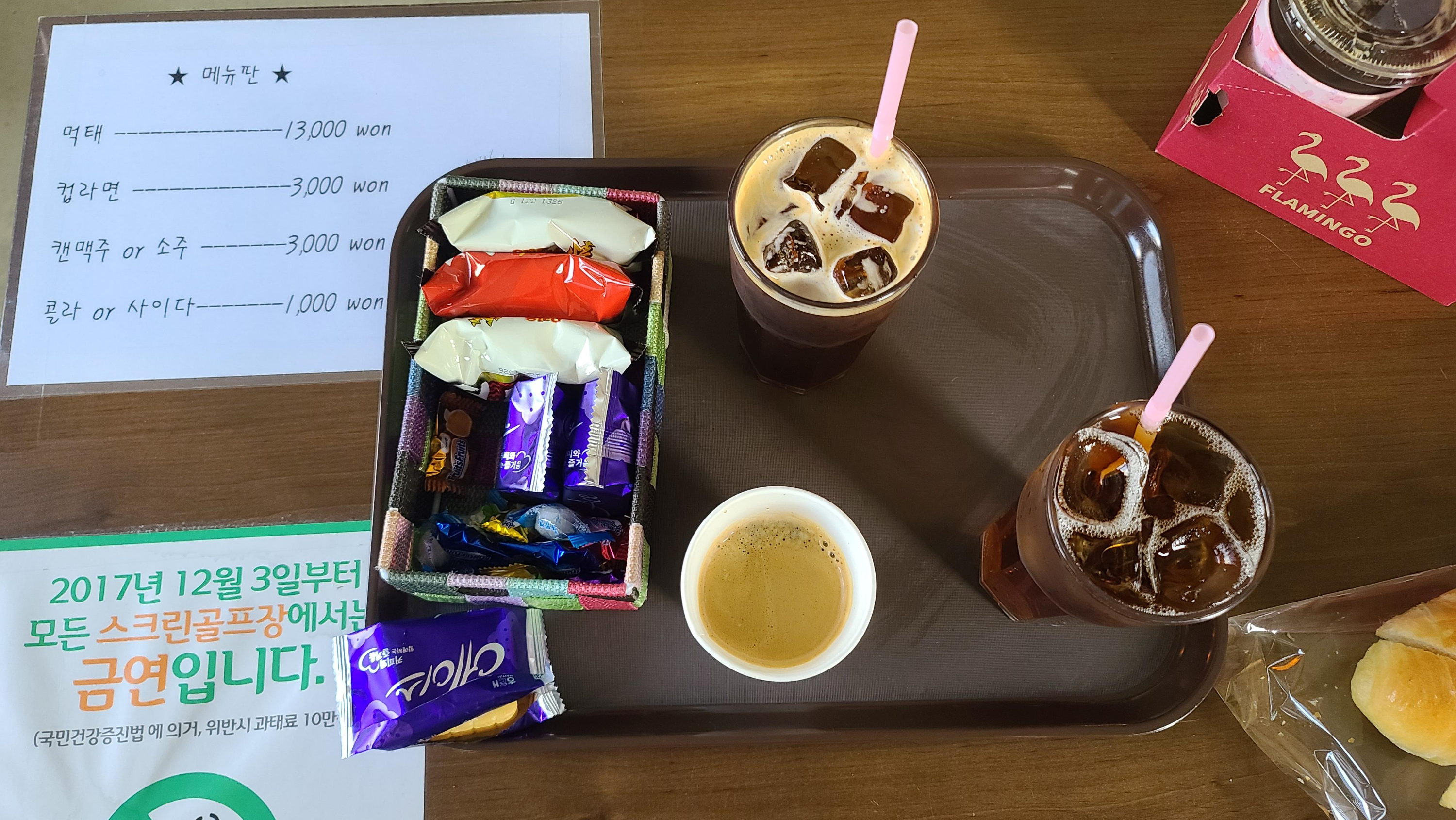 플레이를 시작하니 음료와 간식거리를 가져다 주셨습니다. 아이스커피와 아이스티를 마시며 당이 떨어질때마다 과자를 까먹으니 정말로 꿀맛같은 휴식이 아닐 수 없습니다.