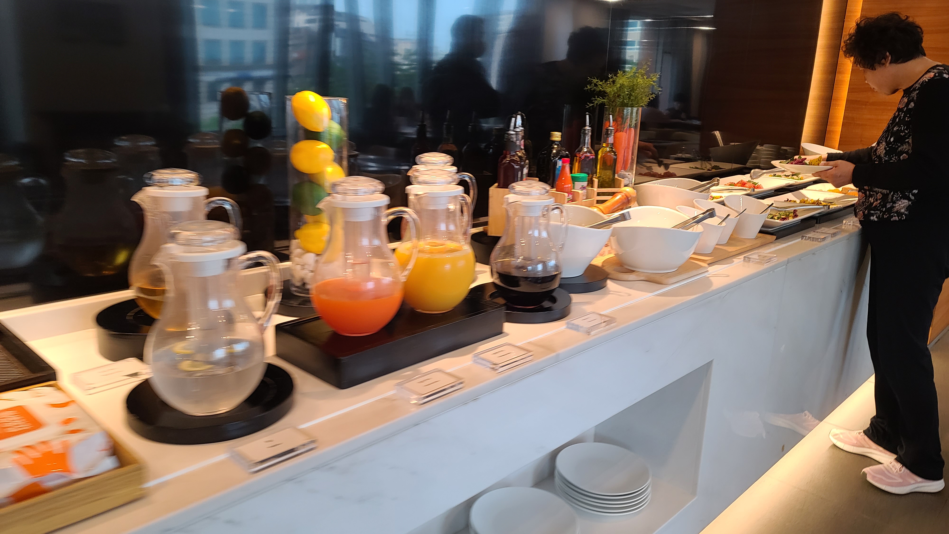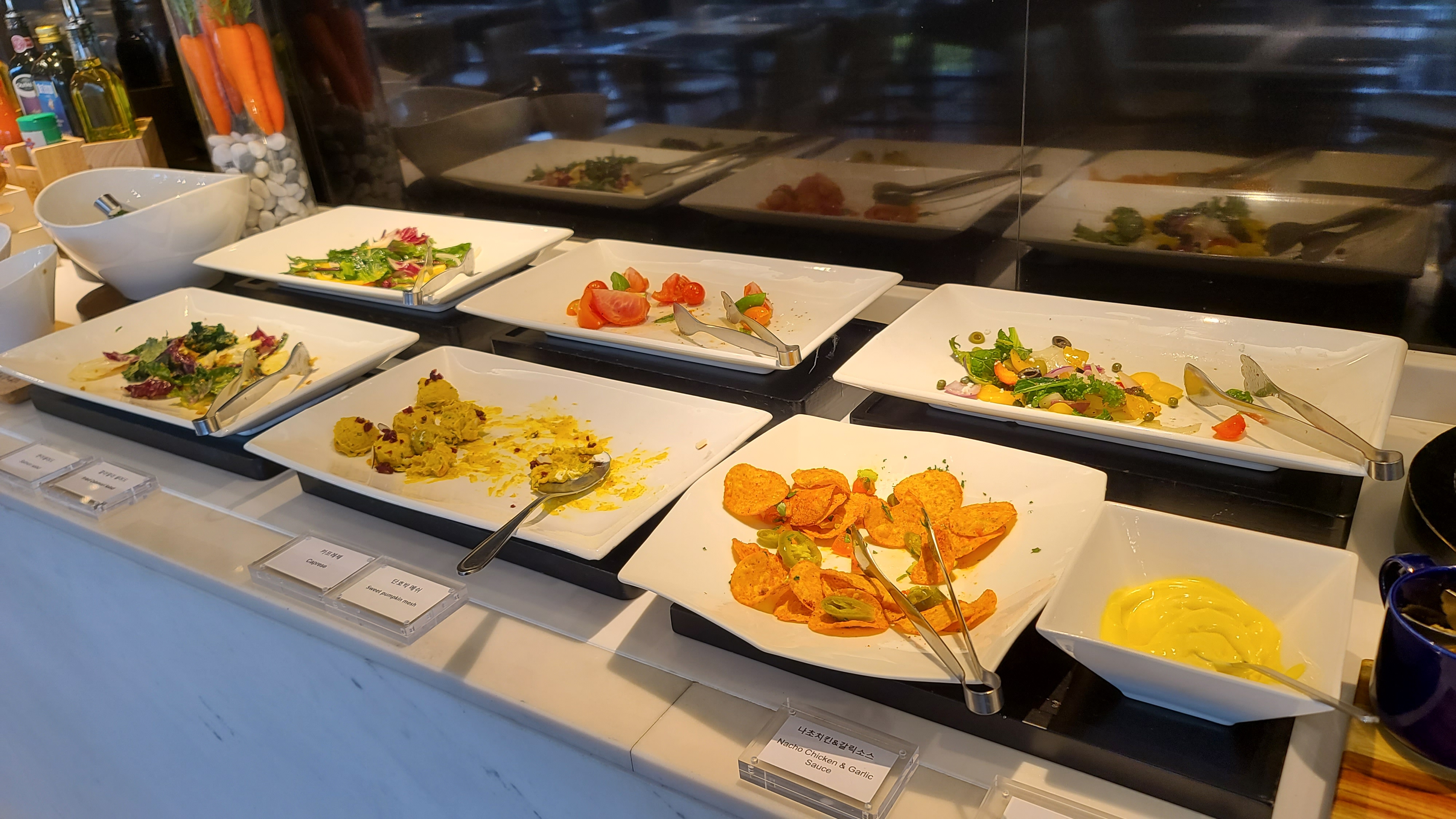 동선을 따라 이동하니 주스와 샐러드 코너가 보입니다. 사과, 당근, 오렌지, 포도 등 다양한 과일주스와 여러가지 샐러드의 조합이 매우 웰빙스러운 식단으로 보여집니다.