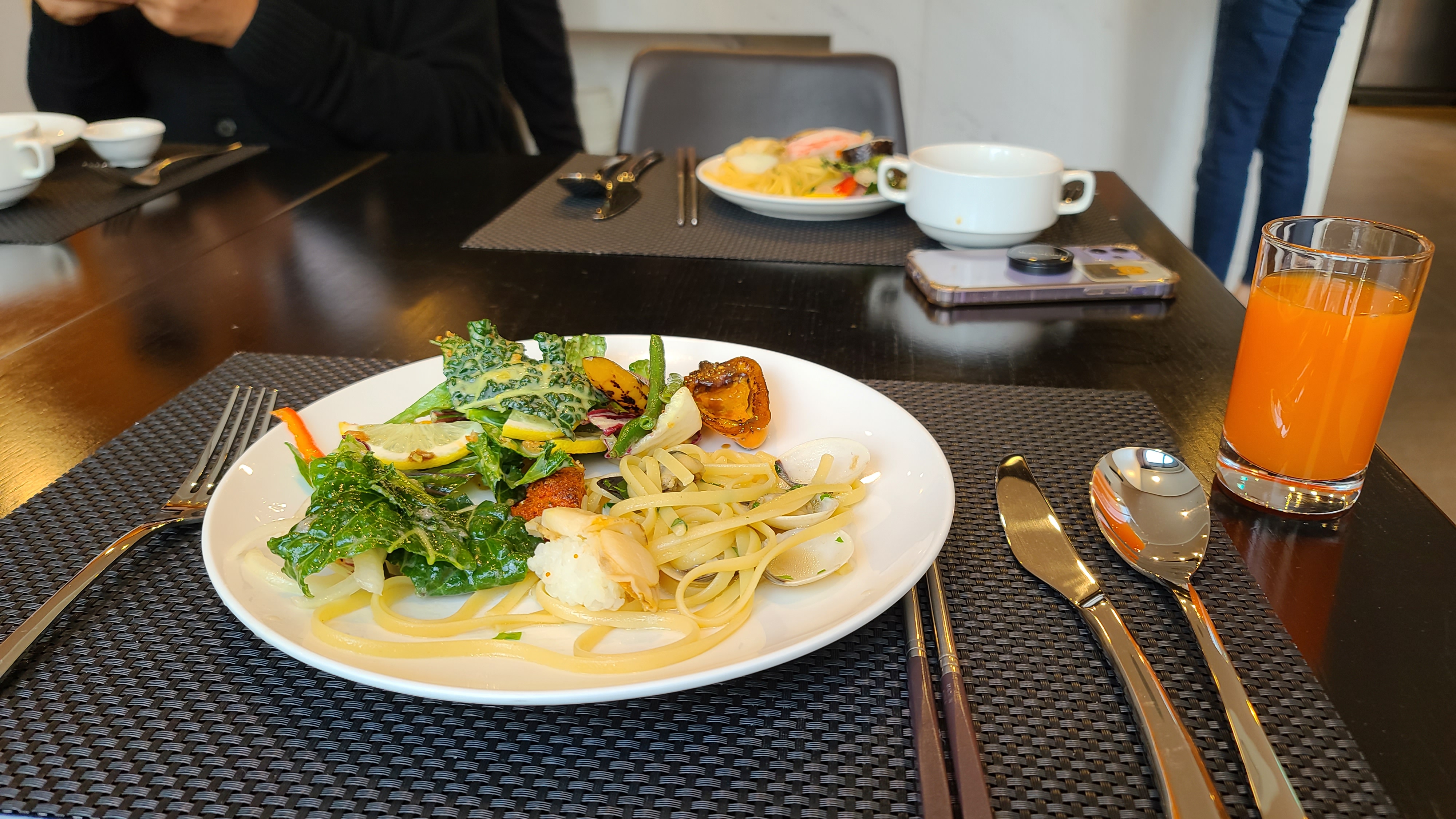 취향에 따라 샐러드와 구운야채, 봉골레 스파게띠를 플레이팅하여 맛을 봅니다. 샐러드와 당근주스의 조합이 무척이나 어울린다고 느껴지게 됩니다. 초밥과 김밥등의 메뉴들은 뷔페에서 잘 먹지 않지만 페이토에서는 상당히 맛있게 조리해놓은것을 느끼게 됩니다.