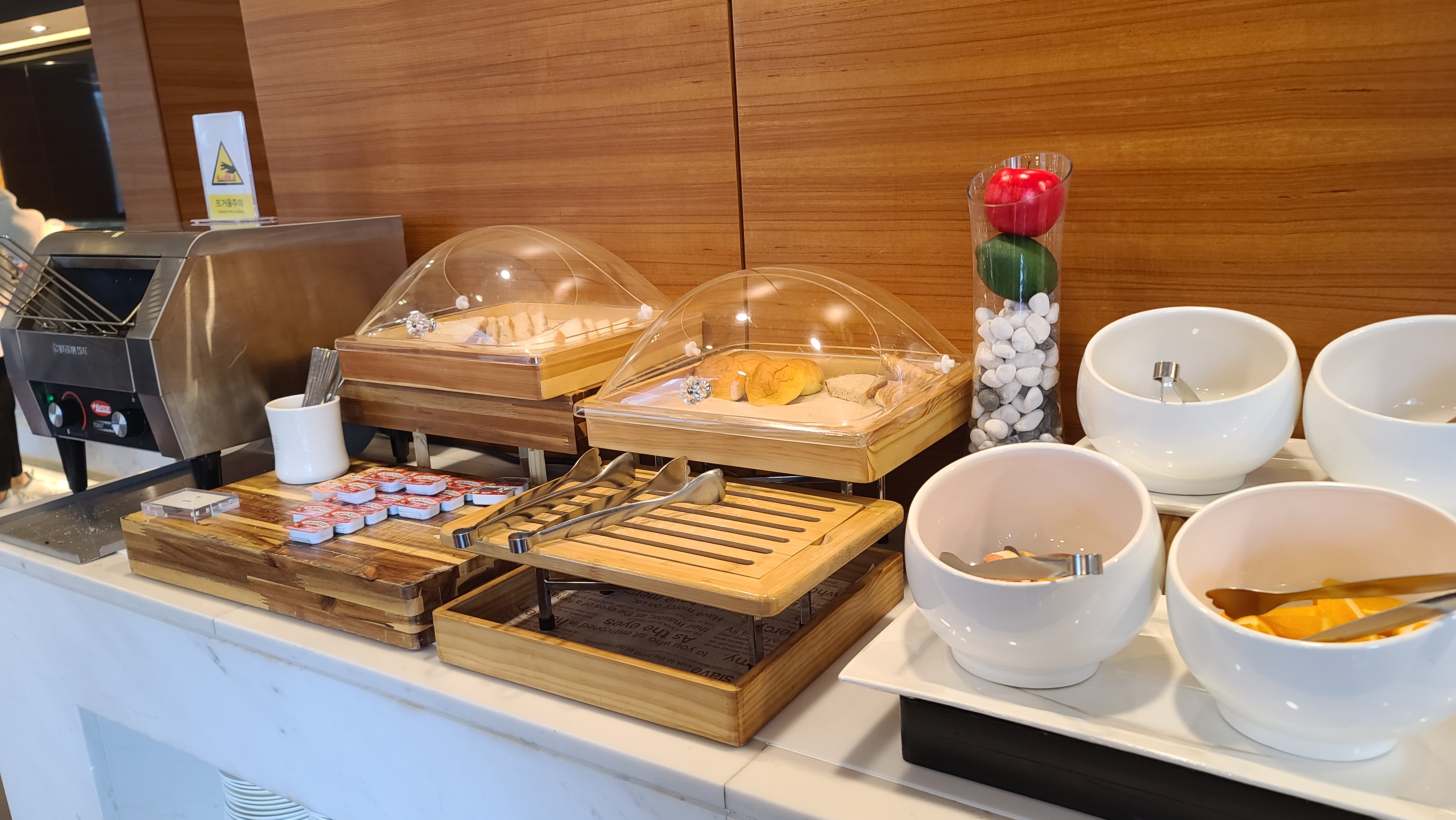 자리를 잡고 본격적으로 뷔페 메뉴들을 살펴보기 시작합니다. 동선에서 처음 눈에 보이는 것은 여라기지 빵종류와 잼, 버터, 토스트기계가 세팅되어 있는 구성입니다. 서양식 조식 구성은 어느 호텔 뷔페에서도 볼 수 있는 메뉴인 것 같습니다.