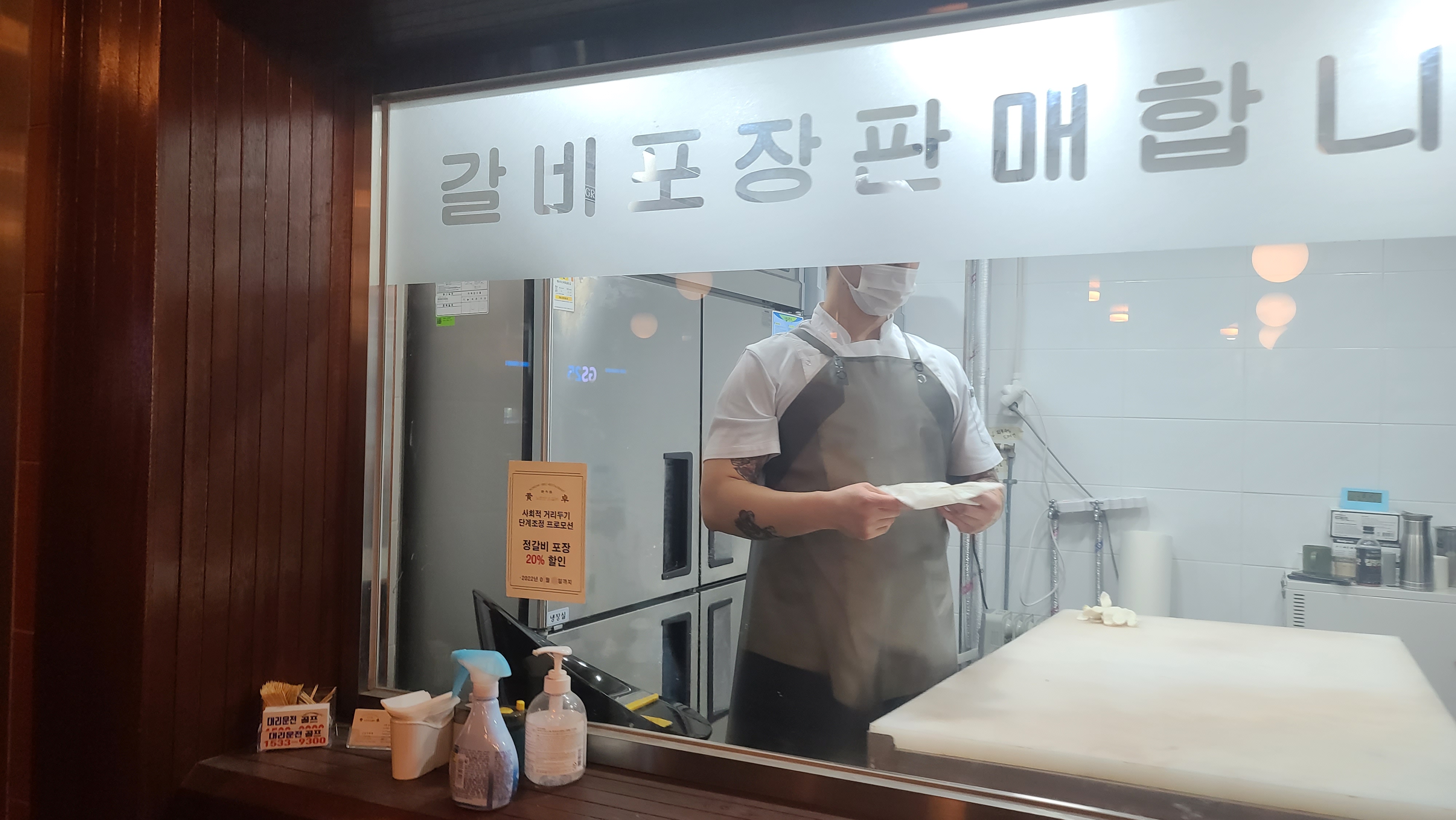 들어가서 내부를 살펴보니 6시 이른시간인데도 사람들이 꽉 들어차 있는 모습이 보입니다. 역시 강남 최고의 가성비 고깃집의 명성에 맞는 인기입니다. 한쪽에서는 갈비를 포장해서 팔고있으며 속이는 것이 없는 것을 보여주기위해 유리로 투명하게 오픈된 주방에서 작업을 하는 모습입니다.