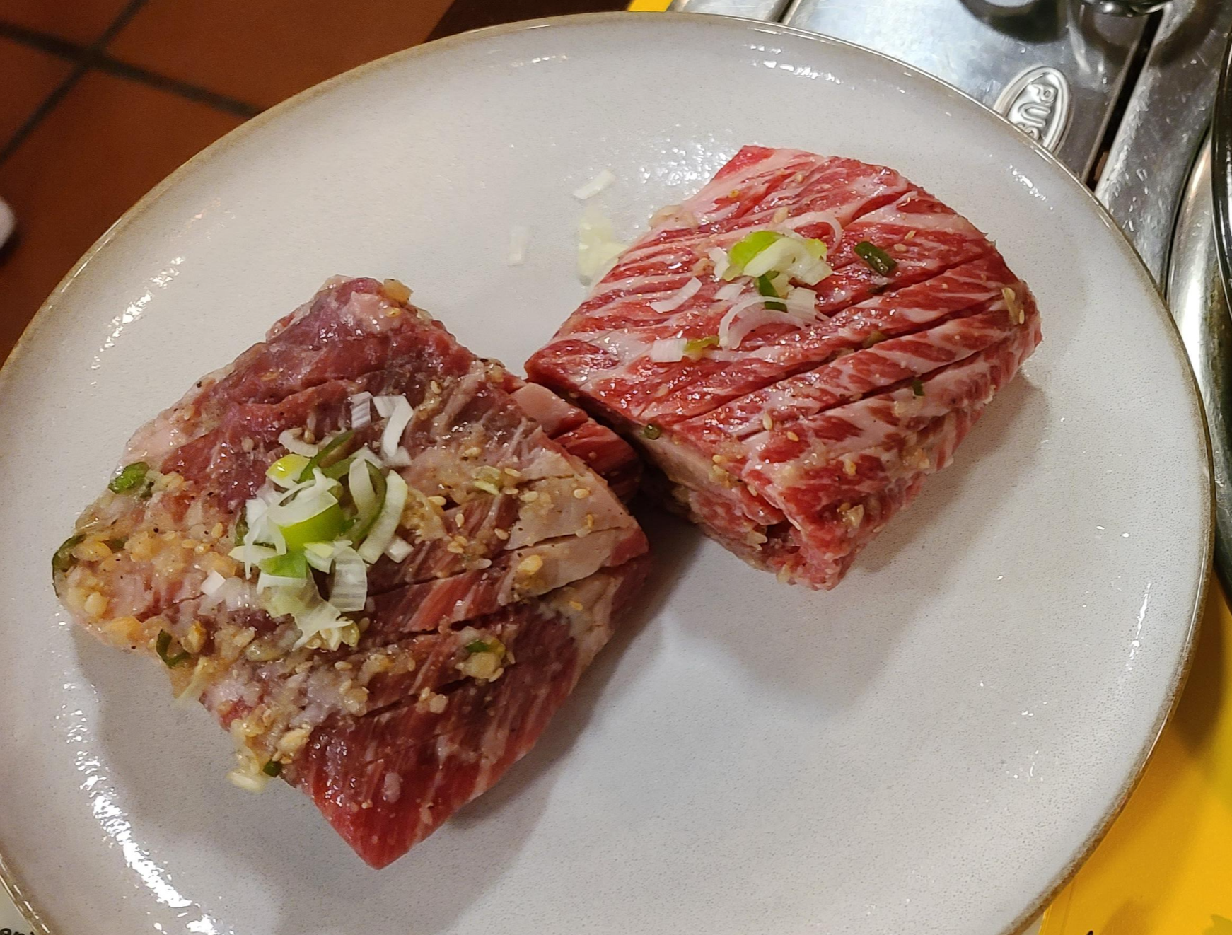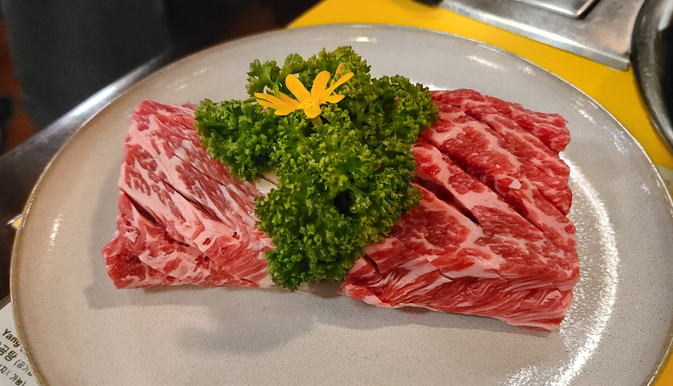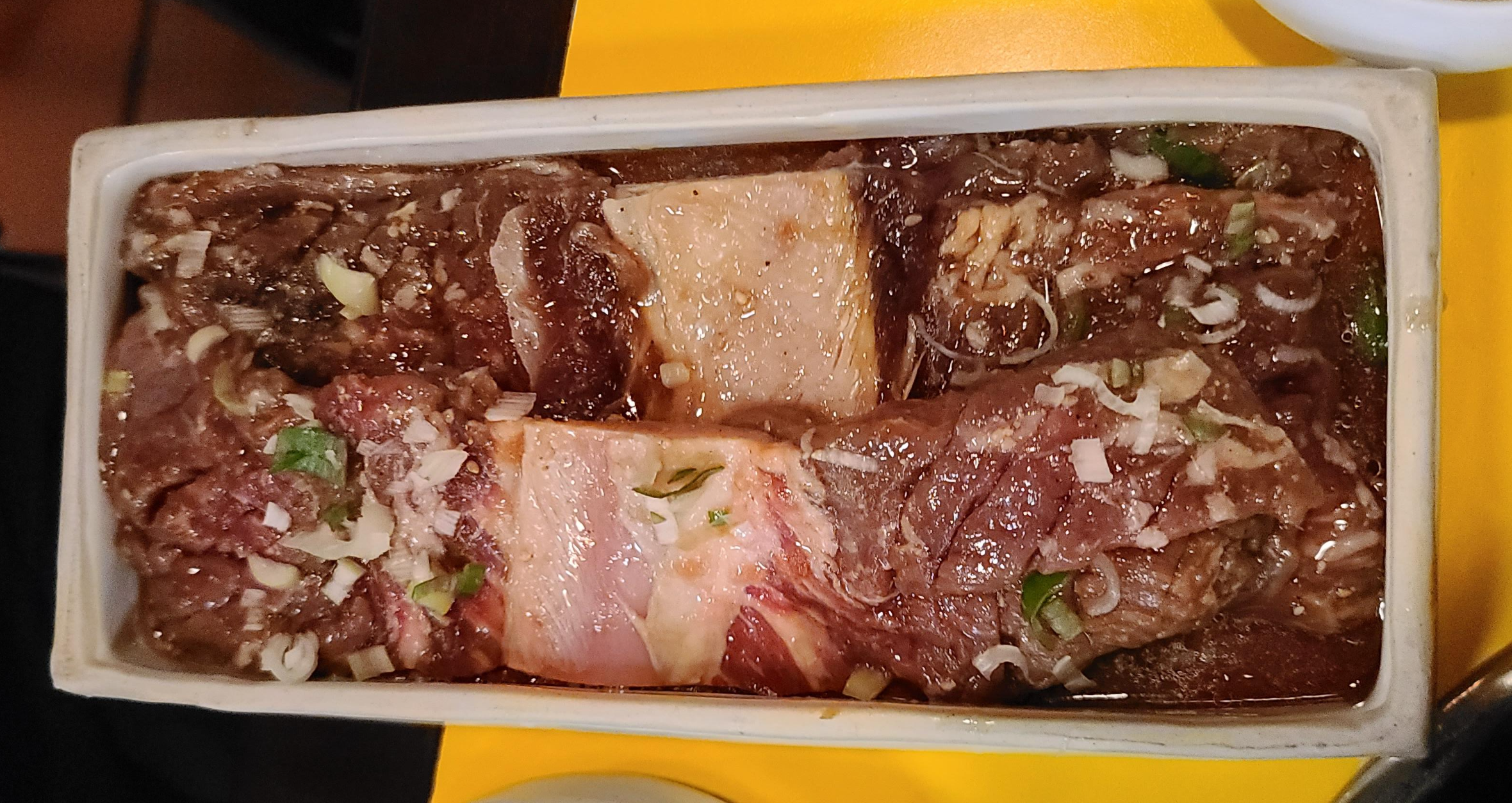 화려한 마블링이 빛나는 생갈비가 나왔습니다. 생갈비는 한정수량이라 테이블마다 최대 2개씩만 주문이 가능하다고 합니다. 양념이 없는 생갈비의 상태를 보고있으니 빠져드는 것만 같은 느낌이 나게 됩니다.