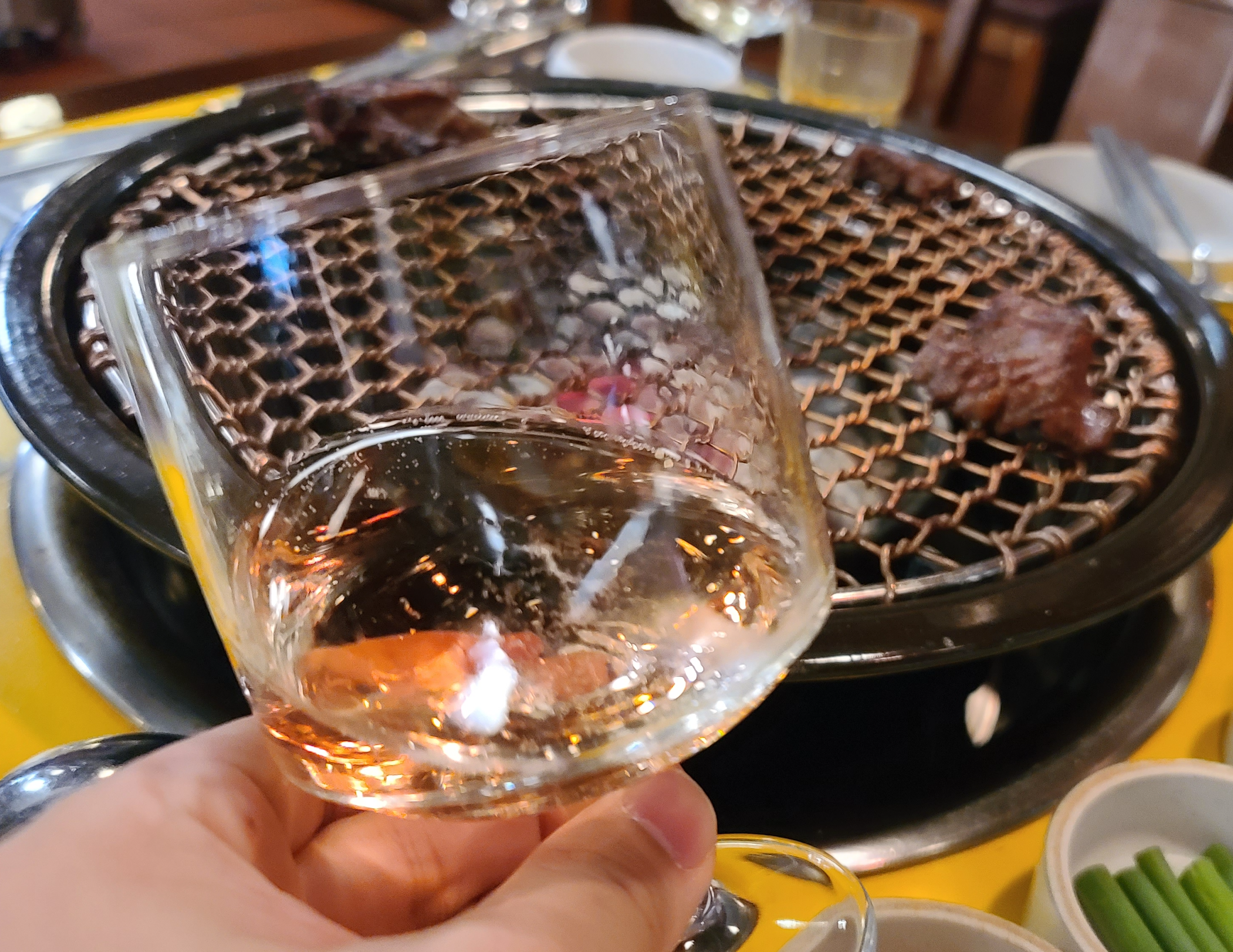 이렇게 좋은 고기에 술이 빠질수 없습니다. 준비해간 로제 샴페인을 따서 준비해주신 이쁜잔에 따라 건배를 하고 맛을 봅니다. 샴페인의 탄산과 소고기의 지방이 어우러지니 환상의 조화를 만들어냅니다. 노란상 소갈비는 또한 콜키지프리 서비스를 제공하고 있어 자신이 원하는 술을 가져다가 별도의 비용없이 마실수가 있는 가게입니다. 역시 잘되는 가게는 이유가 있는 것 같습니다.