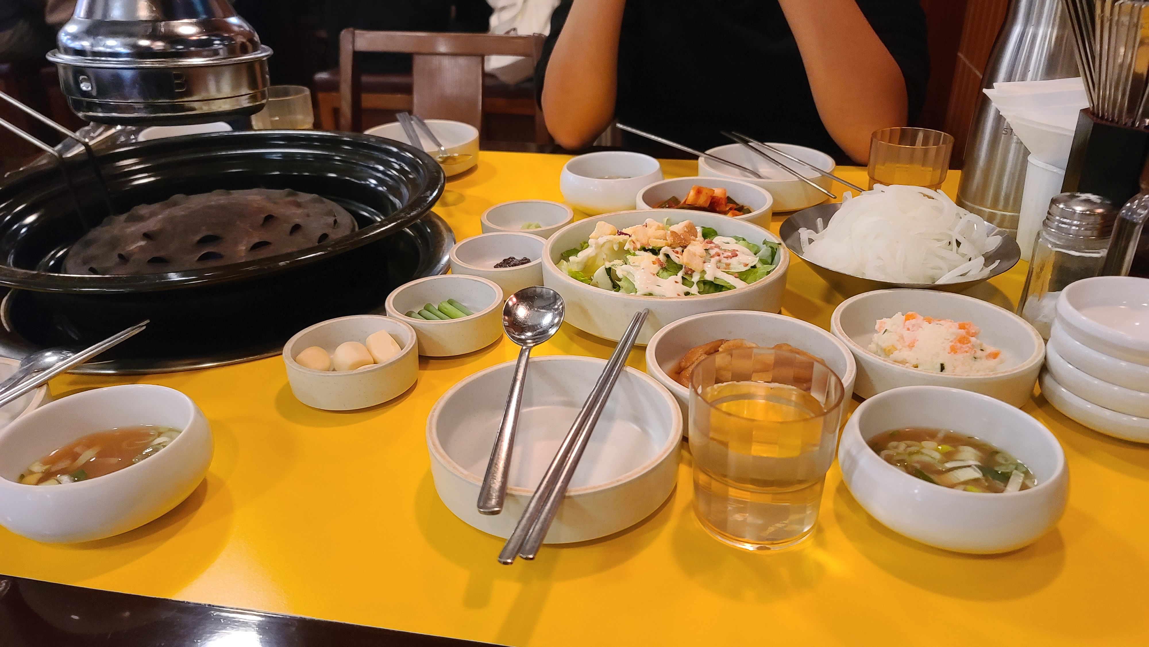 예약을 하니 자리에 이미 사람수별로 그릇과 반찬들이 세팅되어 있습니다. 메뉴판을 살펴보며 어떠한 고기 종류들이 있는지 살펴봅니다. 안창갈비, 정갈비, LA생갈비, 그리고 생갈비 4가지의 종류중 한정판매 글자가 시선을 잡아 끌기에 생갈비를 주문해봅니다.