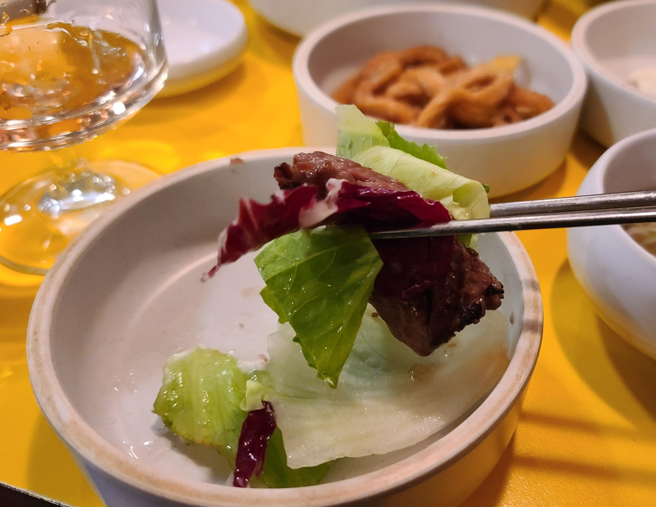 맛있게 생갈비를 먹고난후 다음타자 정갈비를 주문해봅니다. 양념이 추가된 정갈비의 비주얼은 조금더 달콤해보이는 양념이 흡수되어 검붉은 빛깔을 띠고 있습니다. 맛을 보니 역시 듬뿍배어든 양념의 맛과 고기의 담백함이 어우러져 최고의 맛을 자아내고 있습니다. 갈수록 감탄만 나오는 고기의 맛입니다.