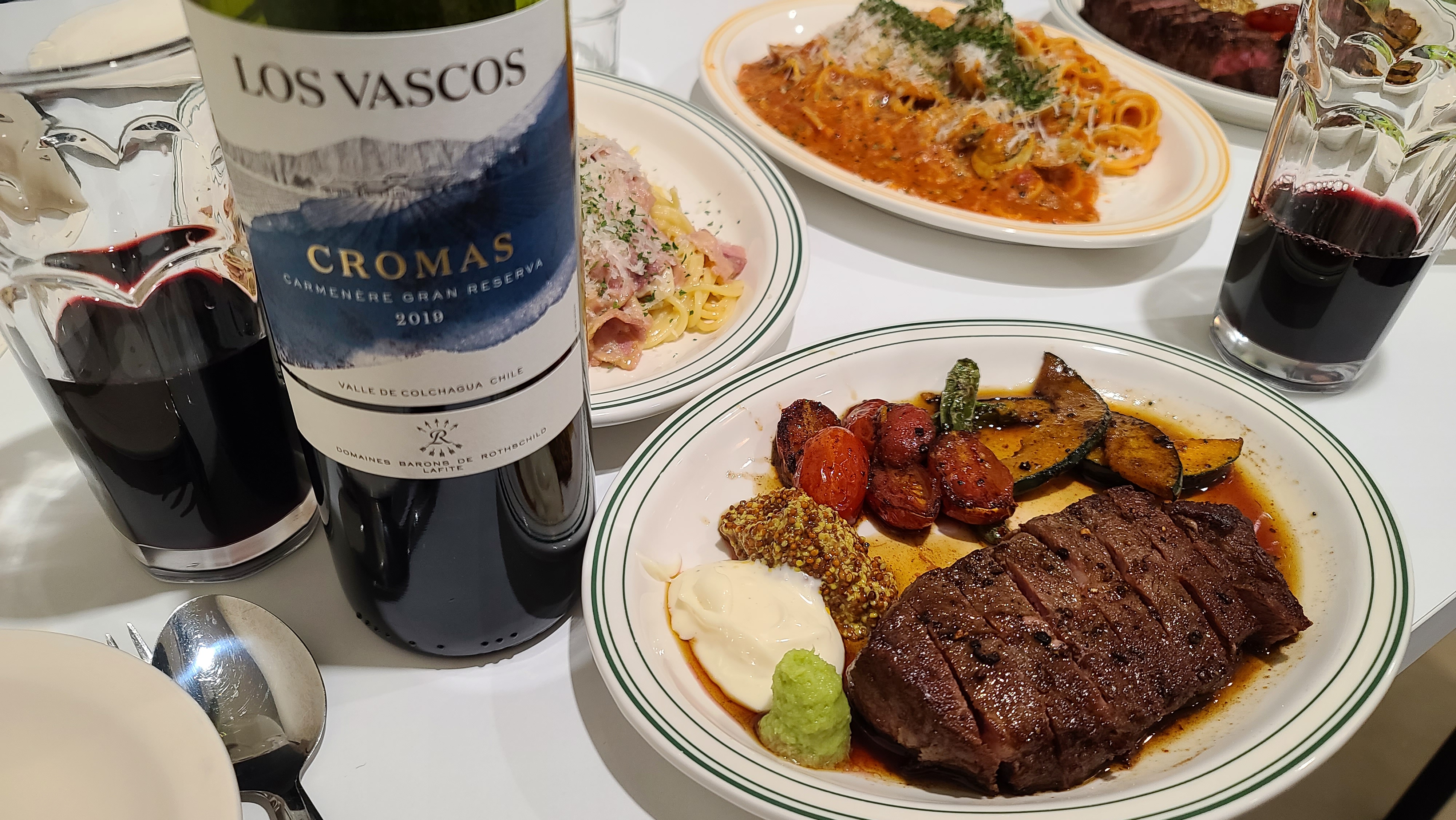 뒤를 이어 스테이크도 나와서 함께 사진에 담아봅니다. 큼직한 소고기를 미디엄 레어로 구워내고 그 위에 구운 채소들을 듬뿍 얹은 스테이크를 보고 있으니 저절로 입가에 미소가 띄어지는 것은 어쩔 수 없나 봅니다.