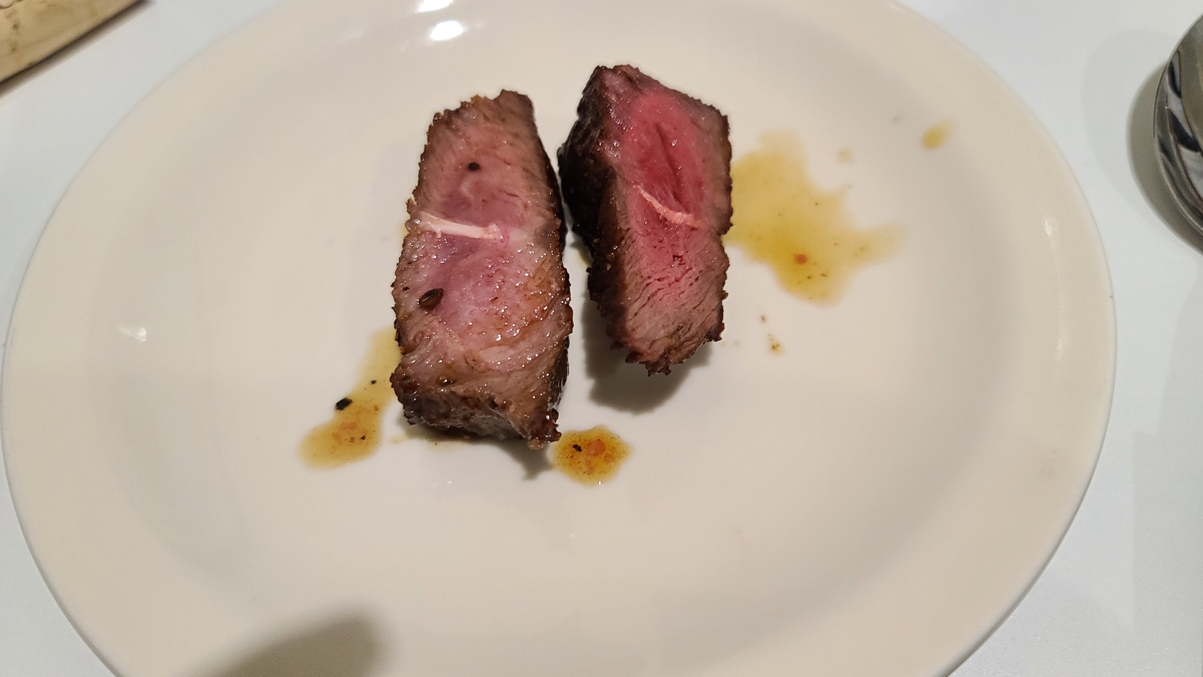 스테이크 고기를 자세히 살펴보니 겉을태워 육즙을 가둔후 속은 촉촉한 상태를 유지하는 핑크빛의 겉바속촉 미디엄레어의 상태를 유지하고 있습니다. 이런 스테이크에 와인을 곁들여야 글루타민의 맛이 제대로 느껴져서 감칠맛이 폭발하는 경험을 하게 되는 것입니다.