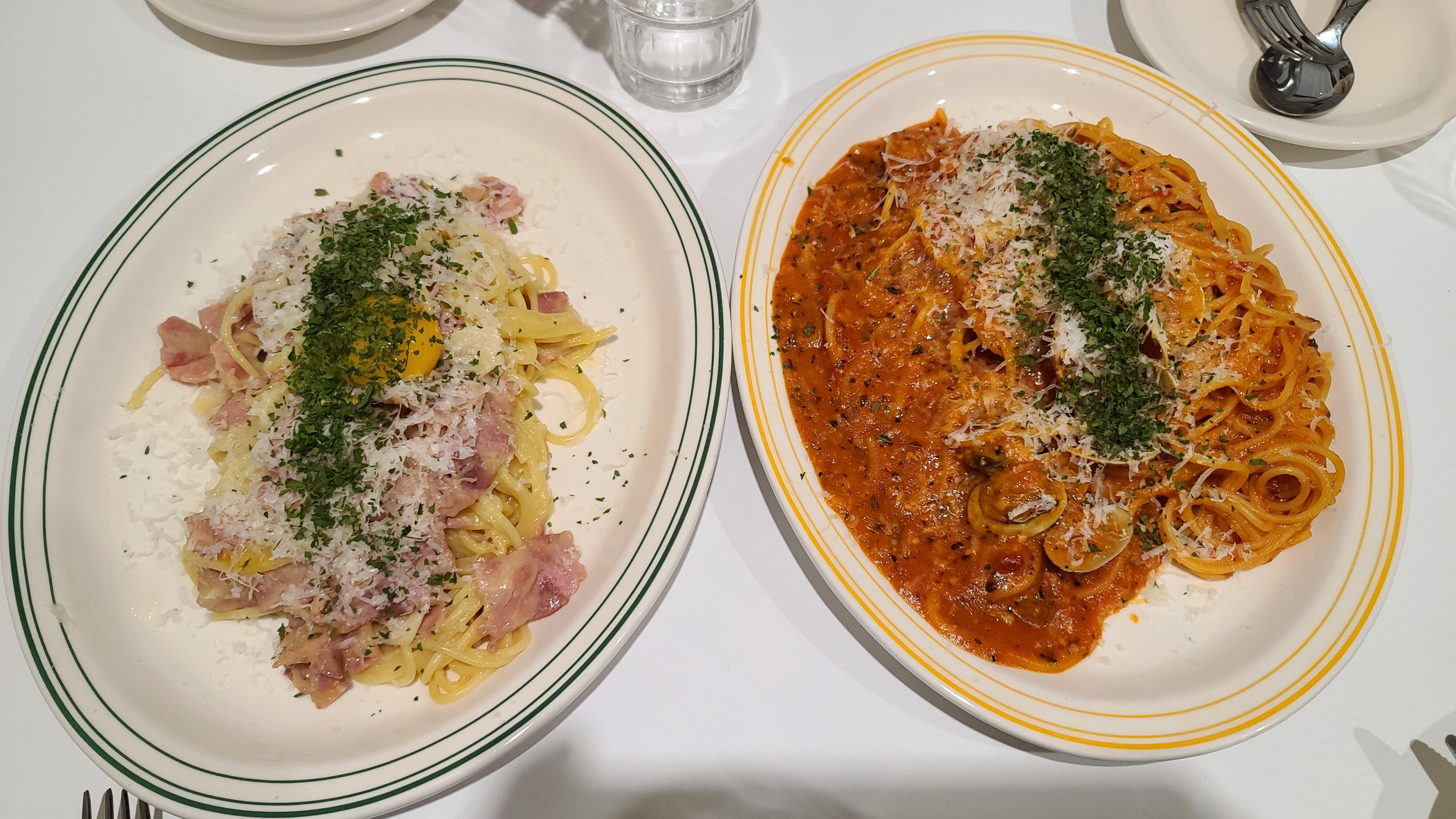 주문한 까르보나라와 시푸드 토마토 파스타가 나왔습니다. 먹음직스러운 비주얼에 계란과 파슬리까지 잔뜩 뿌려 매우 고급스러워 보이는 비주얼입니다. 벌써부터 맛이 기대가 되는 이탈리안 파스타 시리즈입니다.