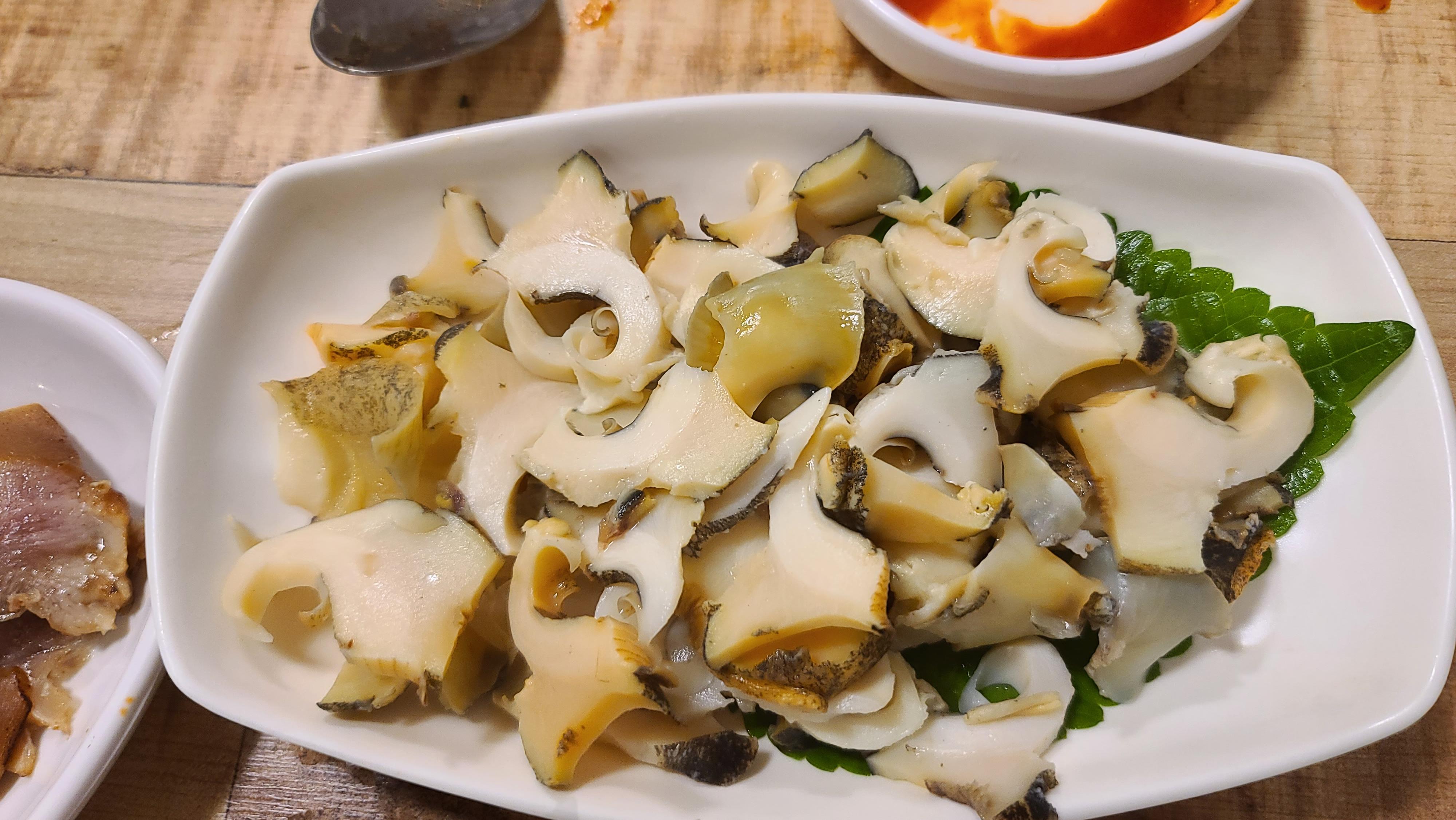 안주가 너무 맛있으니 계속해서 시키게 되는 마법이 일어납니다. 진한 고기맛을 보다보니 해물이 또 그리워져서 참소라를 주문해봅니다. 살짝 데쳐져서 바다의 향이 살아있는 참소라를 입안에 넣으니 짭짜름하면서 단맛이 입안에 가득 퍼집니다. 그리고 심심하면 한조각씩 머릿고기로 입맛을 바꿔봅니다. 극강의 조합에 감탄사만 퍼져 나오고 있습니다.
