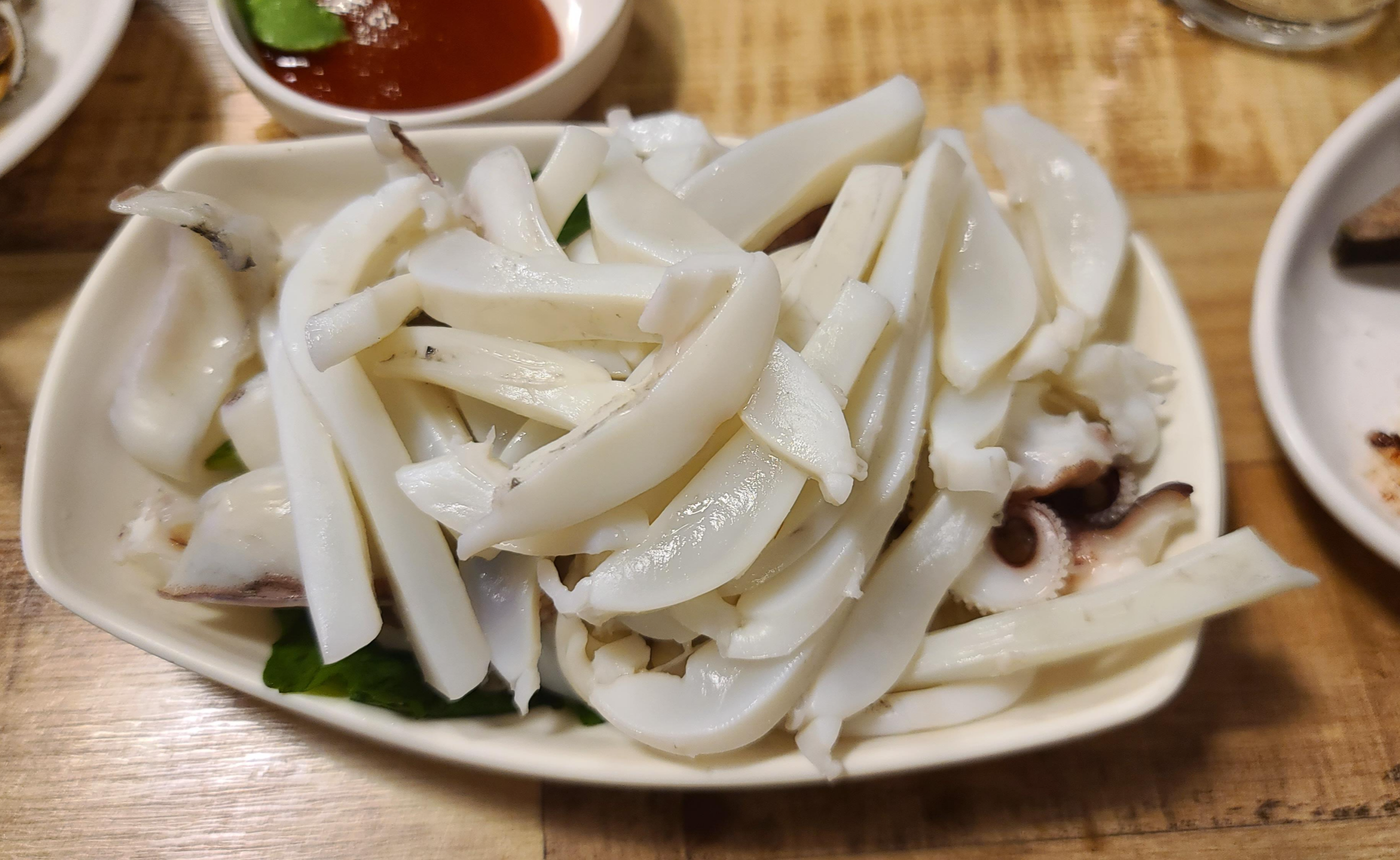 사장님의 추천 갑오징어가 나왔습니다. 빛나는 윤기에 오징어 특유의 향이 올라오고 있으며 눈으로 보기만 해도 탄력이 느껴지는 갑오징어의 비주얼에 또한 감탄하게 됩니다.