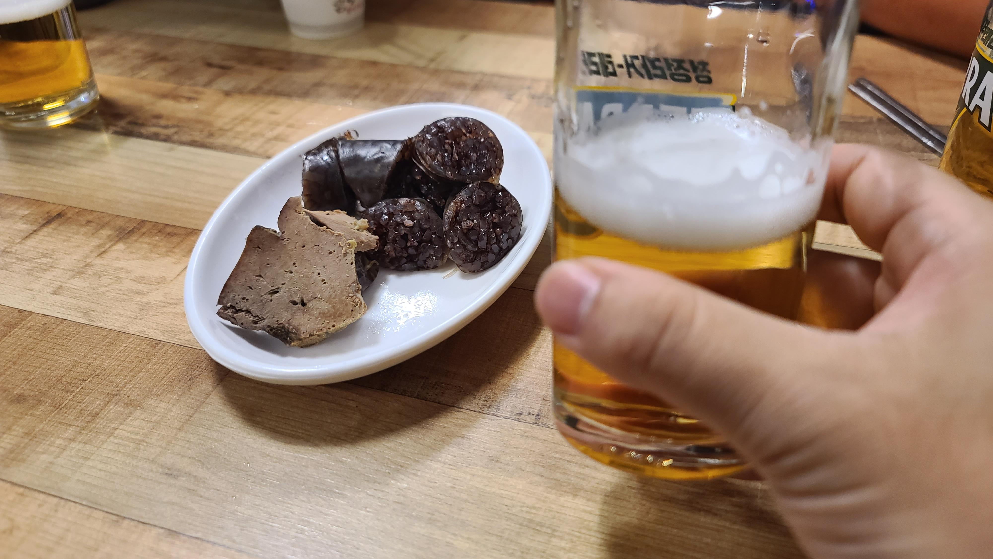 잠시 기다리자 순대와 간이 기본안주로 나오고 주문한 소맥이 나왔습니다. 순대와 간을 기본안주로 주다니 매우 센스가 느껴지는 부분입니다. 맛을보니 진한 감칠맛이 살아있는게 이것만으로도 술2병은 먹을 것만 같은 훌륭한 맛입니다.