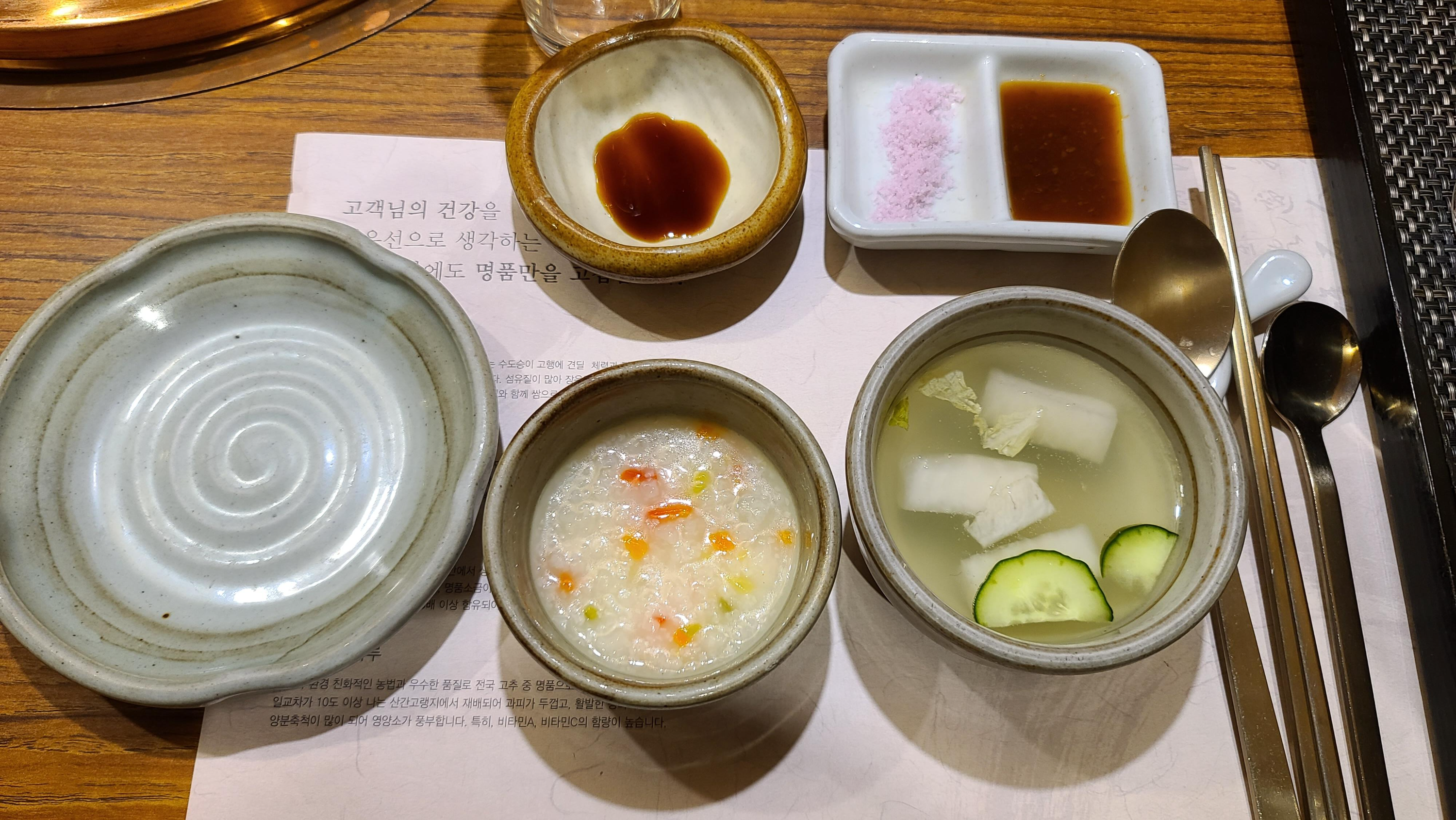 코스가 시작되고 처음으로 죽과 동치미를 가져다 주십니다. 가볍게 끓여낸 야채죽으로 심심하지만 속을 데우고 식욕을 돋울수 있는 동치미와 함께하니 그럭저럭 괜찮습니다. 제법 소소한 스타트라고 생각됩니다.