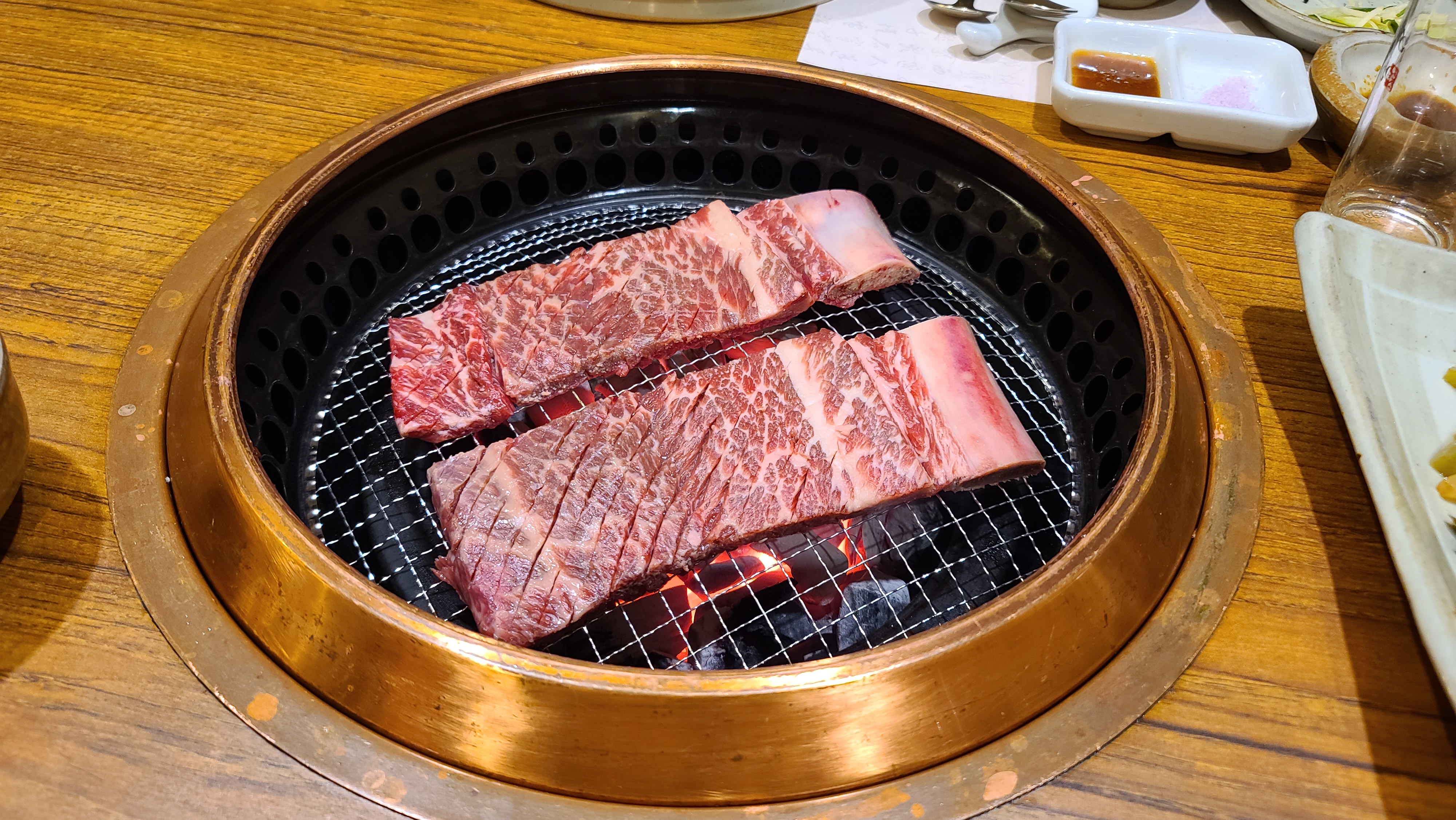 코스요리를 어느정도 비우자 불판이 세팅되고 오늘의 메인 소고기 생갈비가 나왔습니다. 눈꽃이 핀것과 같은 마블링이 눈을 사로잡는 생갈비의 비주얼에 감탄하며 자세히 살펴보니 접착제로 붙이지 않고 갈비살을 얇게 져며 칼로 펴낸 리얼 생갈비의 모습에 감탄을 하게 됩니다.