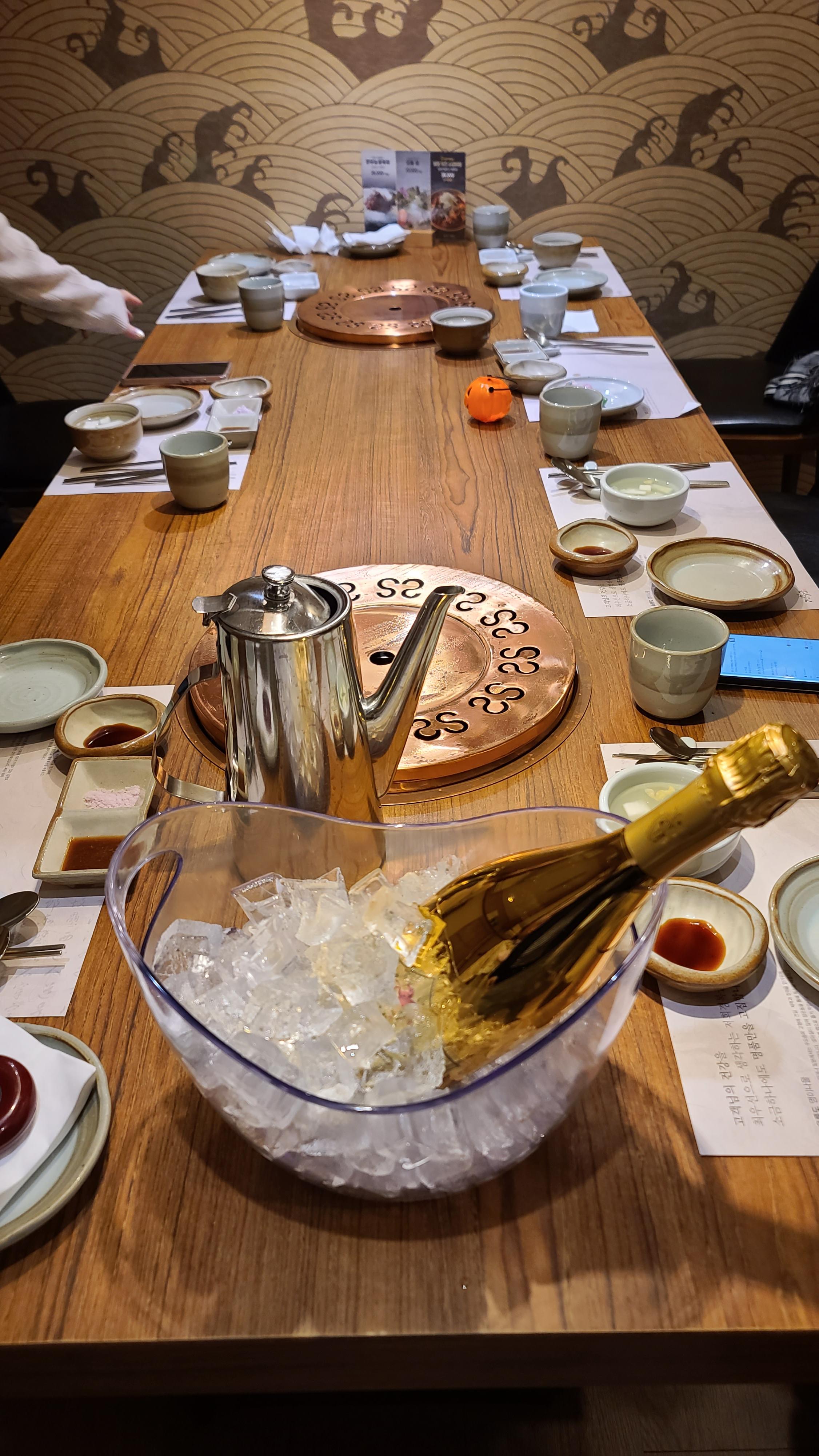 이렇게 좋은 자리에 축하주가 빠질 수는 없습니다. 가져간 황금빛 샴페인을 세팅해달라고 부탁하니 아이스버킷에 세팅해주시는 세심함도 보입니다. 주류 콜키지를 문의하니 병당 2만원을 받고 있어 강북에서는 조금비싸지만 평균적인 가격을 받고 있습니다.