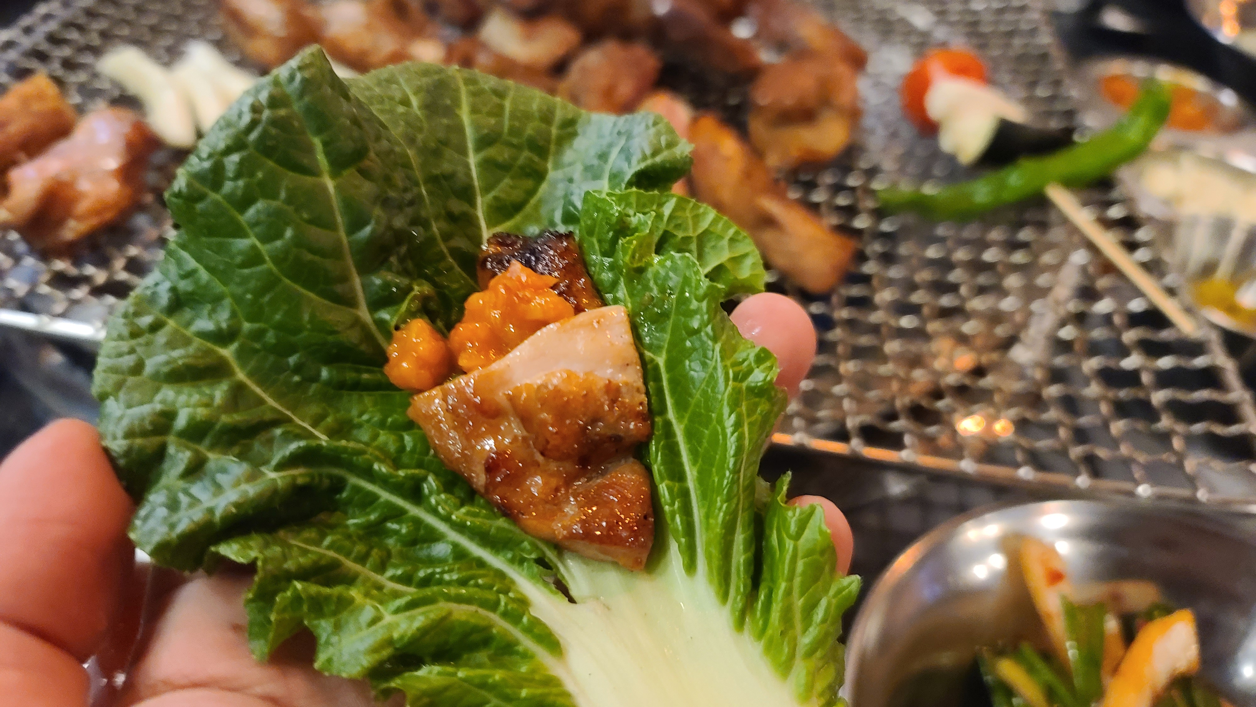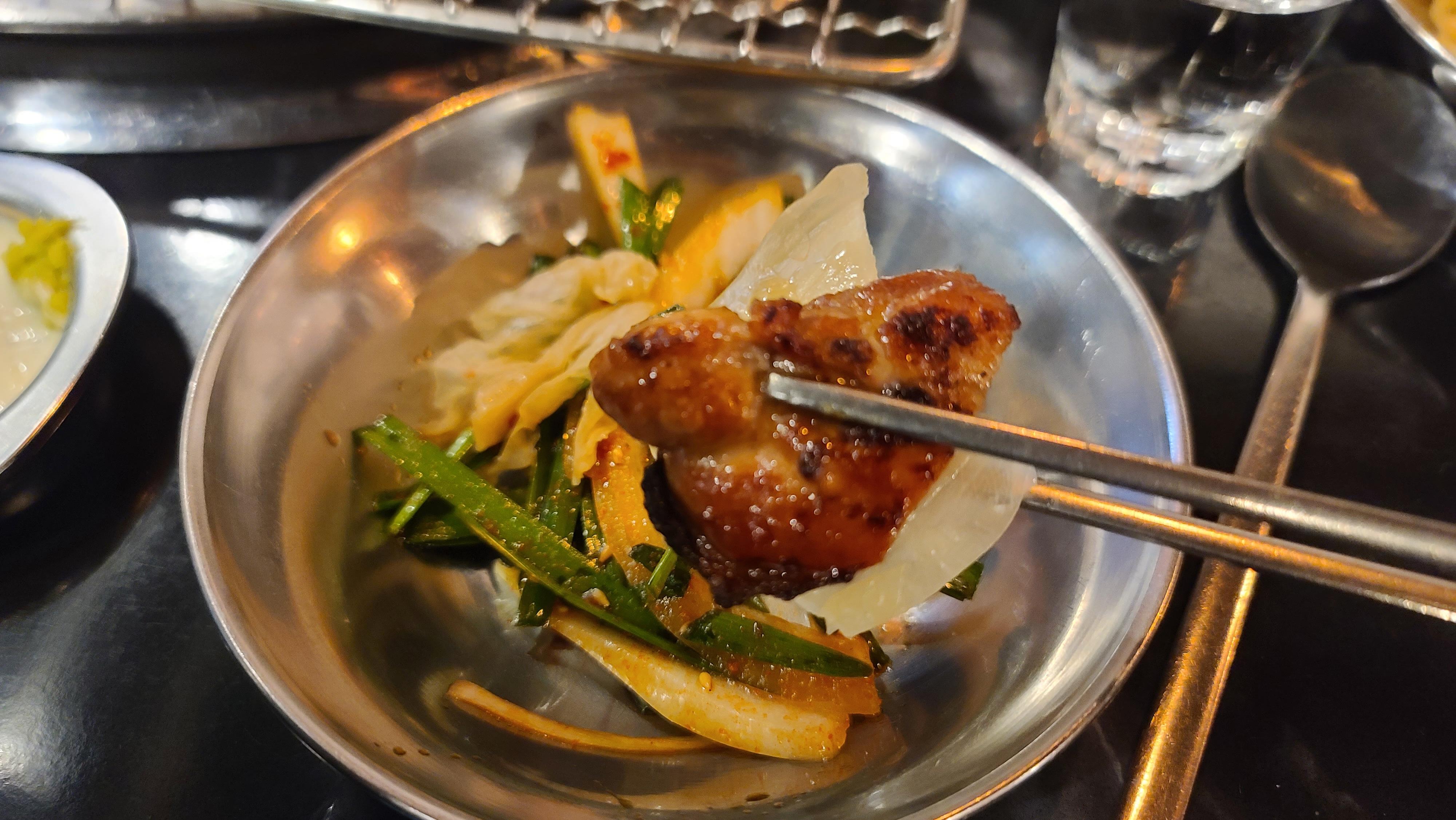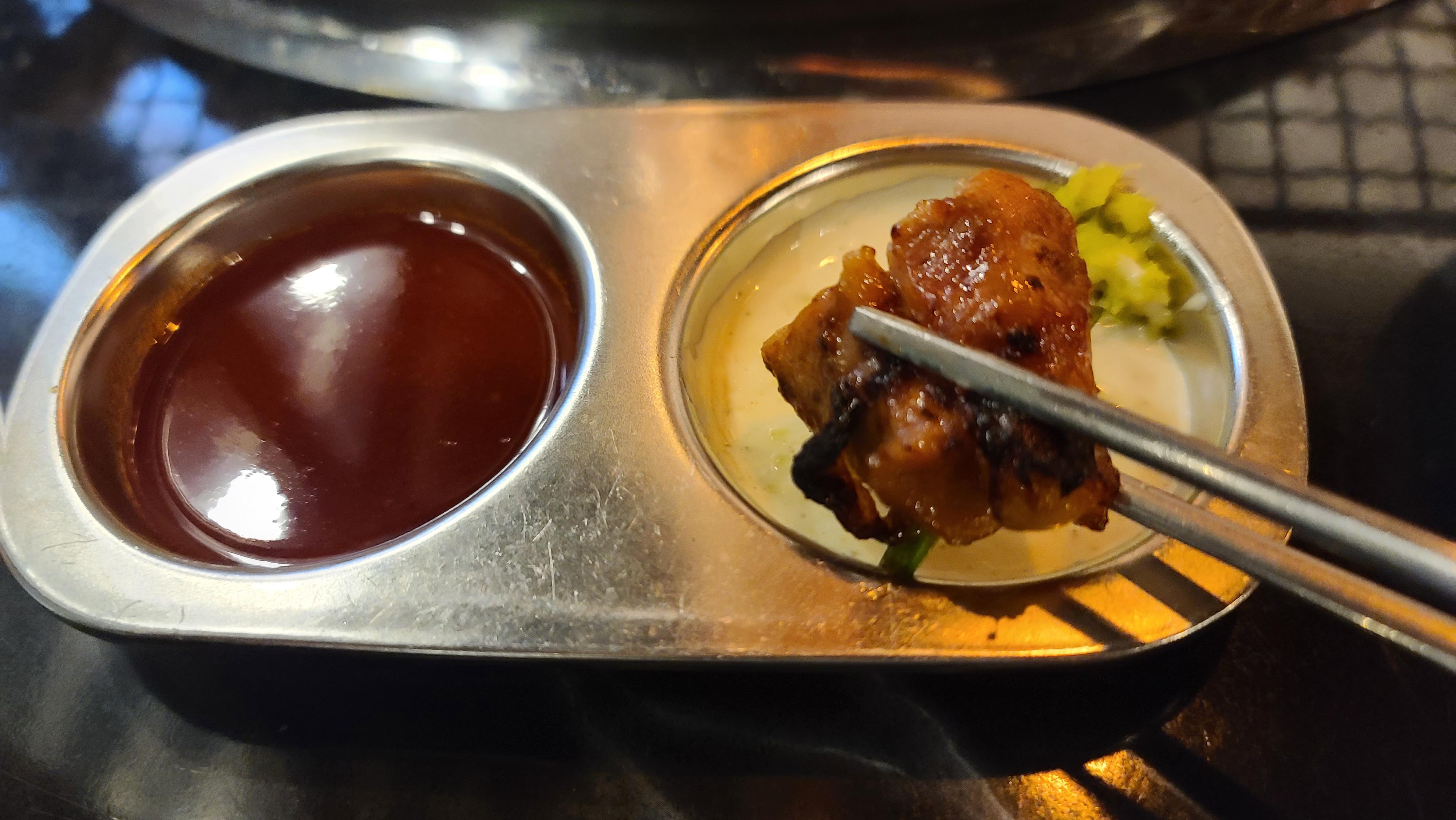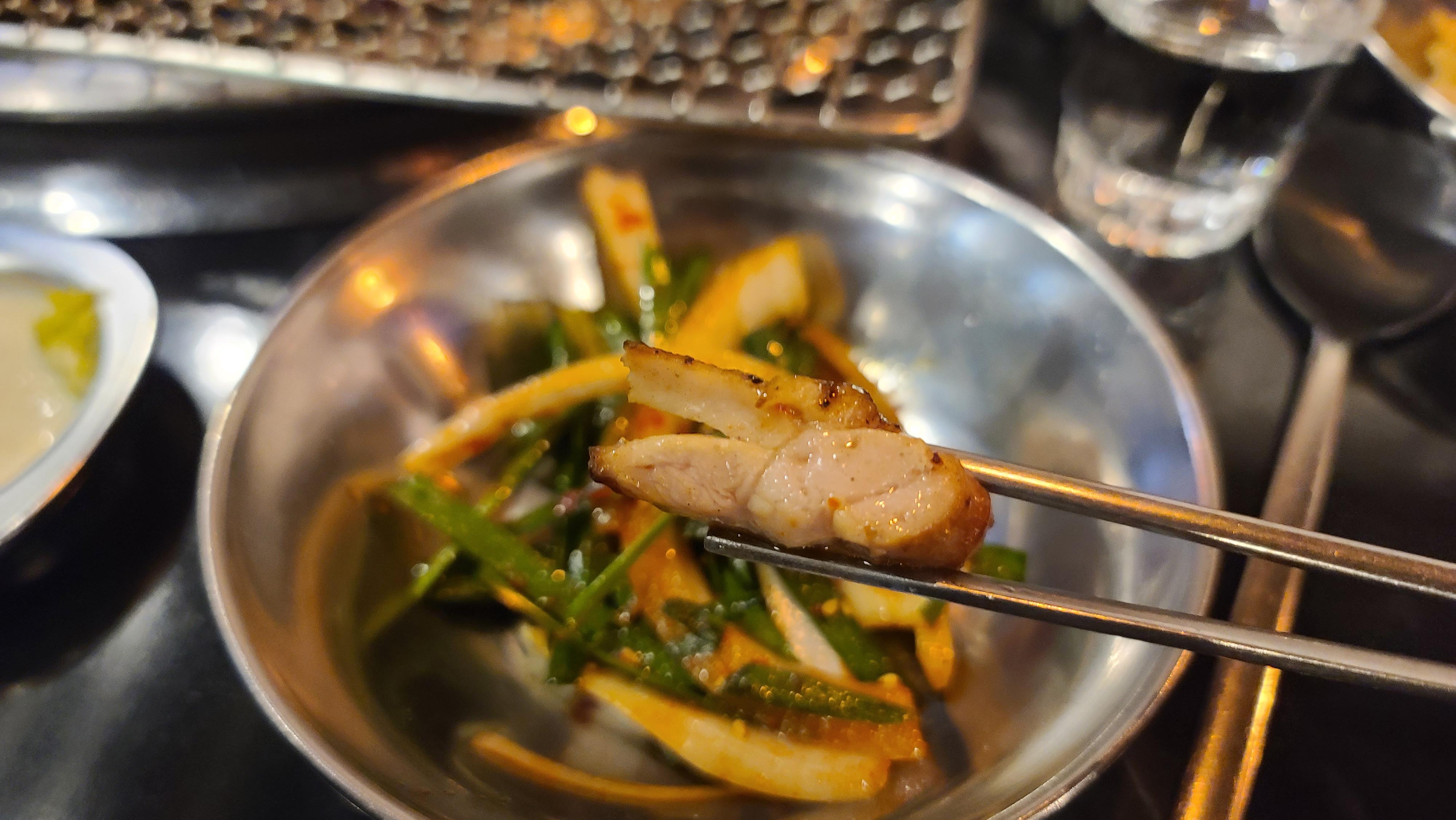 자 이제 시식의 시간 맛있게 구워진 닭갈비를 그냥도 먹어보고 야채와 함께 곁들여서도 먹어보고 같이 내어준 매콤 혹은 달콤한 소스에 찍어서도 맛을 봅니다. 역시나 양념의 감칠맛이 닭갈비에 잘 배어들고 염지가 구석까지 잘되어서 씹을수록 감칠맛이 입안에서 이중 삼중으로 느껴지게 됩니다. 역시 숨겨진 맛집은 입소문이 저절로 나는구나 하는 것을 느끼게 되는 순간입니다.