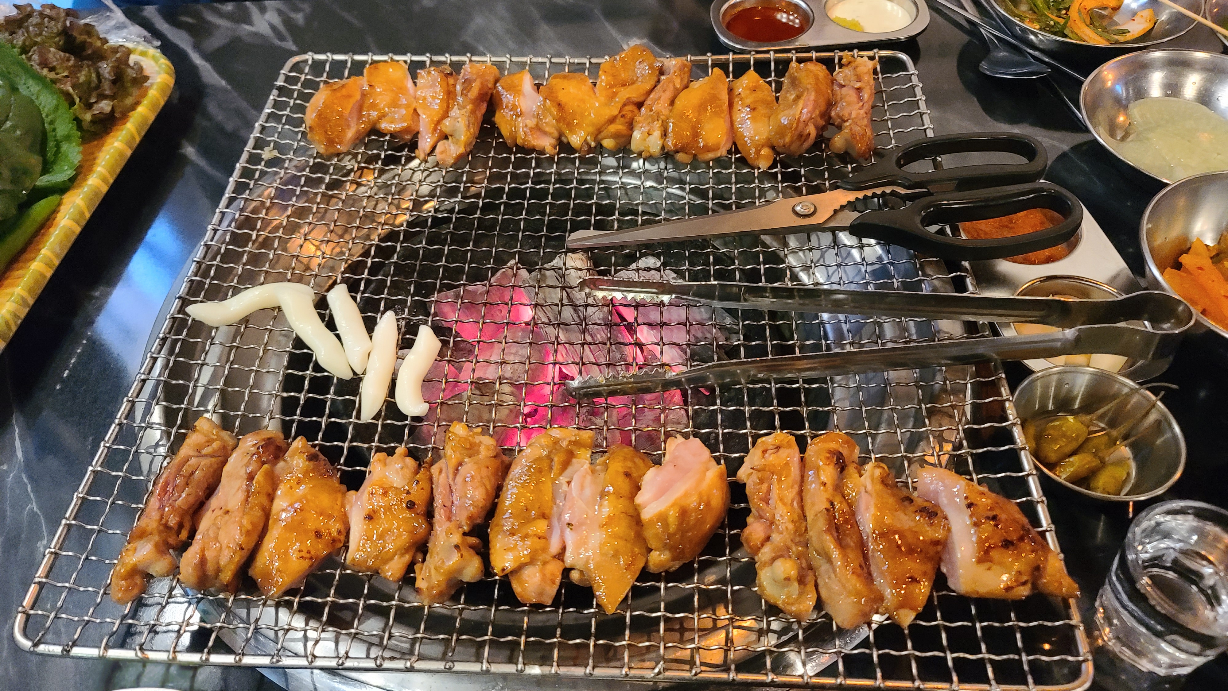 닭갈비를 먹을만큼 화력이 좋은 불판 가운데에 굽고 서비스로 주신 야채꽂이도 함께 맛있게 구워가며 인내의 시간을 가집니다. 숯불에 소스가 달짝지근하게 타오르며 내는 단내음에 저절로 미소가 지어지며 마음을 사로잡게 됩니다.