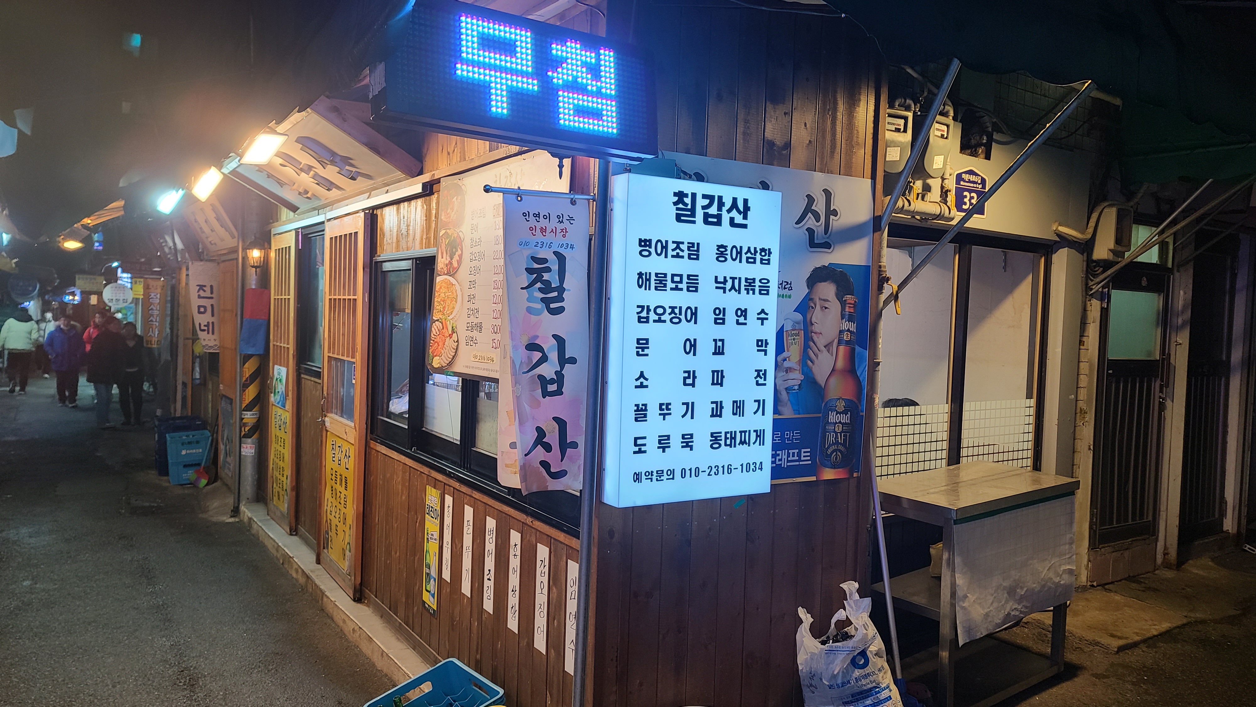 맛집이 즐비해있어 즐겨찾는 충무로역 8번출구 근처의 인현시장을 둘러보며 오늘은 무엇을 먹을까 살펴보다가 메뉴판에서 흥미로운 안주를 발견합니다. '꼴뚜기' 겨울철 별미이기도 하지만 서촌계단집같이 회전률이 빠르고 유명한 집에서만 먹을수 있다는 꼴뚜기가 써있어서 홀린듯이 가게를 담아봅니다. 칠갑산 무엇인가 토속적인 이름에 홀리듯이 가게안으로 들어가보게 됩니다.