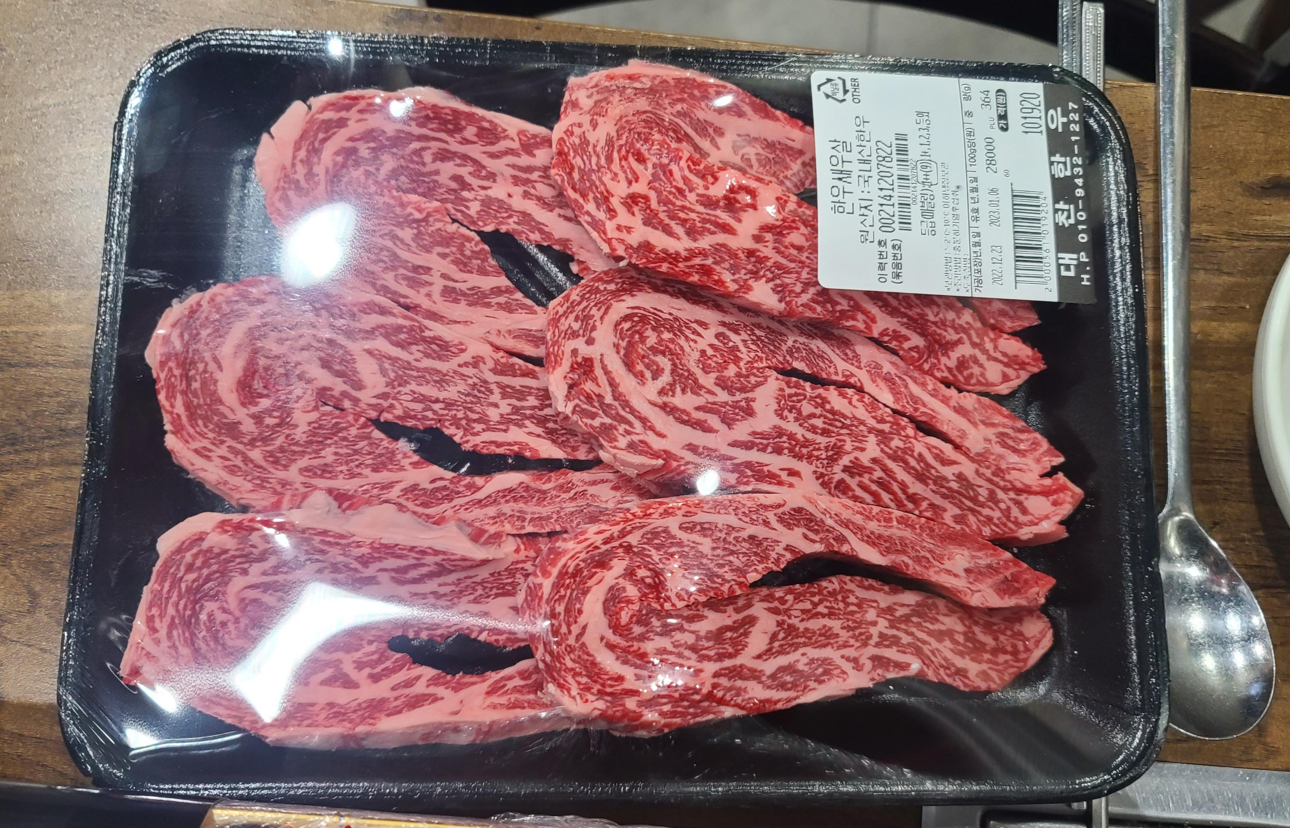 자리를 잡고 쇼핑한 한우를 꺼내서 자태를 살펴봅니다. 꽃등심, 살치, 안창, 갈비 등 여러부위를 맛볼 수 있는 한우 모듬과 가장 맛있다고 추천을 해주신 새우살의 모습입니다. 새우살은 100g 당 28,000원 수준으로 축산시장에서 바로 사도 최고 등급 수준의 가격대를 보여줍니다.