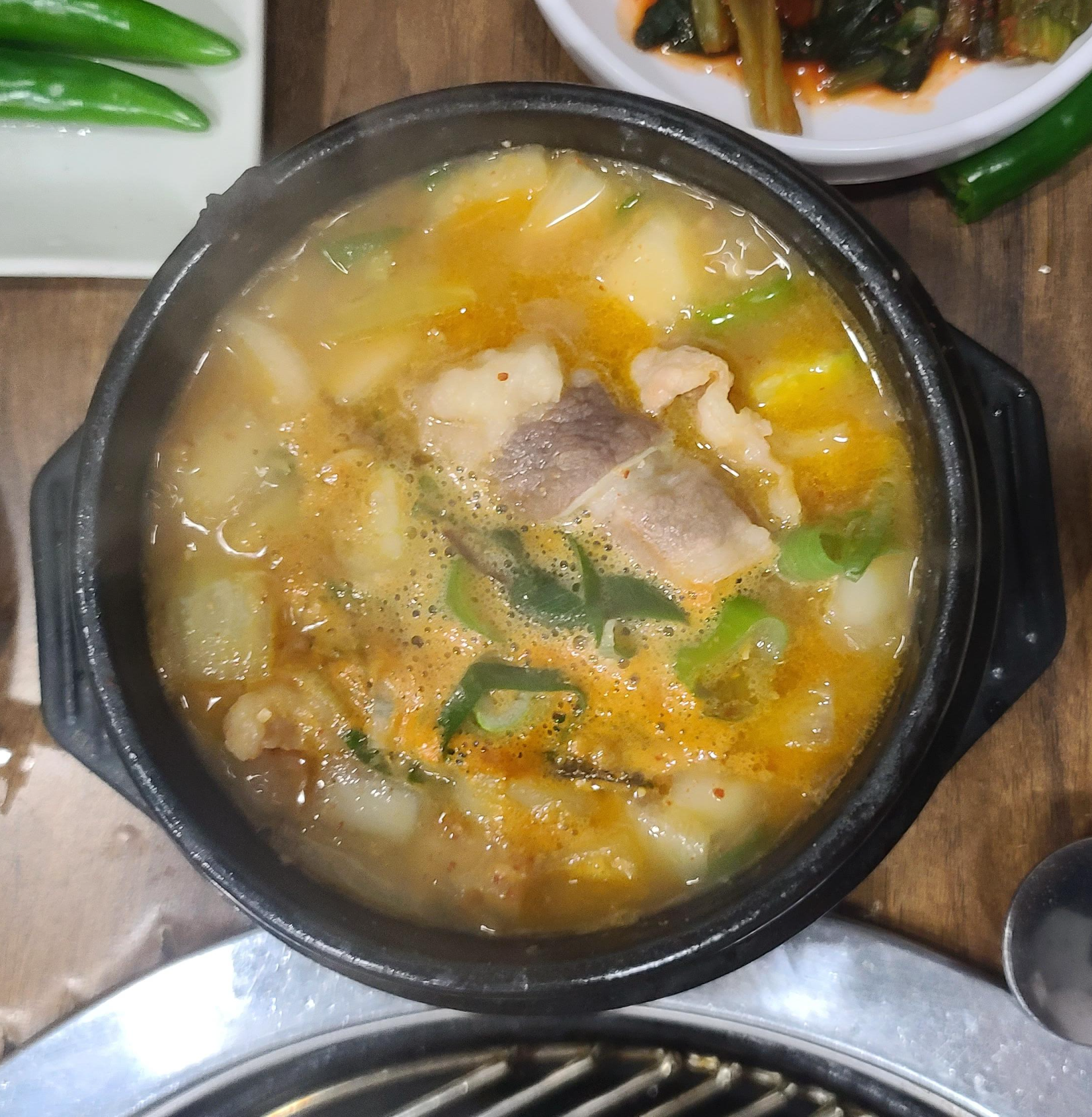 식당에서 별도의 상차림비를 내니 숯불과 야채, 반찬을 세팅해 주십니다. 서비스로 받은 차돌박이를 구우며 가볍게 입맛을 다져봅니다. 하지만 최종 보스가 기다리고 있으니 많이 먹지는 않고 찌개에 넣기로 합의를 봅니다. 최종보스 새우살을 먼저먹자고 손가락으로 가리키는 모습이 우습게 잡힌 모습입니다.