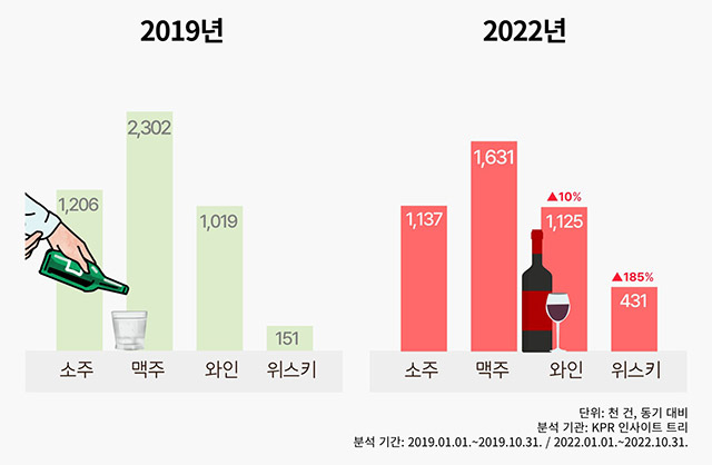 스탠더드급의 저렴한 위스키는 탄산수 혹은 토닉워터와 함께 섞어서 마시는 하이볼이라는 음용형태로 매우 큰 인기를 끌고 있으며, 하이볼 형태로 마실경우 맛과 향은 그대로 유지하면서 양이 많아지는 극강의 가성비로 홈술, 캠핑, 파티 등에서 자주 음용되는 형태이기도 합니다. 트렌드와 가성비의 흐름을 타고 위스키는 200%가까운 성장률을 보이며 순위가 급격히 상승하고 있는 편의점 주류입니다.