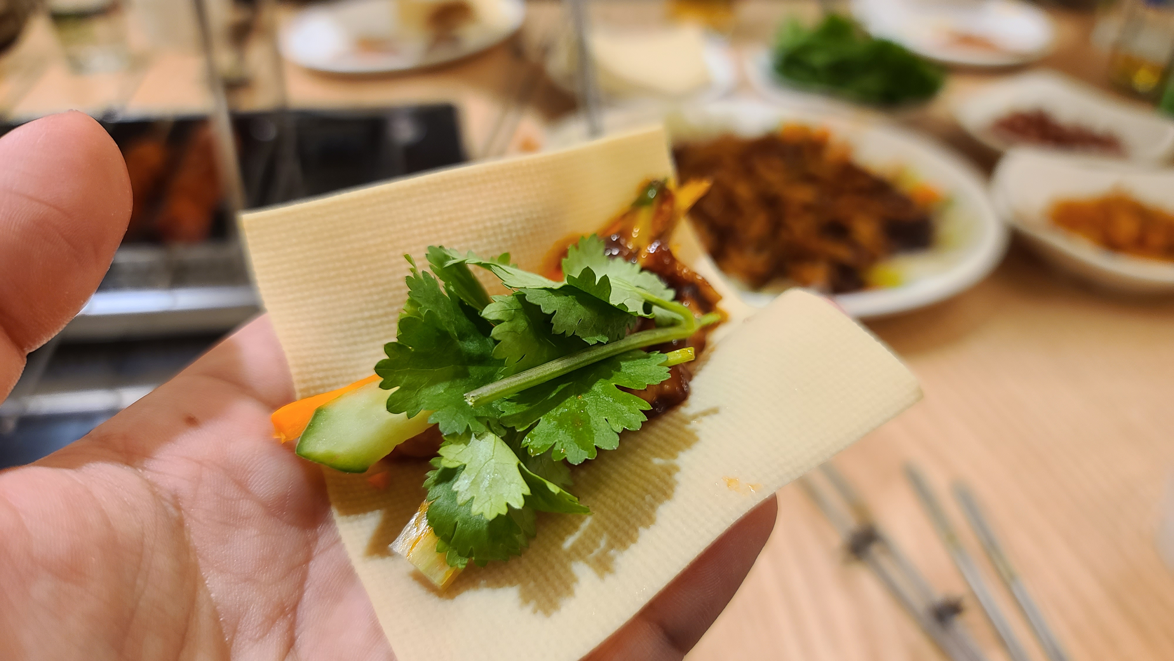 양꼬치에 이어서 별도로 주문한 요리 경장육슬도 나왔습니다. 파, 당근, 오이 등의 야채가 원형으로 둘러져 있고 가운데로 조리된 고기가 올려져 있어 아름다운 비주얼을 보여주는 요리로 건두부에 싸먹는 맛이 매우 일품인 요리입니다.