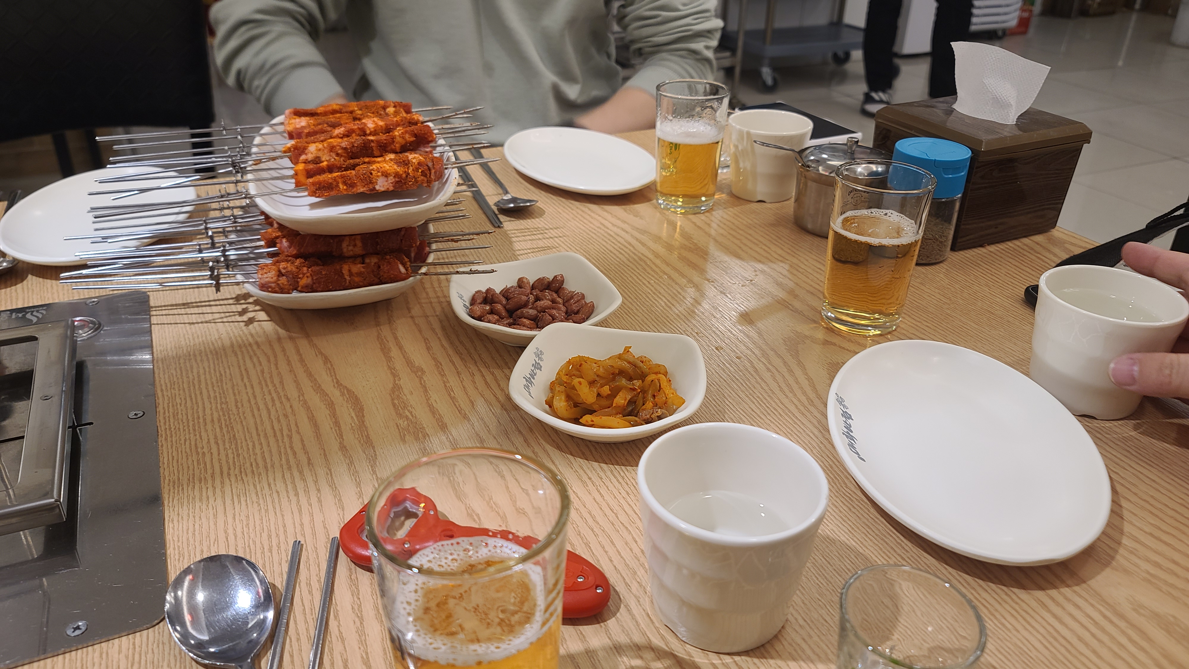 기본으로 나오는 땅콩, 짜사이에 맥주를 한잔하고 있으니 숯불과 양꼬치가 세팅되었습니다. 양꼬치를 자세히 살펴보니 오랜만에 왔는데도 비계가 별로 없이 살코기로 가득채운 비주얼이 벌써부터 식욕을 자극하고 있습니다.