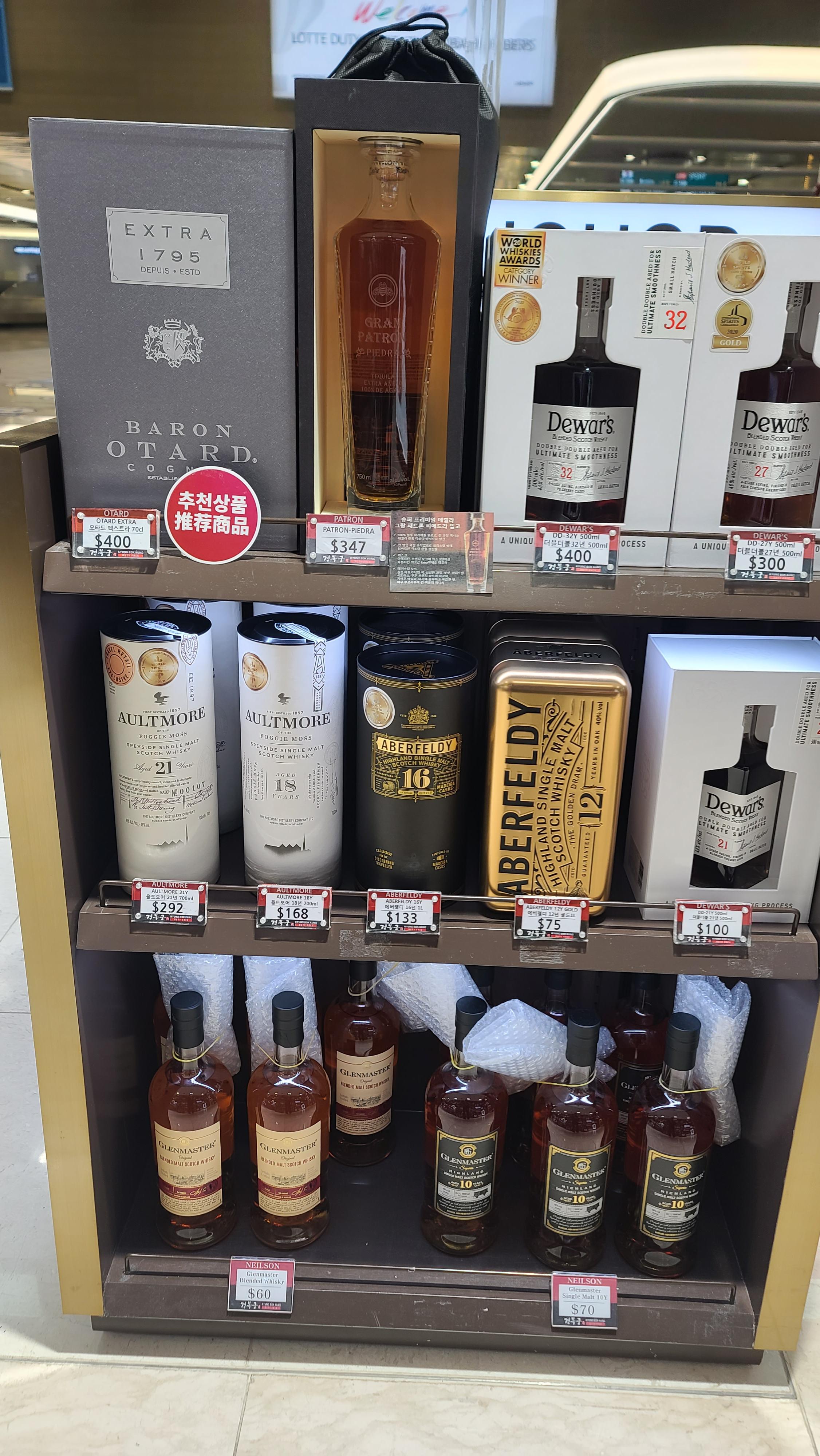 로얄 브랙크라, 올트모어, 글렌리벳, 아버펠디의 위스키 시리즈 제품들과 하디 코냑 그리고 다시 폴존, 롱몬, 캐퍼도닉 위스키 등 다양한 제품들이 모여있는 위스키 매대가 참으로 이색적으로 보입니다. 다양한 가격대에 다양한 주류 면세점 쇼핑이 즐거워지고 있습니다.