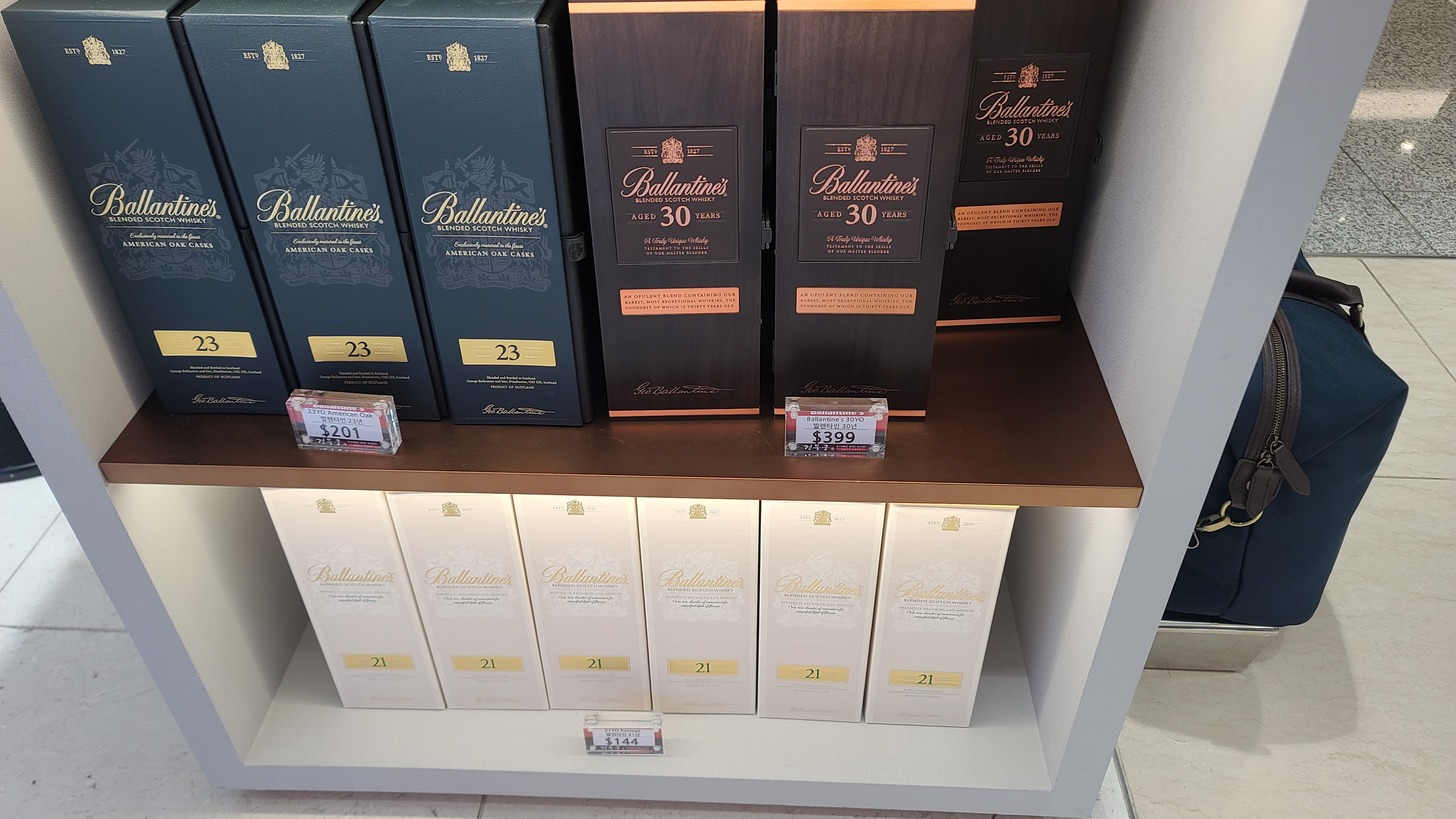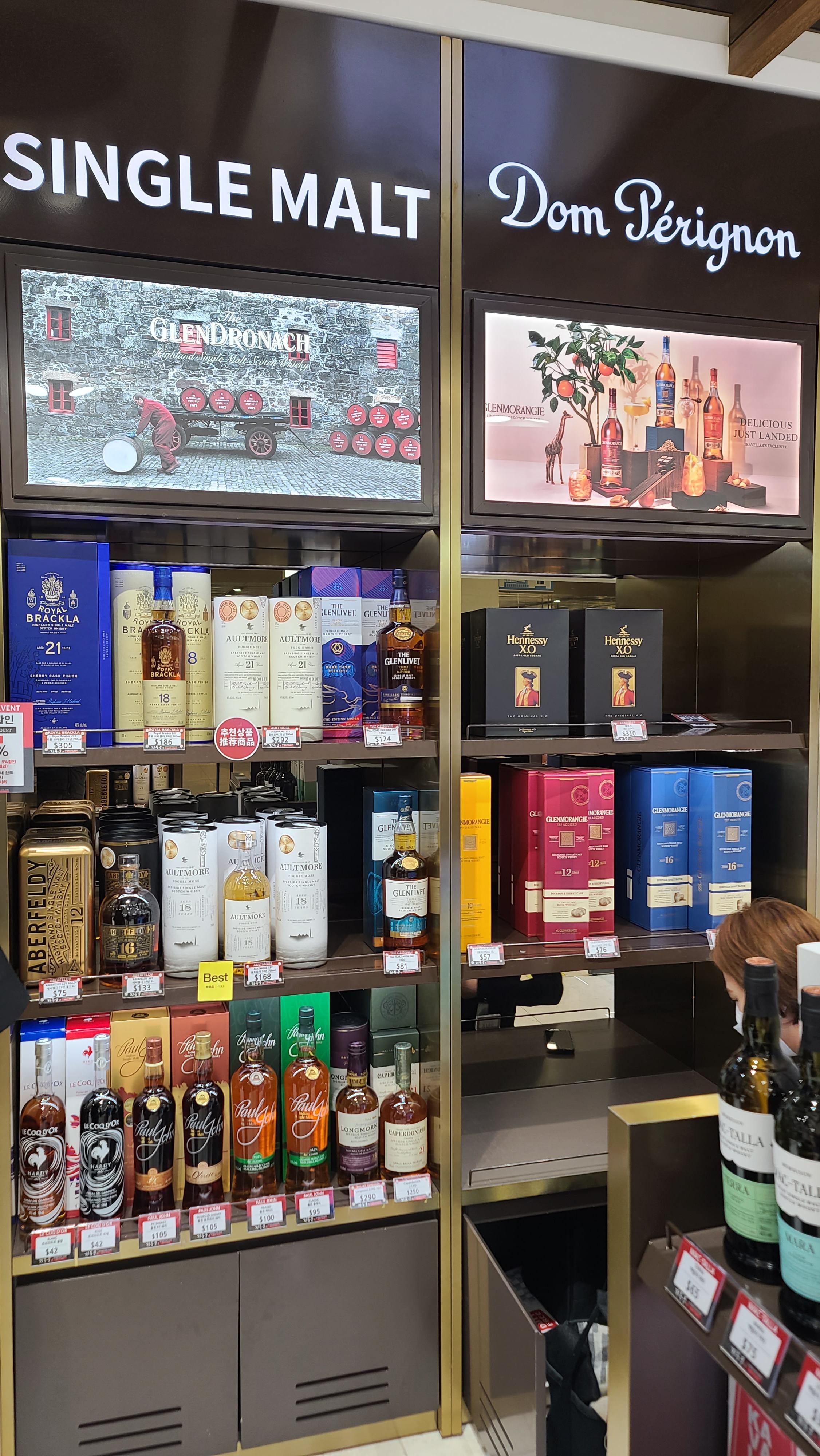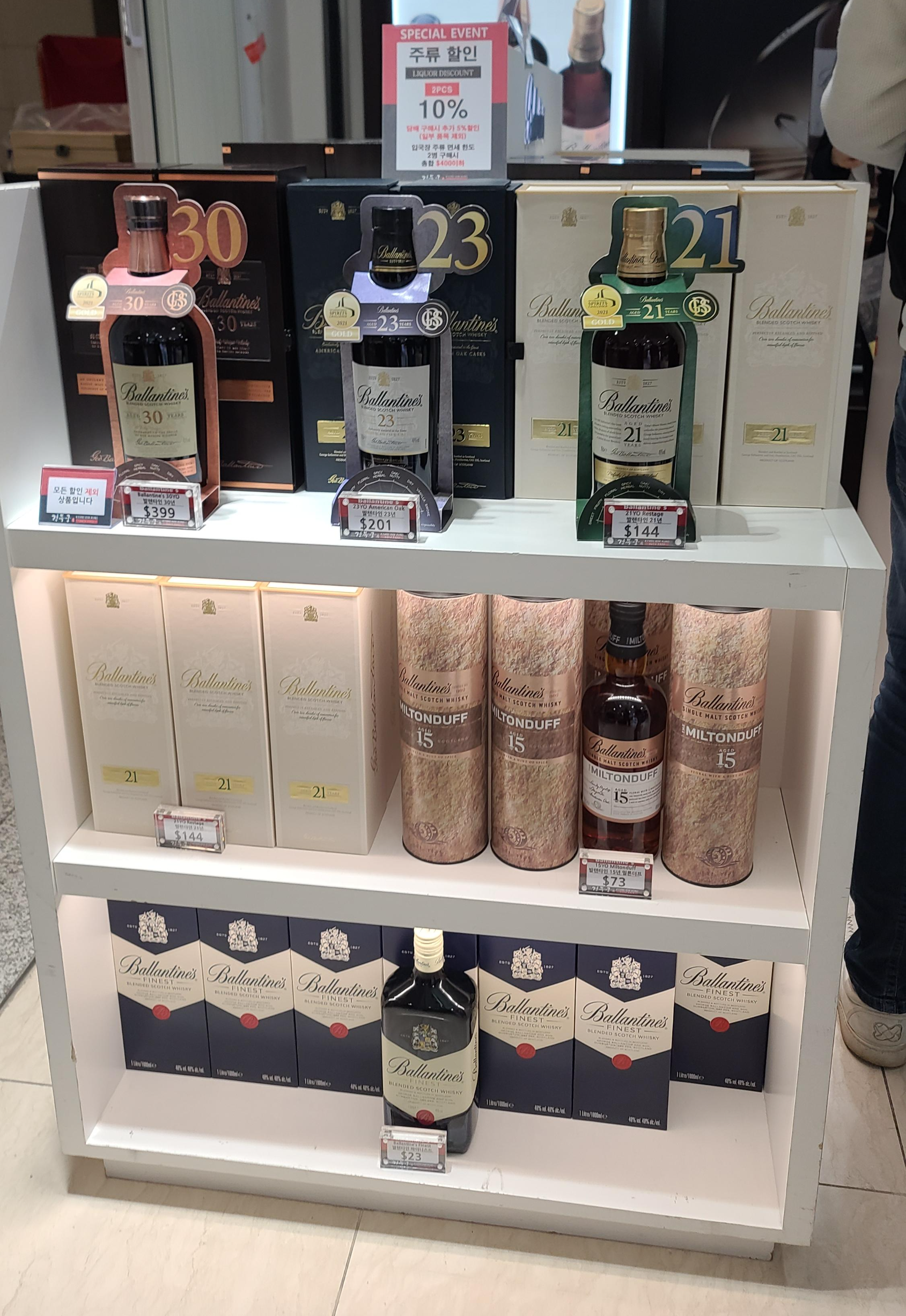 옆쪽으로는 면세점 위스키의 제왕 발렌타인 제품들이 다양하게 진열되어 있는 모습입니다. 역시 많이 팔리는 제품답게 입국장 면세점에서도 별도의 할인 프로모션을 하는 매우 공격적인 마케팅을 하는 것을 볼 수가 있습니다.