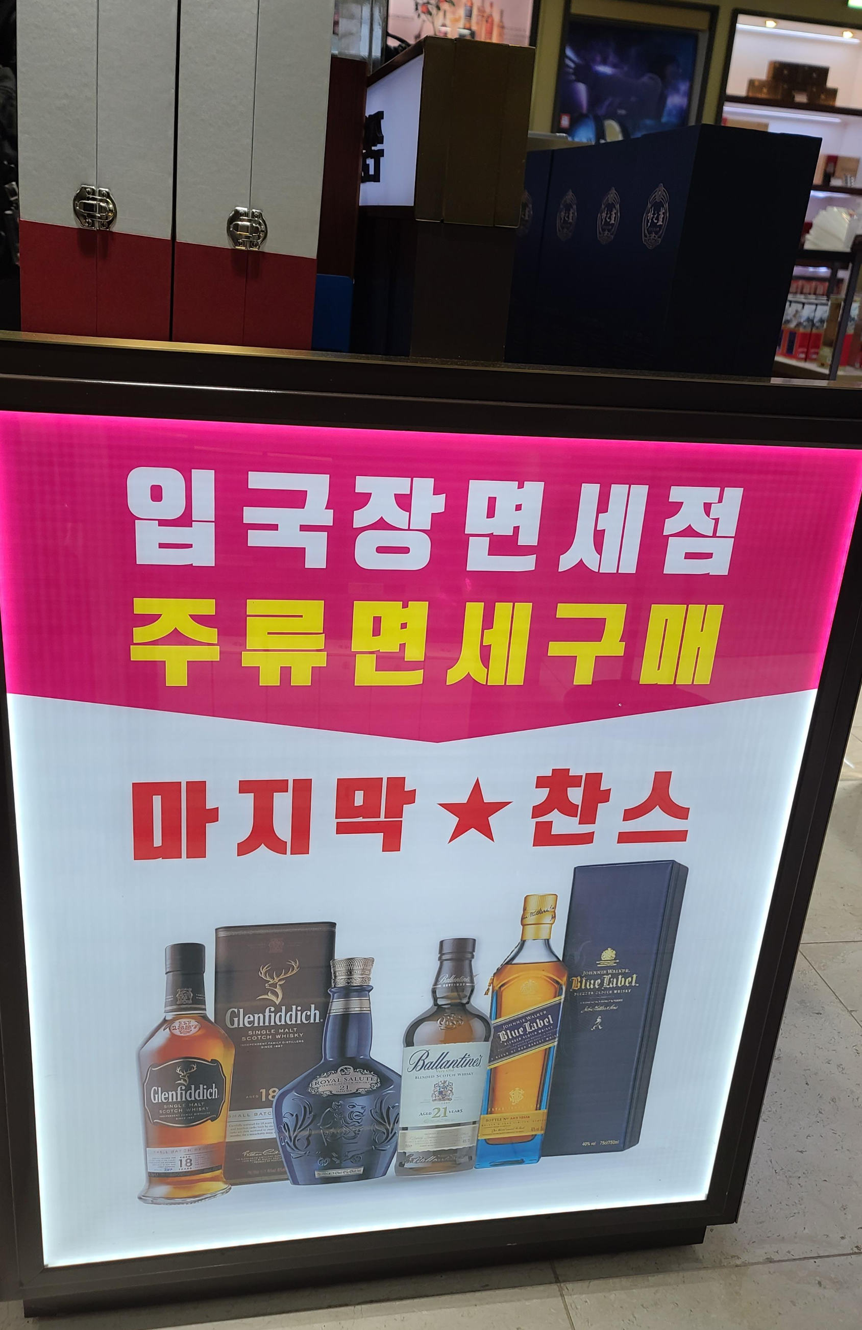 주류블로거답게 입국장 면세점의 주류 코너를 자세히 살펴보기로 합니다. 주류코너 앞을 살펴보니 주류면세구매 마지막 찬스라는 문구가 다시는 술을 못구해서 어서 사고 싶게 만드는 아주 눈에띄는 카피로서 소비자들의 구매욕을 자극하고 있는 것을 볼 수 있습니다.
