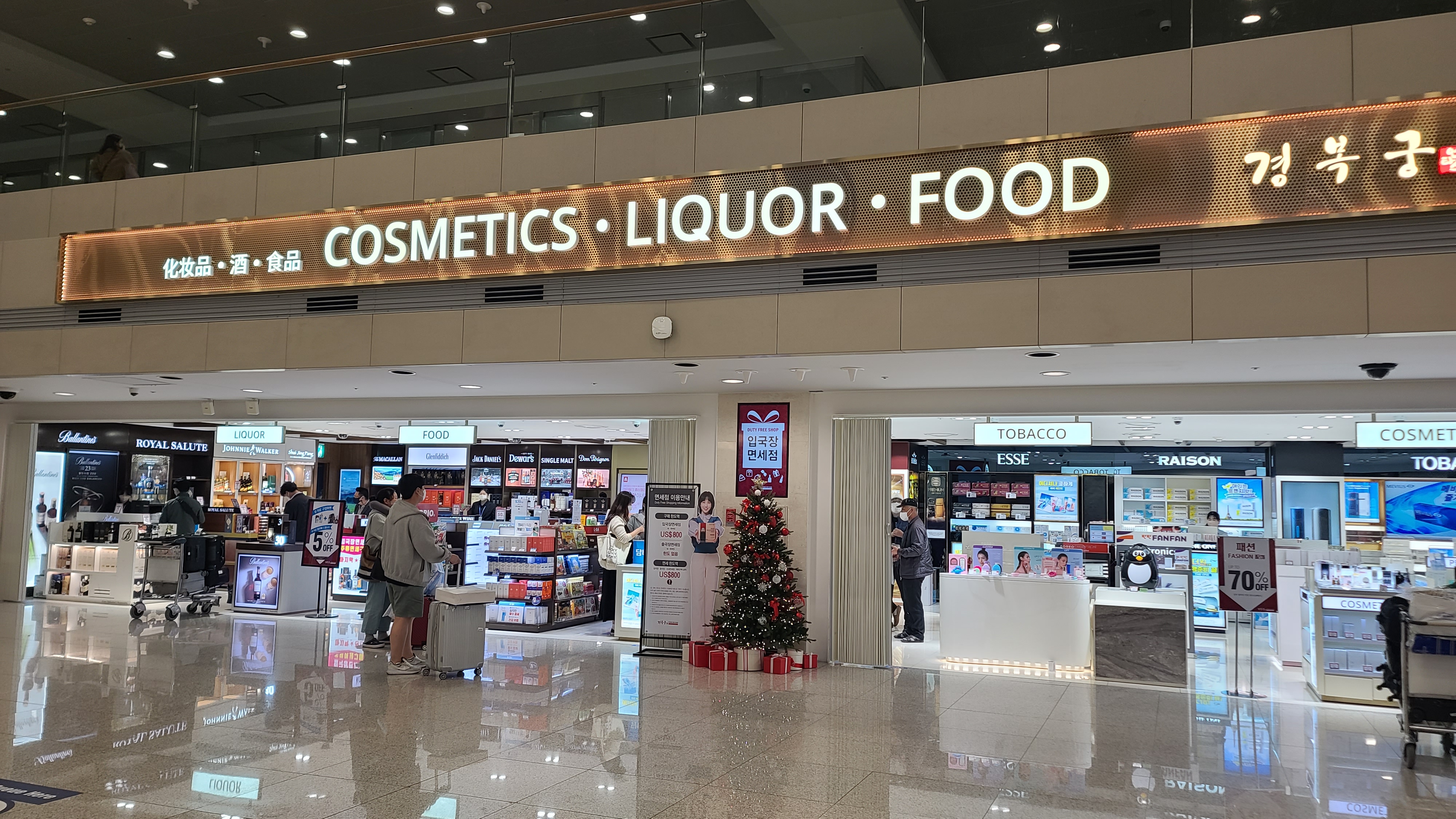 인천공항 입국 면세점인 경복궁 매장의 모습을 담아봅니다. 입국장 면세점이라 사이즈가 크지는 않지만 가장 많이 판매되는 면세물품인 술, 담배, 그리고 화장품이 주로 진열되어 있는 모습입니다.