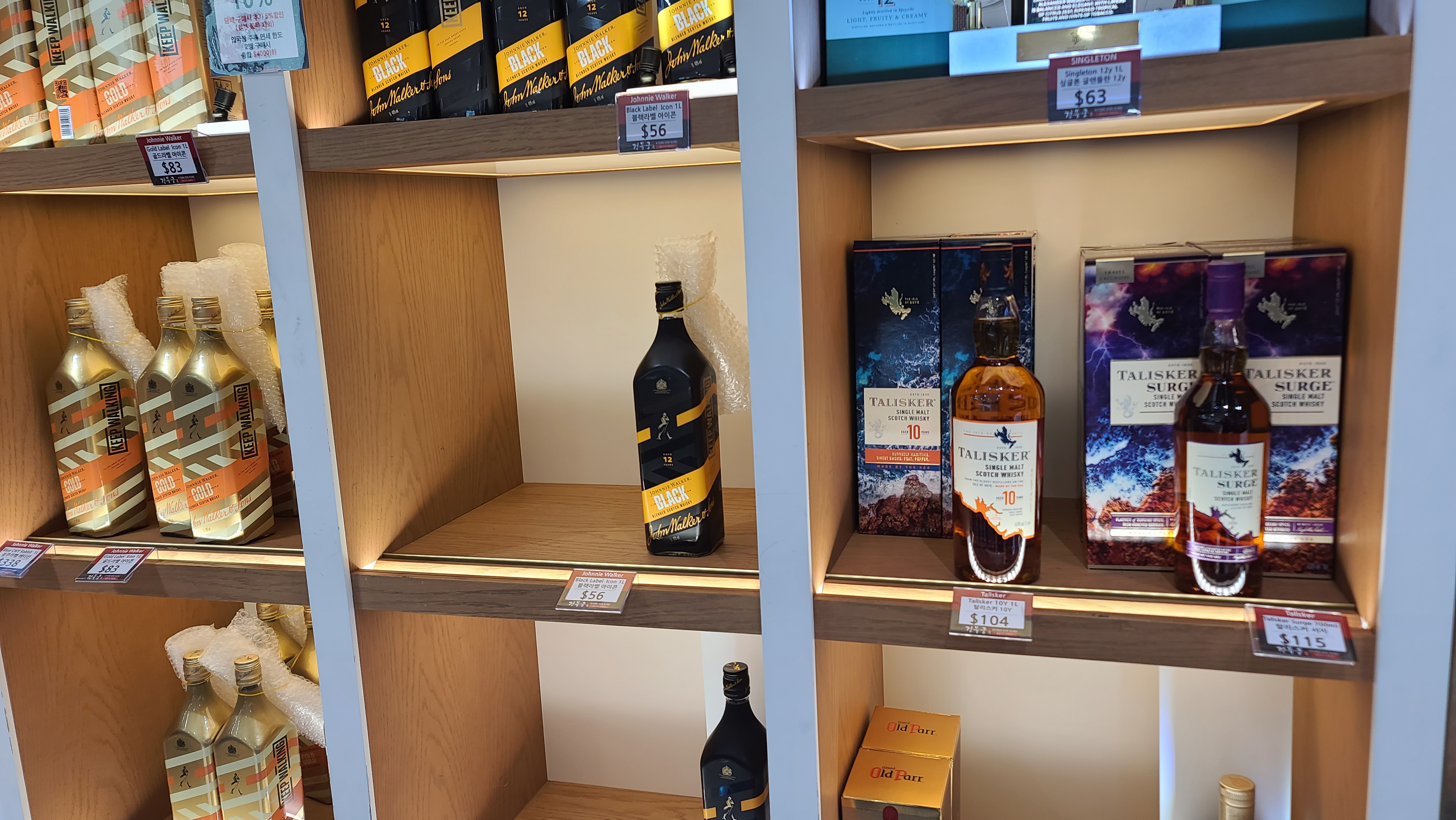 면세점 주류매대 가장 정면으로 디아지오의 조니워커와 싱글톤 그리고 탈리스커 시리즈가 진열되어 있는 것이 보입니다. 조니워커 블랙 $56, 골드 $83, 싱글톤 12년 $63, 탈리스커 $104~115 까지 가격대가 보이고, 전설의 올드파 위스키까지 진열되어 있는 것이 인상적입니다.