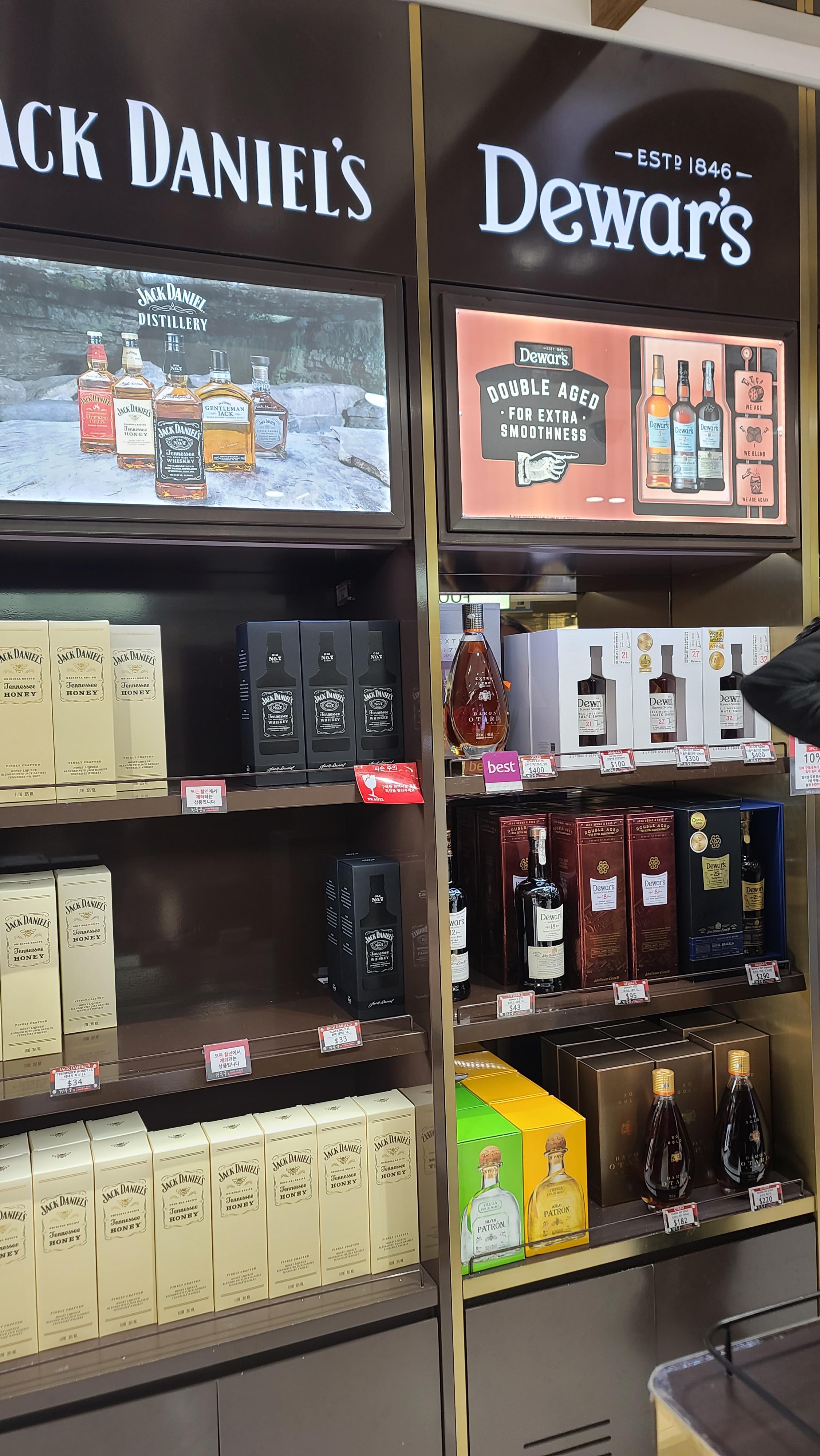 측면 주류매대를 살펴보니 잭다니엘 넘버7, 잭다니엘 허니 제품이 보이고 옆으로는 오타드 코냑과 패트론 데킬라의 모습이 보이고 있습니다. 싱글몰트 위스키인 듀워 제품도 보이는 것으로 보아 회사별로 나눠놓은 것이 라고 생각되는 구성입니다.