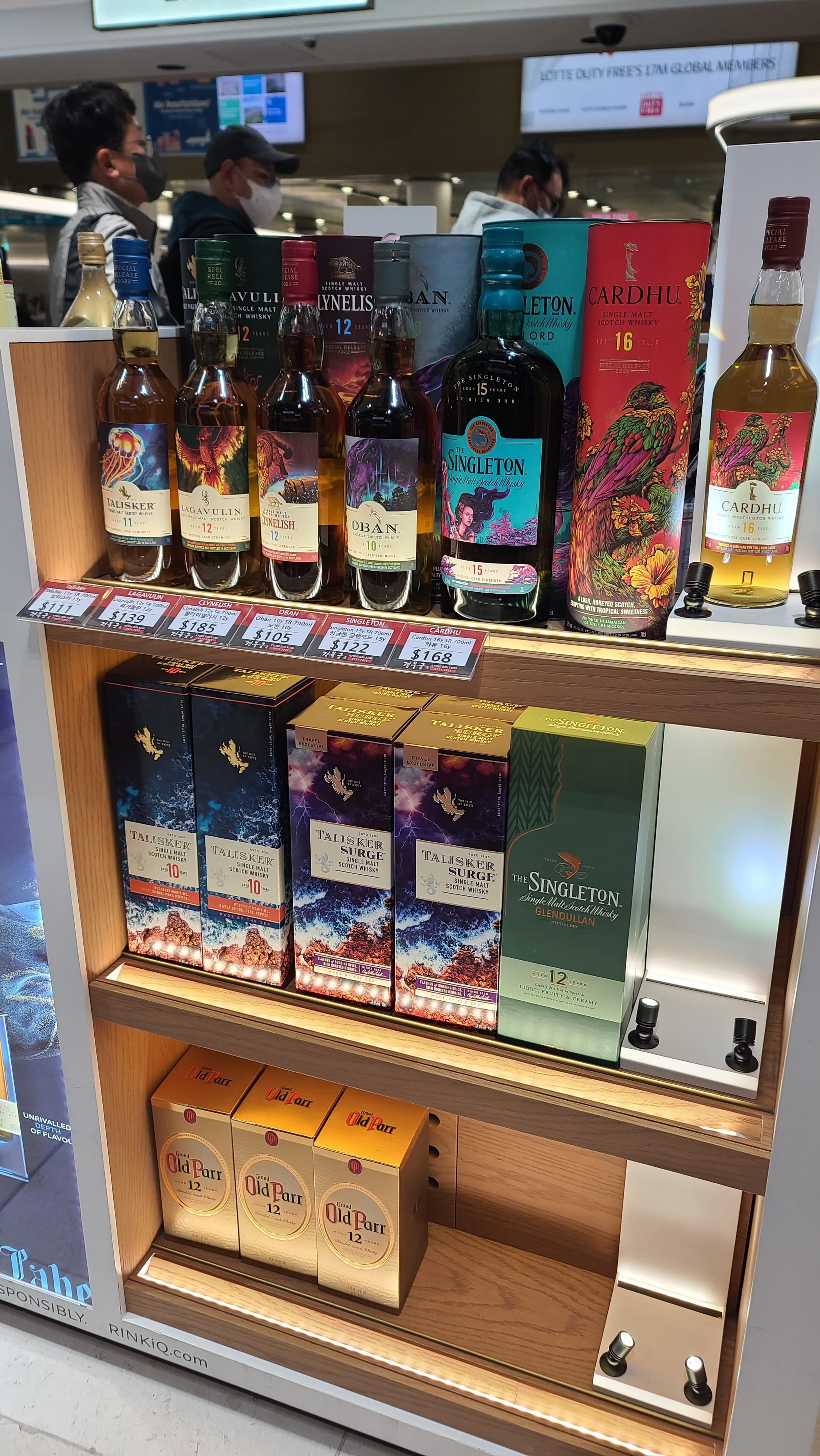 계속 되는 디아지오의 단독매대 조니워커의 핵심원액 싱글몰트 시리즈 탈리스커 11년, 라가불린12년, 오반 10년, 클라이넬리시12년 그리고 카듀 16년 까지 보기힘든 싱글몰트 위스키들이 한정판으로 모여있는 모습이 구매욕을 자극 하고 있습니다.