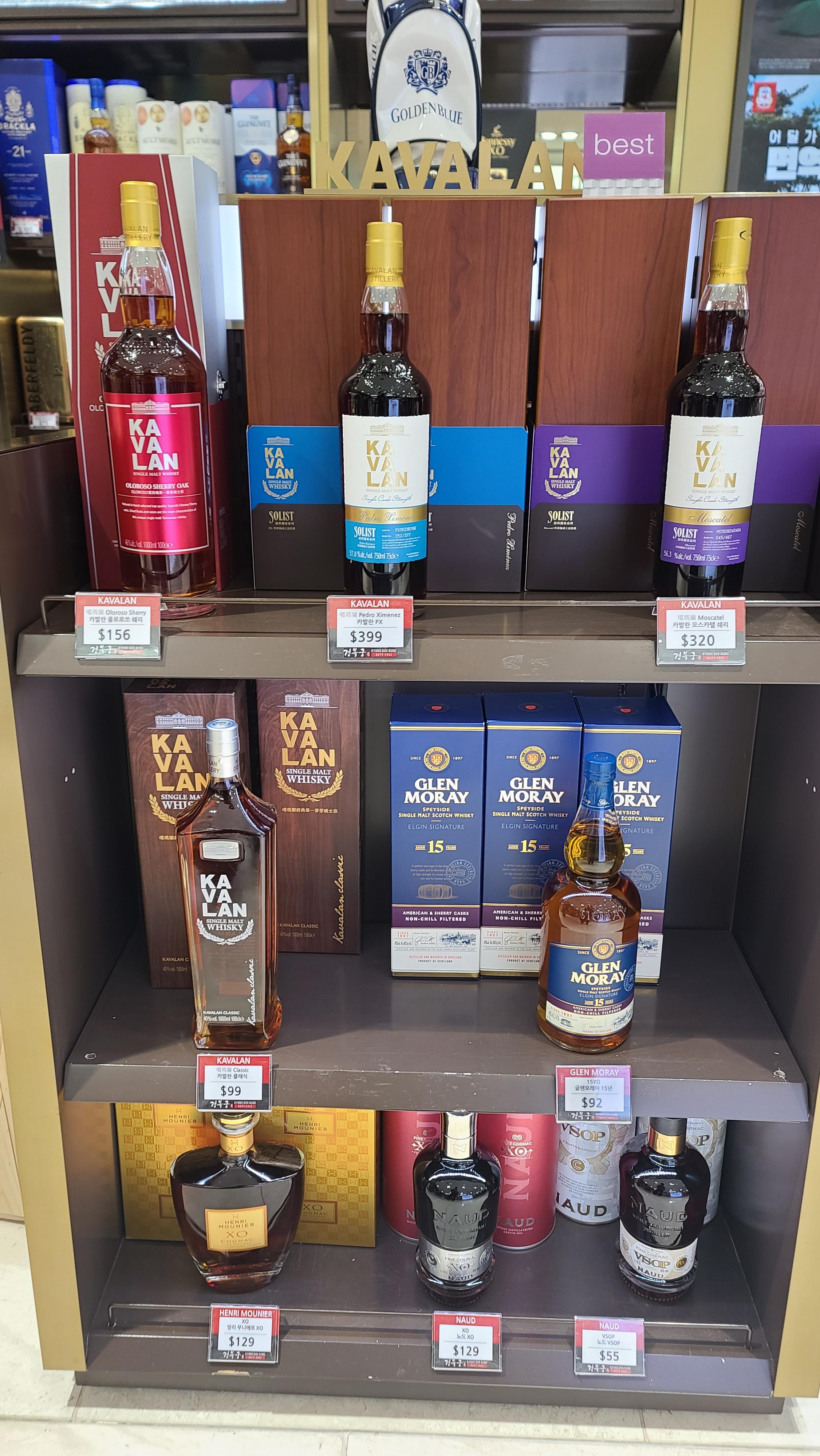 다시 가운데 요즘 핫하다는 카발린 위스키를 필두로, 글렌 마레이 위스키가 나란히 진열되어 있으며, 앙리 무니에르, 노드 코냑 제품이 아름다운 자태를 뽑내며 아래쪽에 진열되어 있습니다.